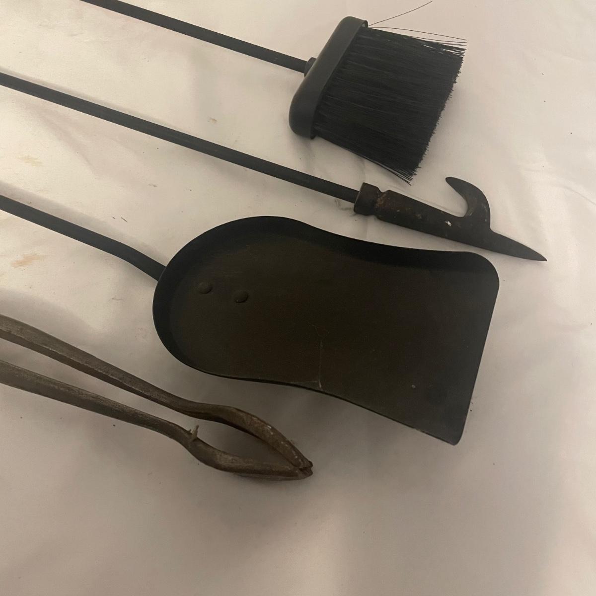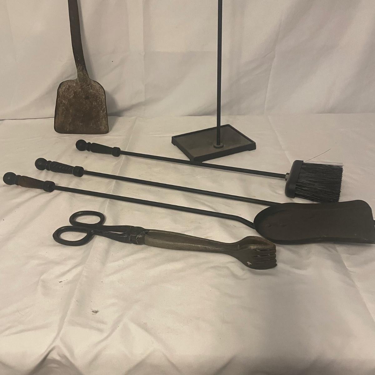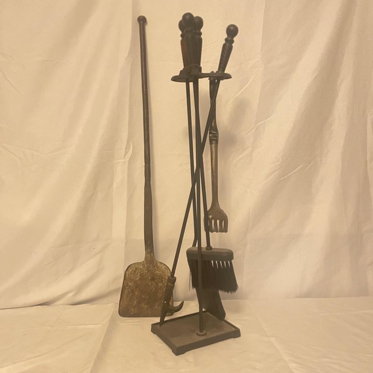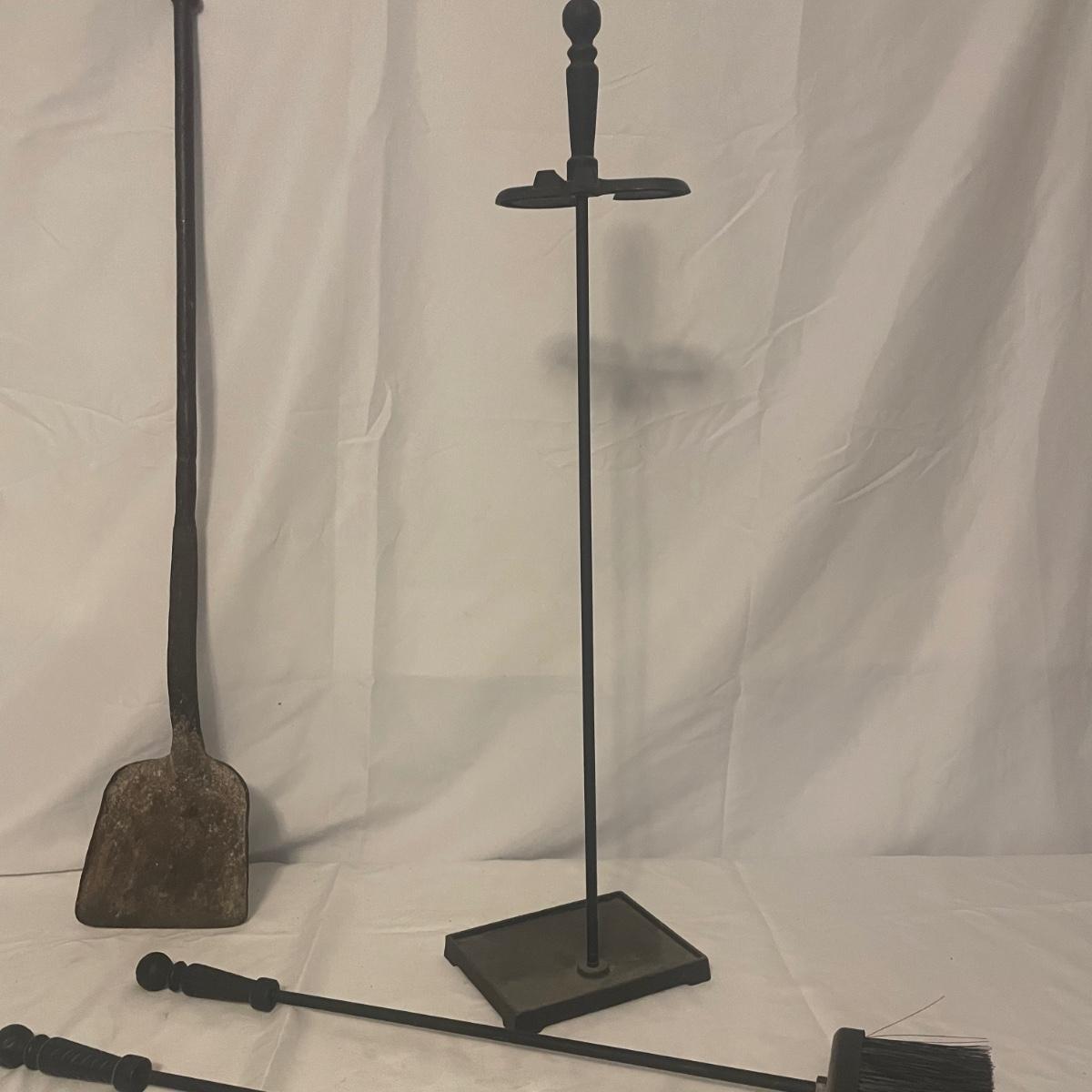 This iron fireplace tool holder comes with 4 tools and there is also a heavy iron shovel with a long handle that measures 31” long. All items are in good condition, although the shovel is quite used.