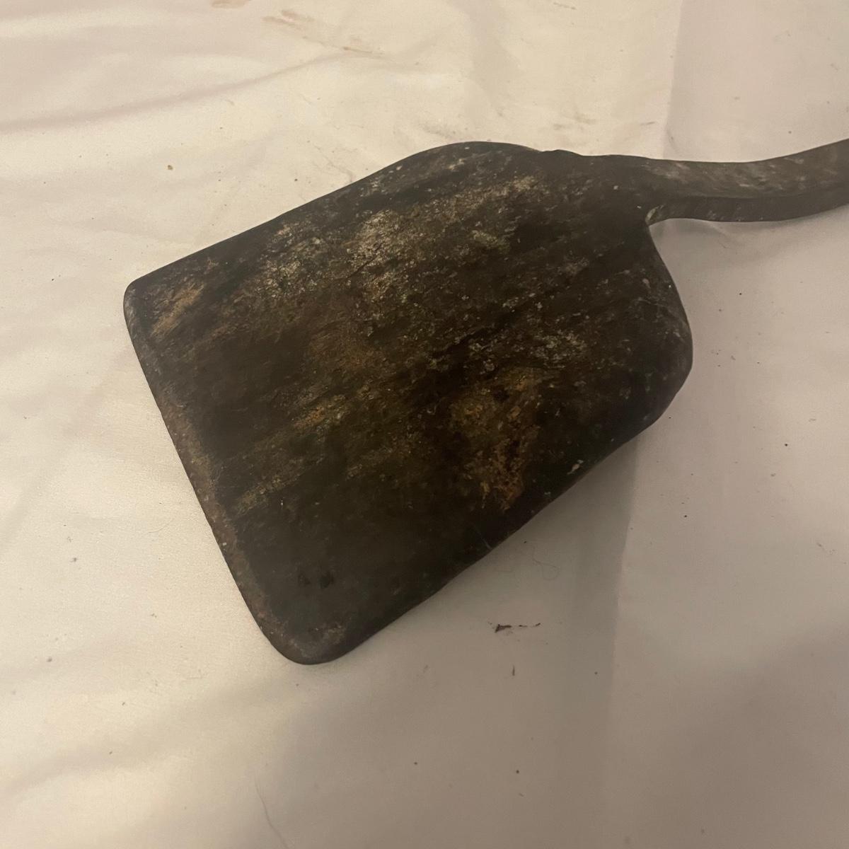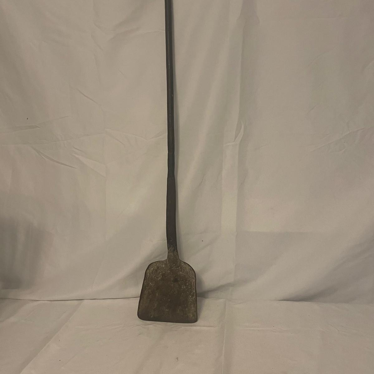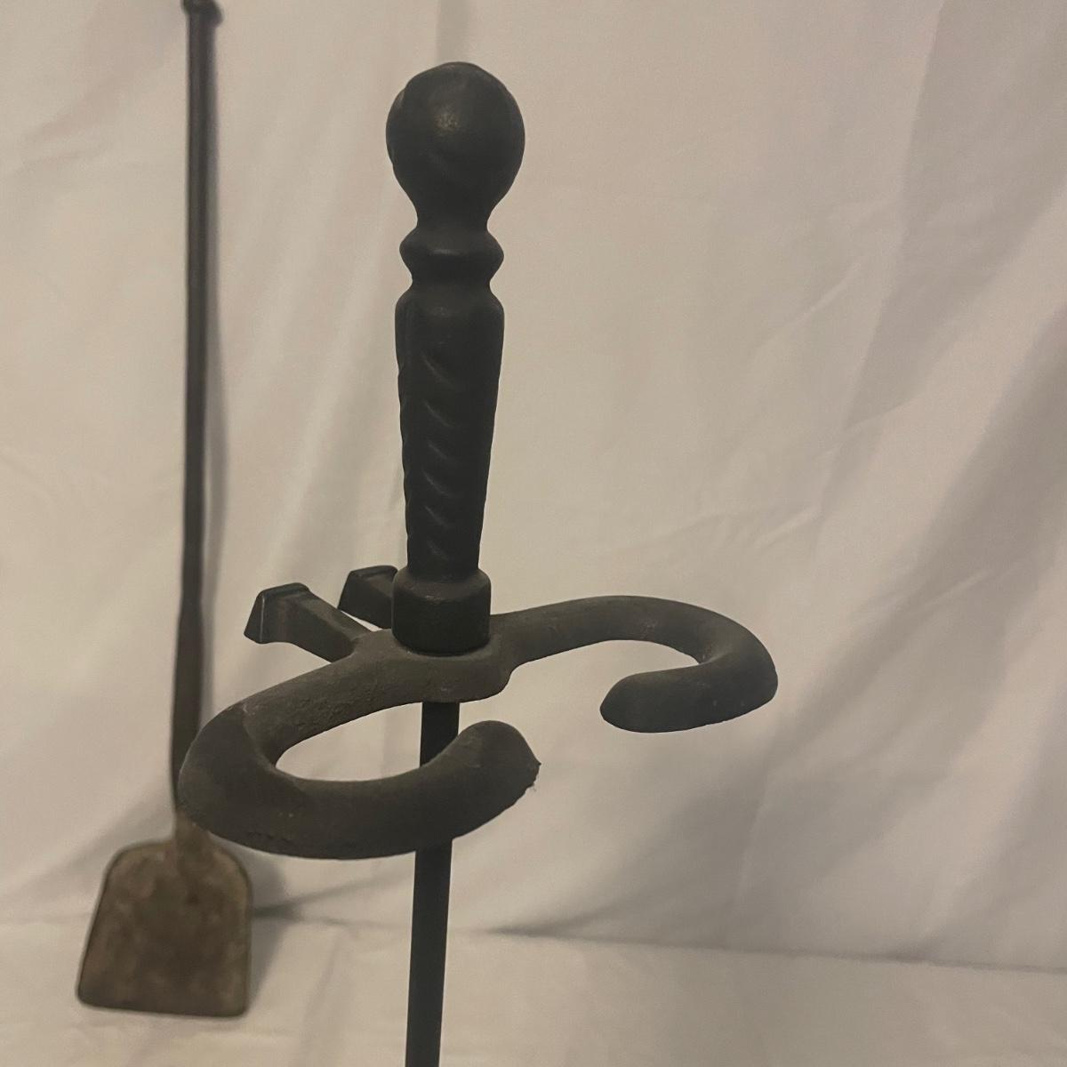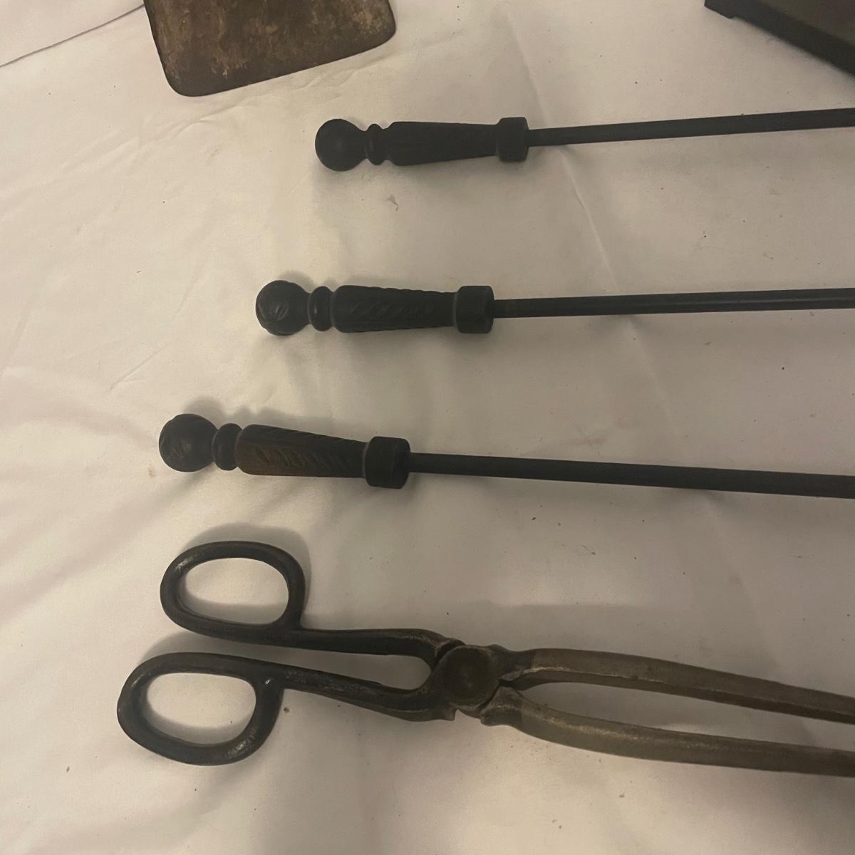 This iron fireplace tool holder comes with 4 tools and there is also a heavy iron shovel with a long handle that measures 31” long. All items are in good condition, although the shovel is quite used.