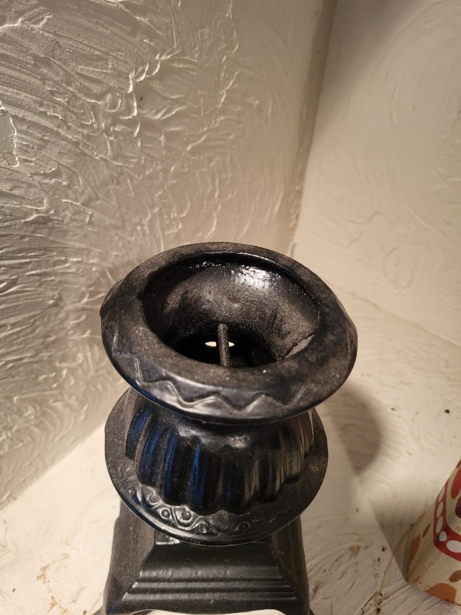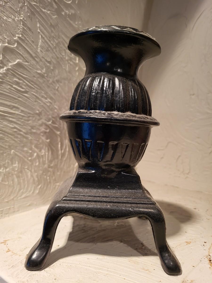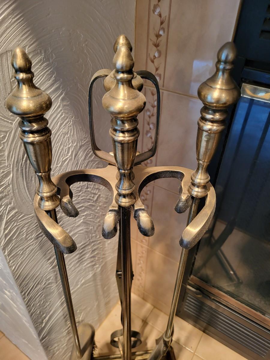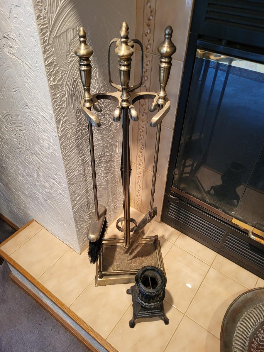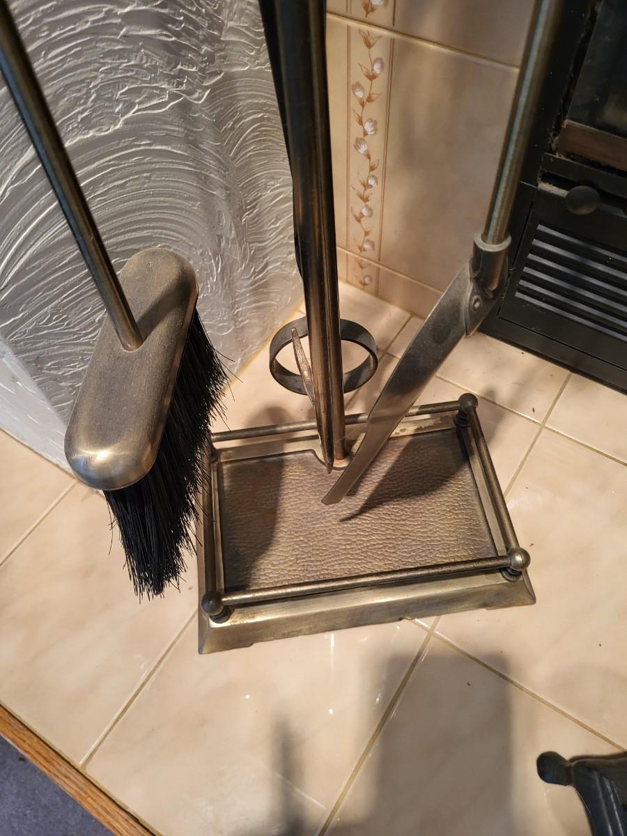 FIREPLACE TOOLS IN A HOLDER AND A CAST IRON WOOD STOVE REPLICA