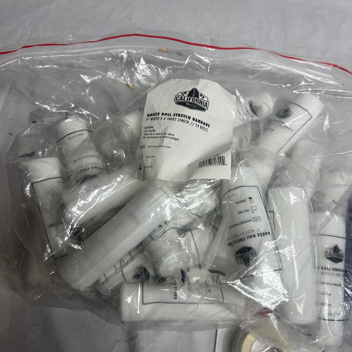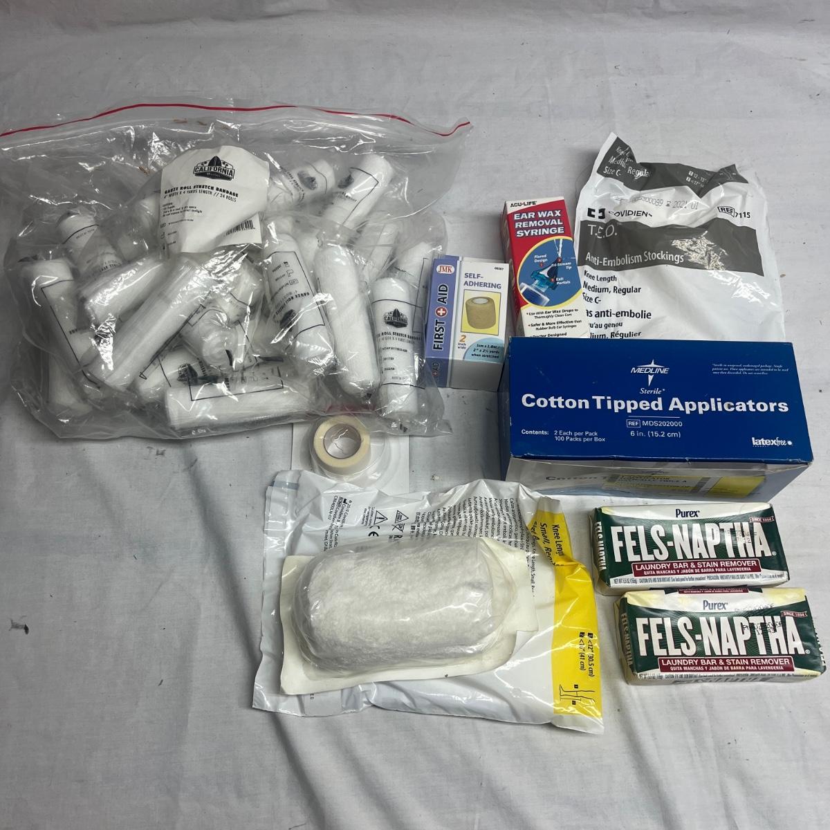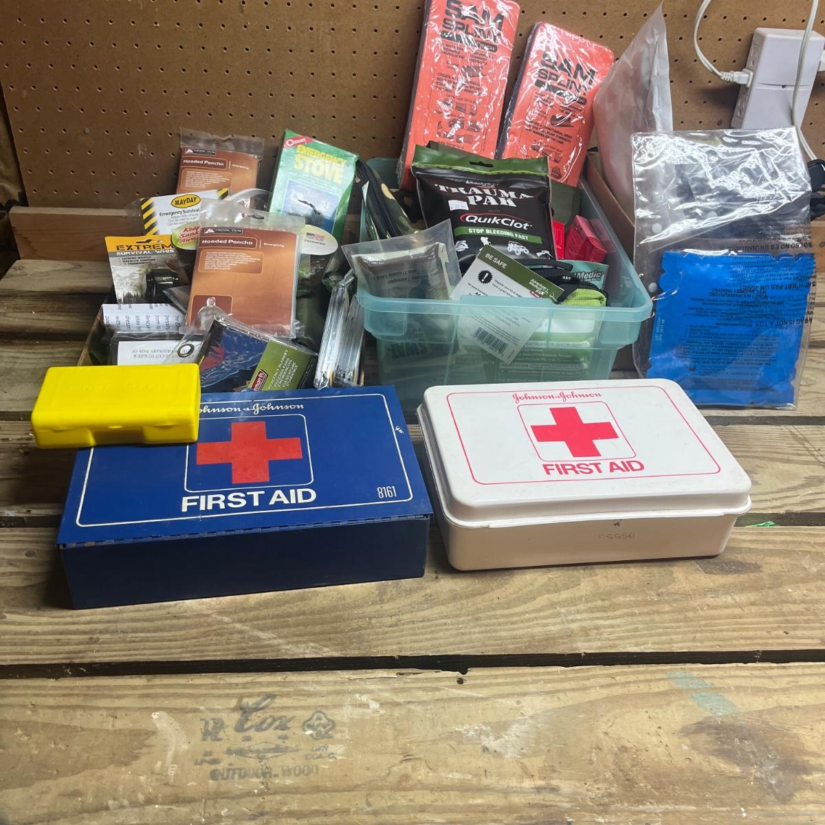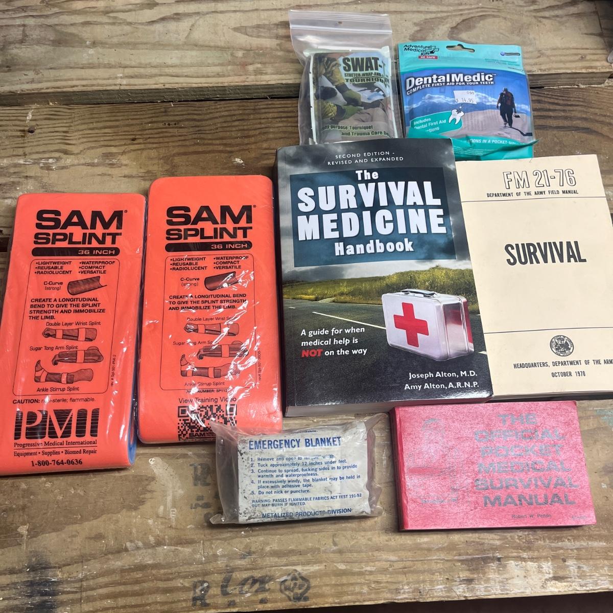 Lot contains a large supply of first aid supplies including tourniquets, bandages, books, snake repellent, emergency blankets, whistle, splints, gauze, laundry bar and more.