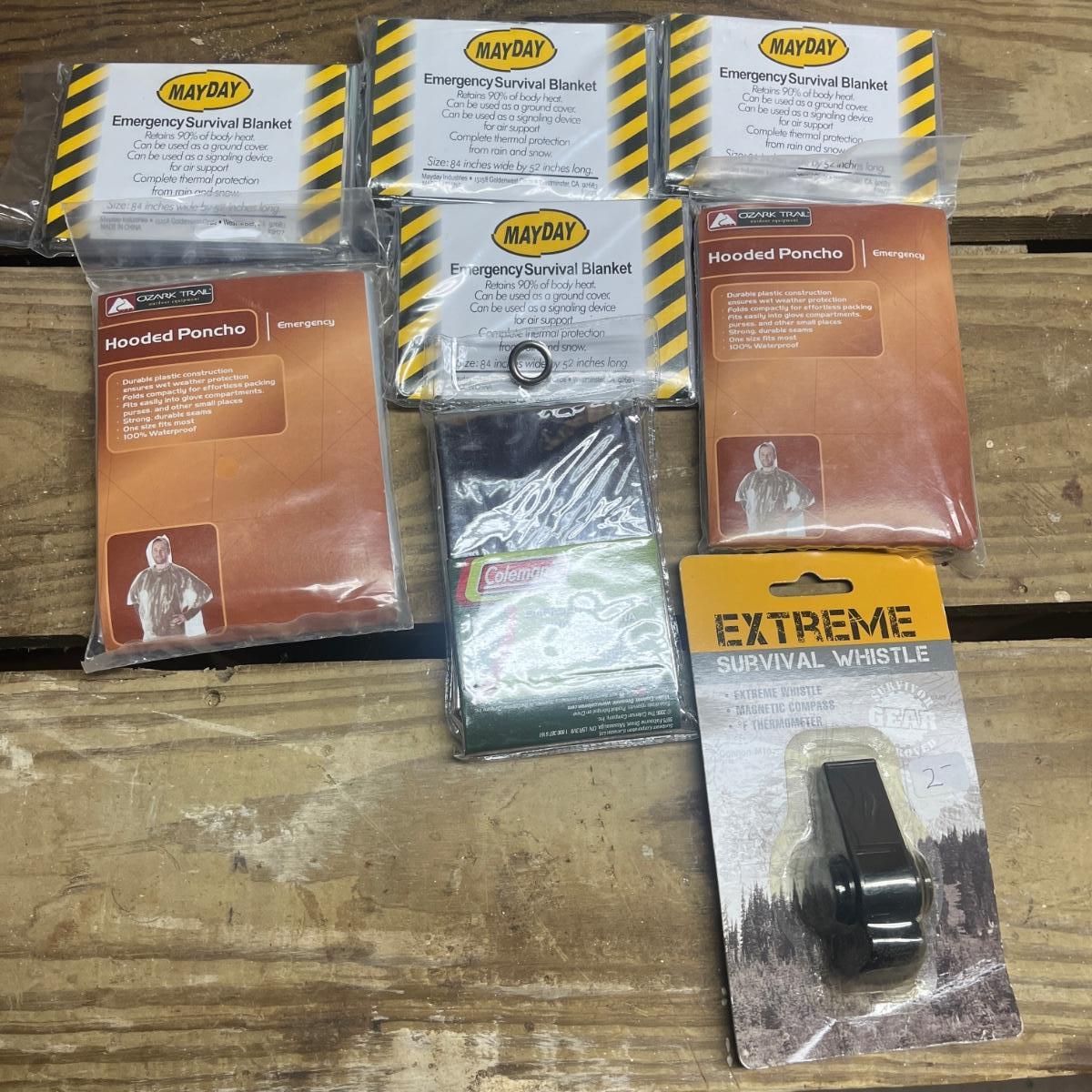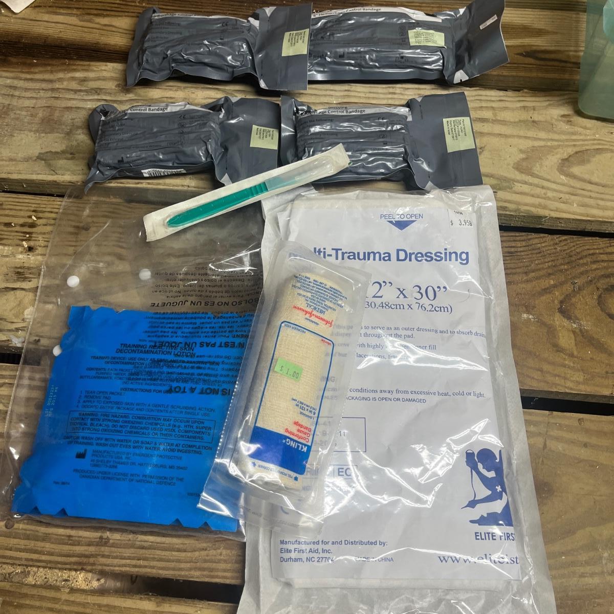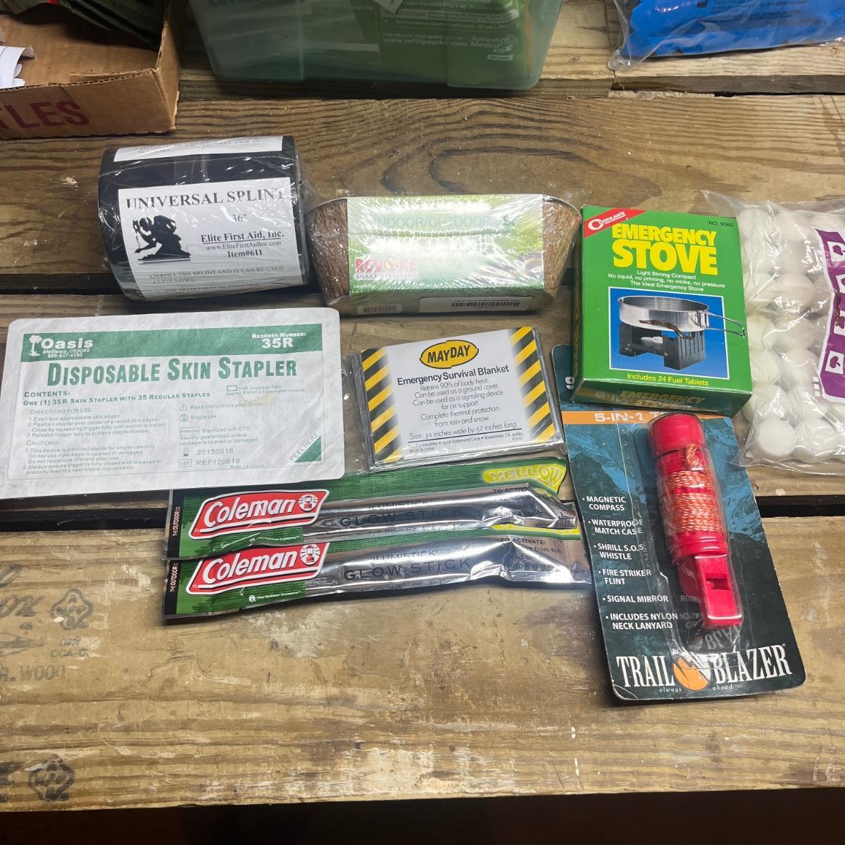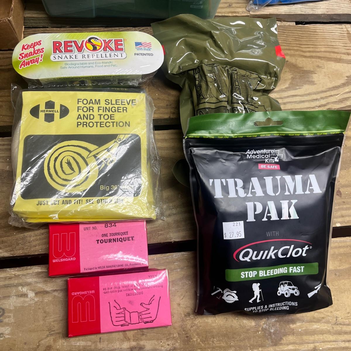 Lot contains a large supply of first aid supplies including tourniquets, bandages, books, snake repellent, emergency blankets, whistle, splints, gauze, laundry bar and more.