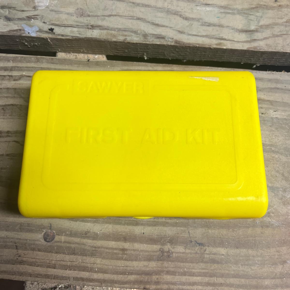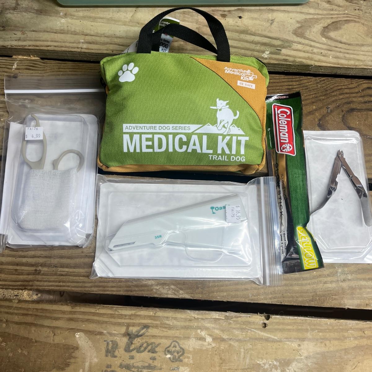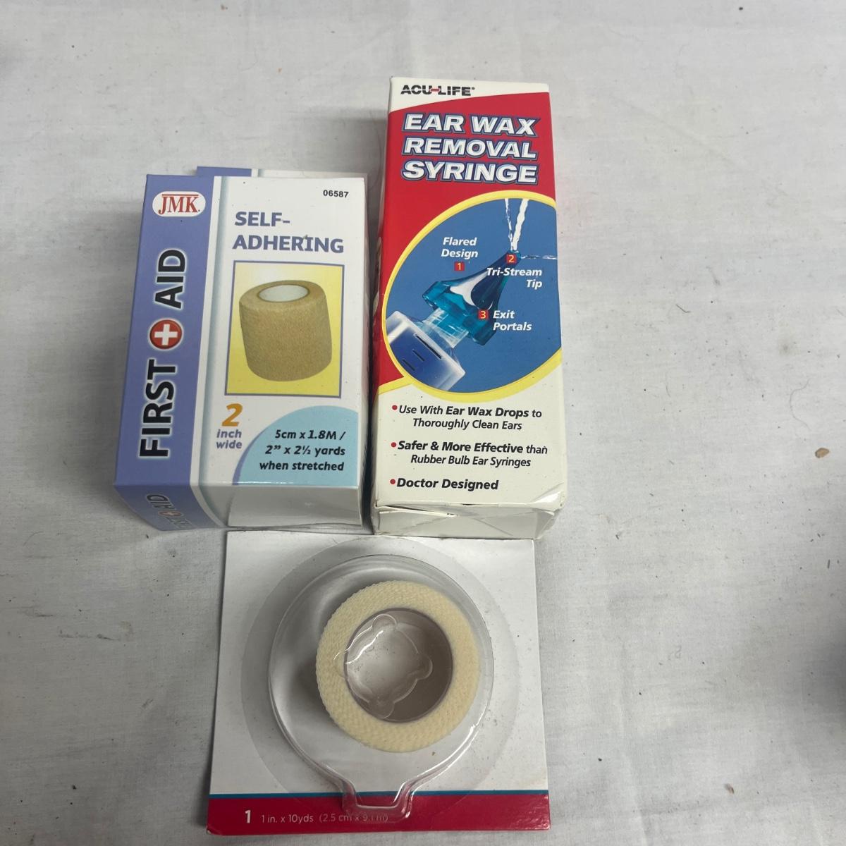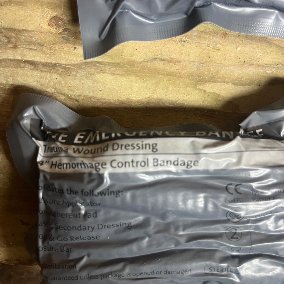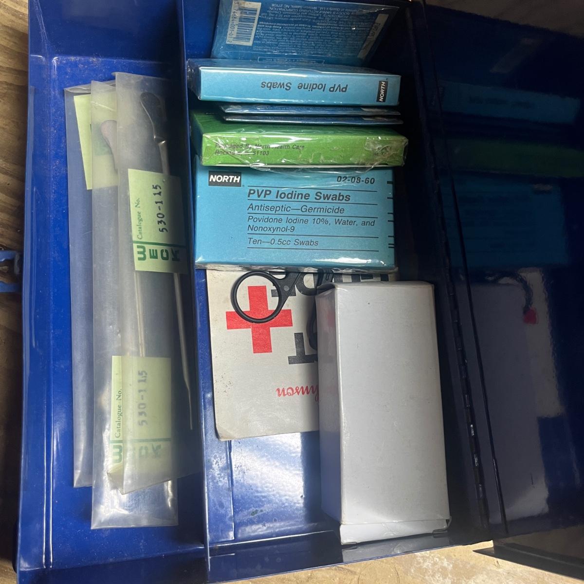 Lot contains a large supply of first aid supplies including tourniquets, bandages, books, snake repellent, emergency blankets, whistle, splints, gauze, laundry bar and more.