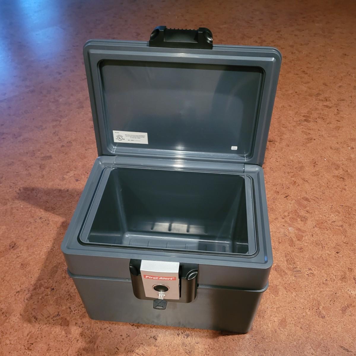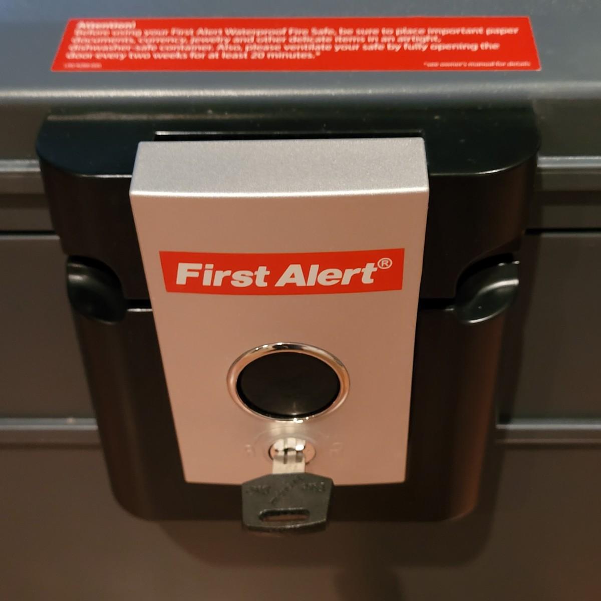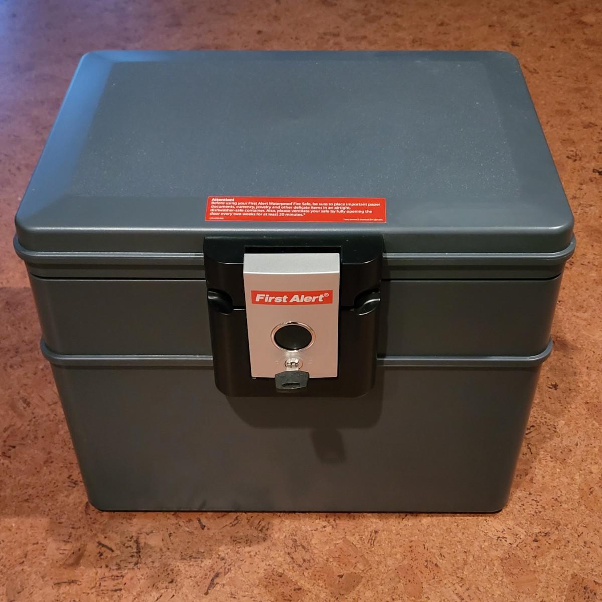 First Alert brand water and fire proof safe. designed to safeguard documents and valuables from fire and water damage. It has a 0.62 cubic feet capacity and is ideal for storing letter-size hanging file folders flat. It features a clamping-style latch with a key lock for security; one key is included. Safe measures 16" x 15" x 13.5"H.