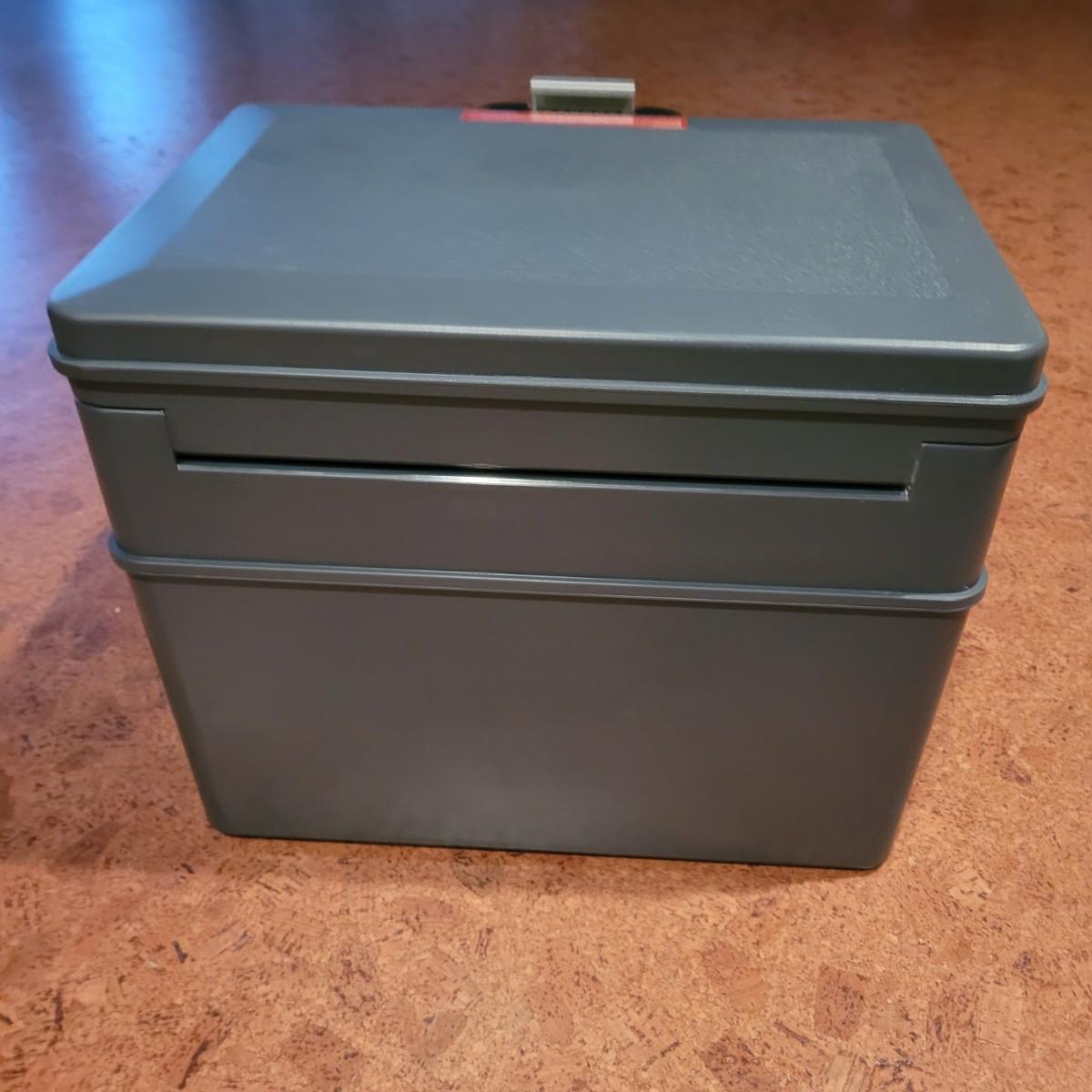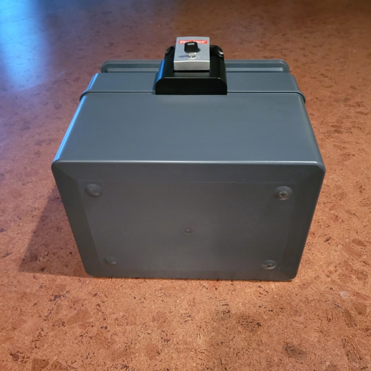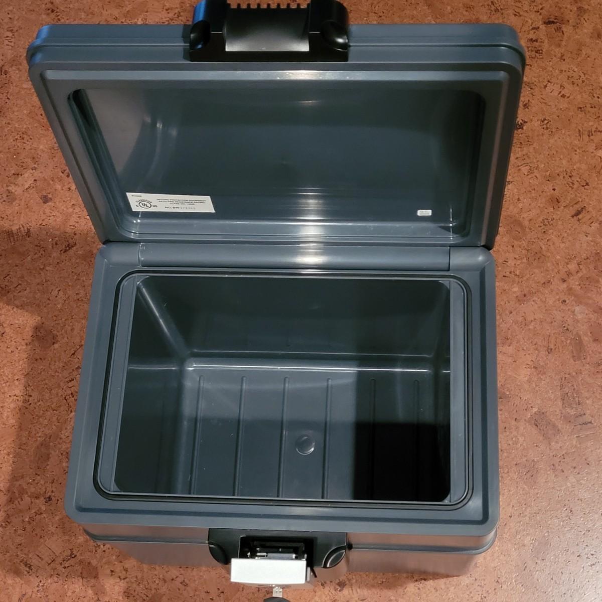 First Alert brand water and fire proof safe. designed to safeguard documents and valuables from fire and water damage. It has a 0.62 cubic feet capacity and is ideal for storing letter-size hanging file folders flat. It features a clamping-style latch with a key lock for security; one key is included. Safe measures 16" x 15" x 13.5"H.