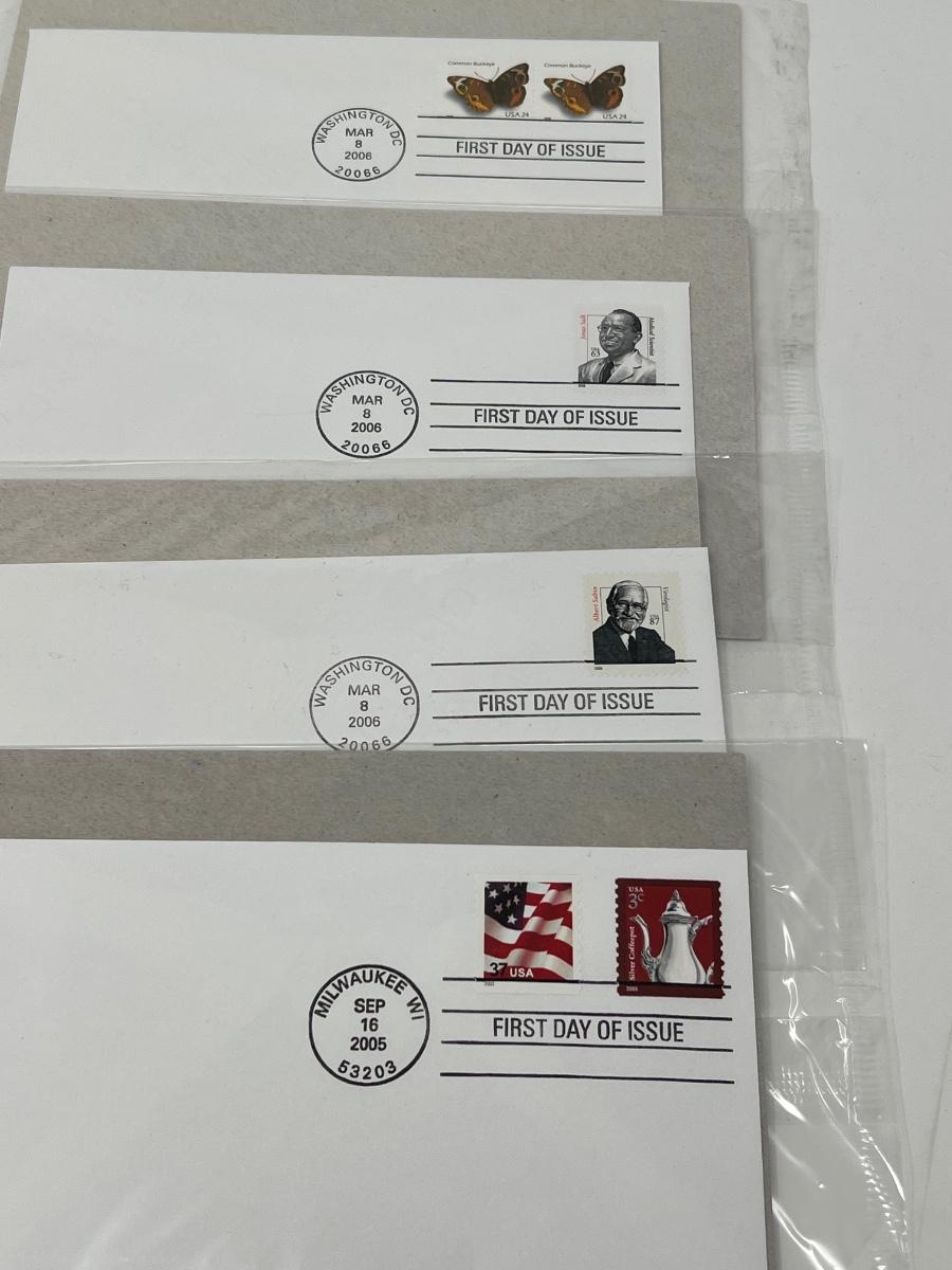 First Day of Issue: Common Buckeye, Dr. Salk, Dr.Sabin, Silver Coffee Pot and unopened Antique Toys. Box of collected International stamps - Germany, Australia, England and much more.
