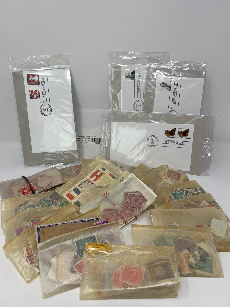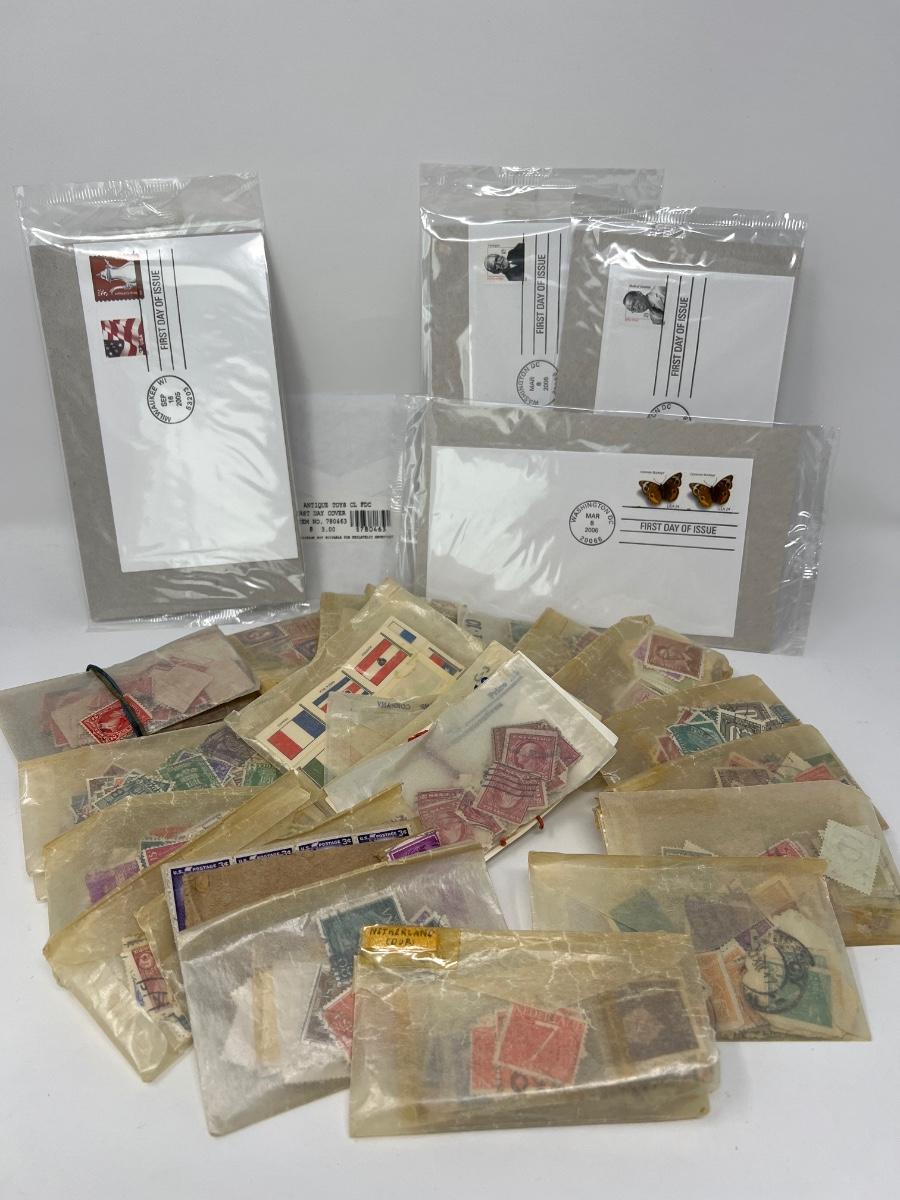 First Day of Issue Stamps & Box of International Stamps