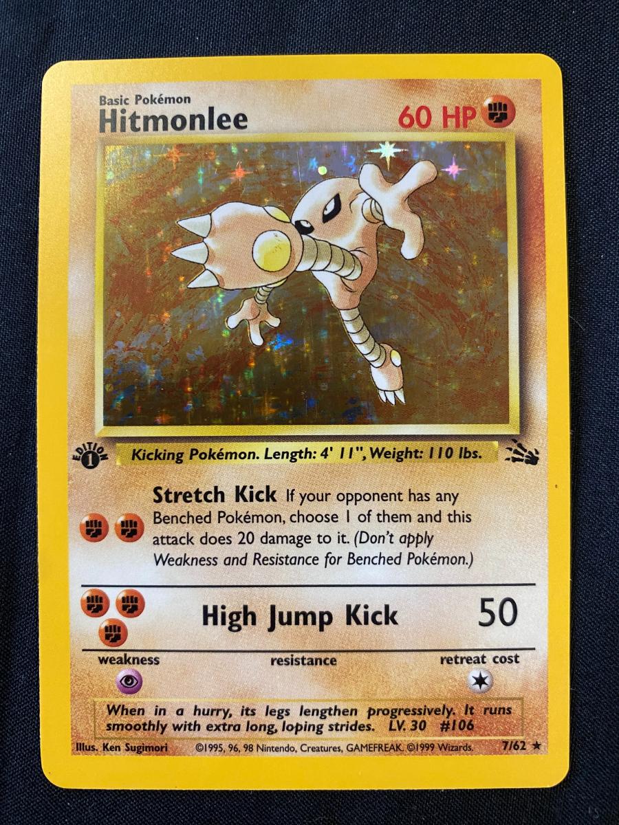 This is a first edition holographic Hitmonlee card from the Pokémon Trading Card Game. The card originates from the Fossil set and is numbered 7/62. It is in light play condition, showing some signs of prior use but remains intact and collectible. The card features a 60 HP basic Pokémon with Stretch Kick and High Jump Kick moves.