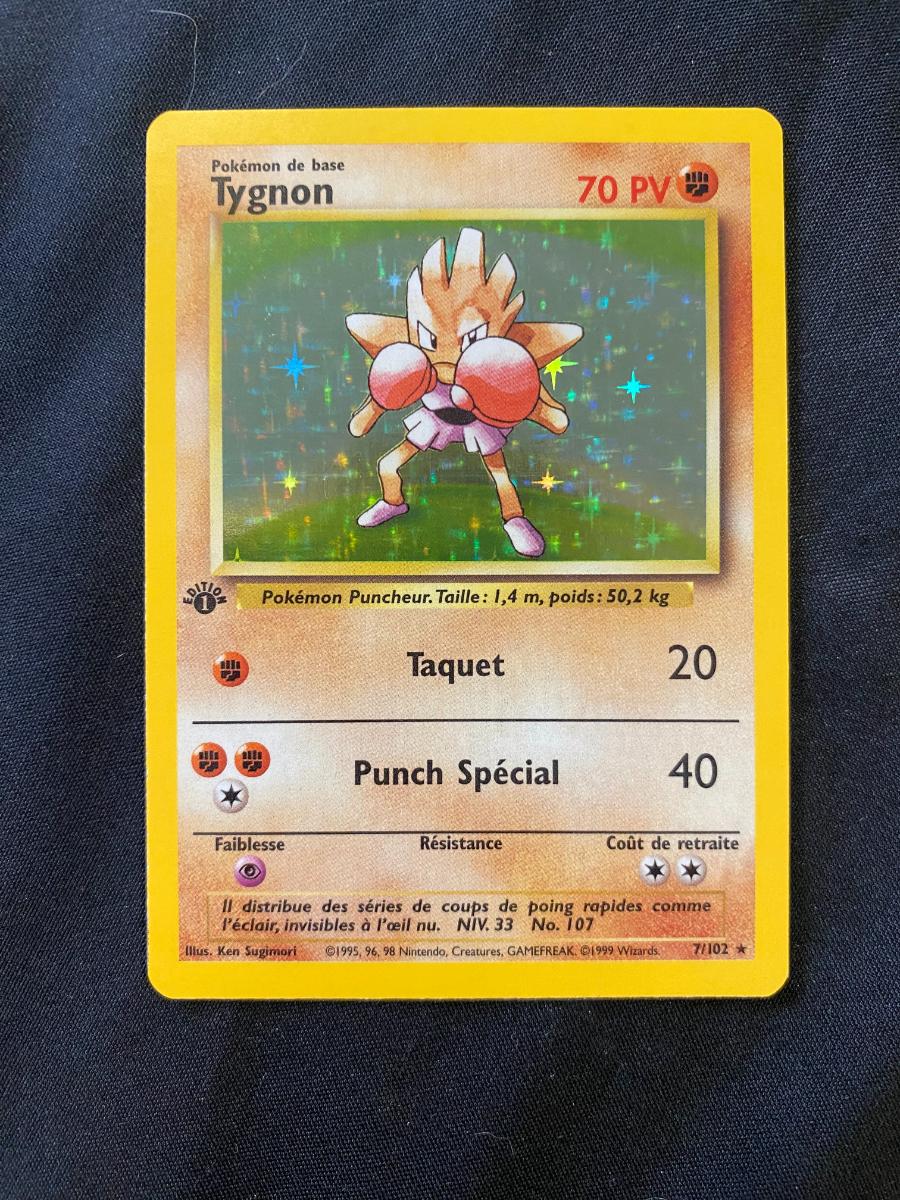 Pokemon card featuring Tygnon, a holographic (holo) first edition card. Released as part of the early base set series. Text in French. Condition is marked as light play, indicating minor wear from handling. The card displays holographic elements with distinct details.