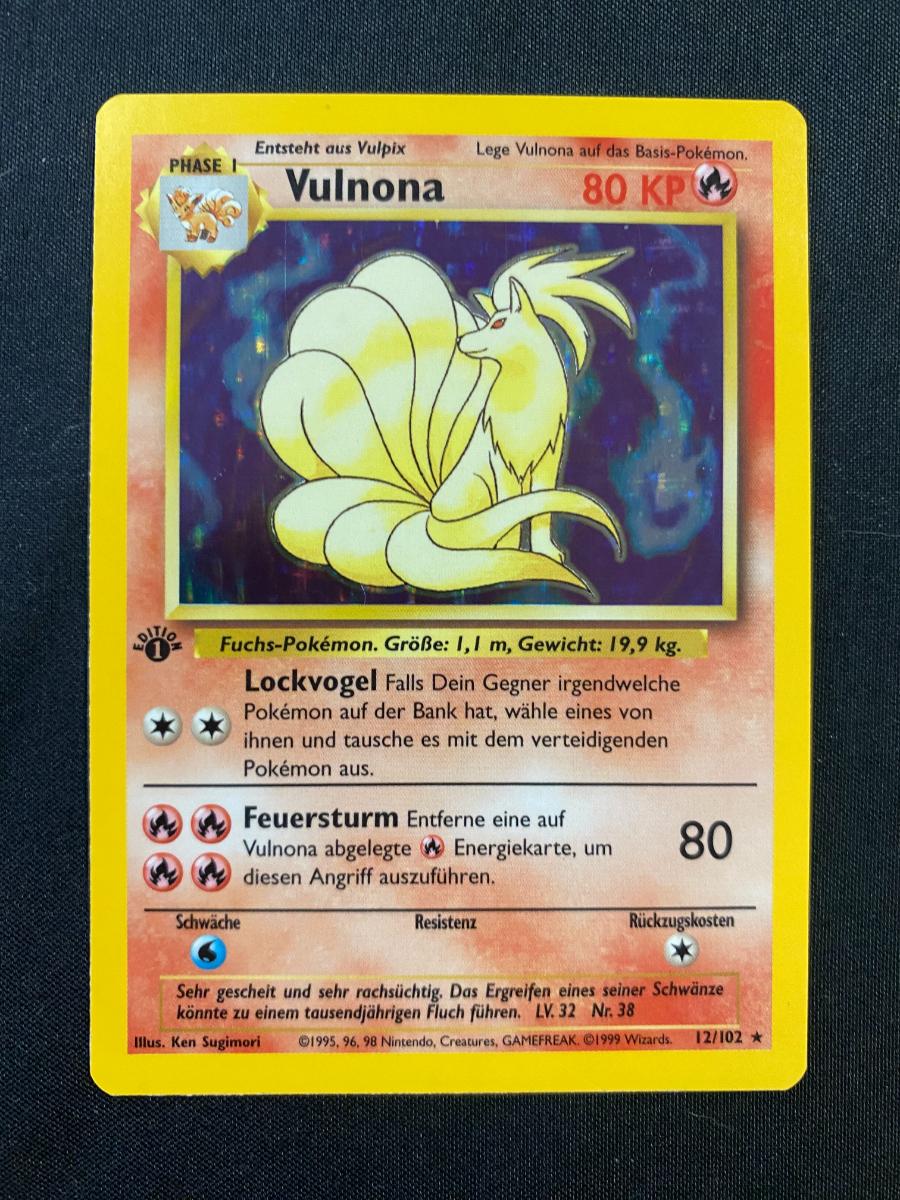 Pokemon First Edition Holo Ninetales (Vulnona) card, 1999 Base Set, printed in German. Condition is light play. Features holographic foil artwork. Card number 12/102. This collectible is an original first edition issue with distinct markings denoting its rarity and authenticity.