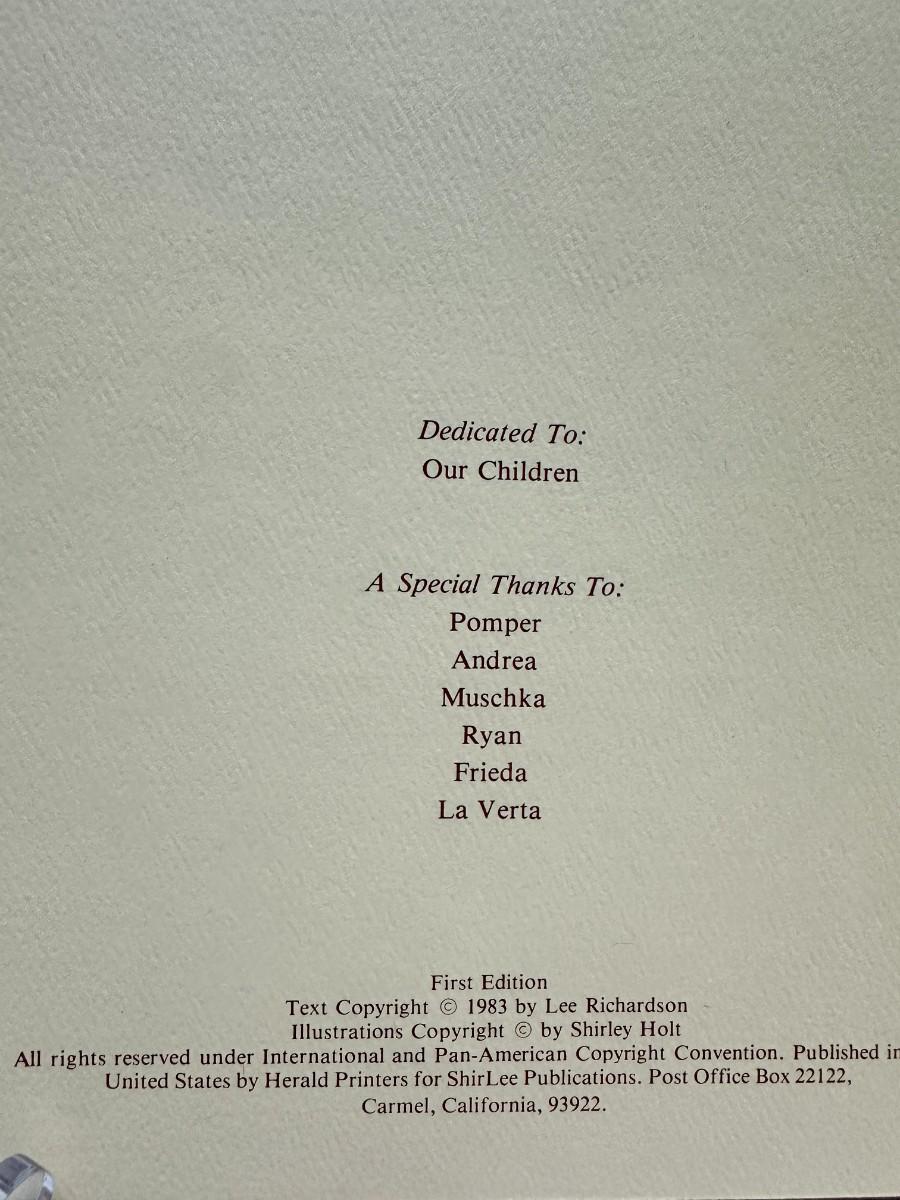 1983 First Edition of Sophie's Suprise by Shirley Holt and Lee Richardson. Book is signed by famed illustrator and artist Shirley Holt (1932-2021) Extra bonus is the page from the newspaper announcing the book signing event.