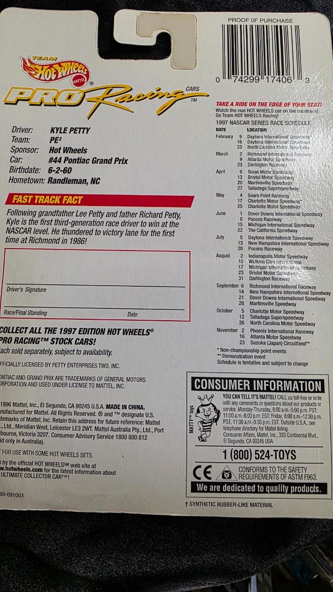 This diecast masterpiece captures it all: the aerodynamic curves of the Pontiac, the #44 emblazoned in bold white, Goodyear tires wrapped in deluxe rubber for that authentic grip, and a detailed interior where you can almost feel the G-forces. Factory-sealed in its original blister pack, the card bursting with the '97 Winston Cup schedule and Petty family facts, ready to unbox decades of high-octane drama.
