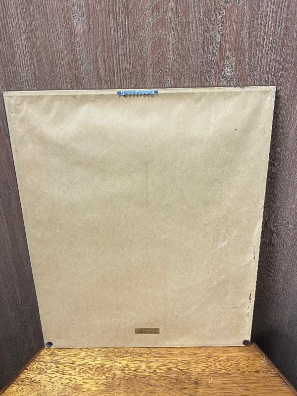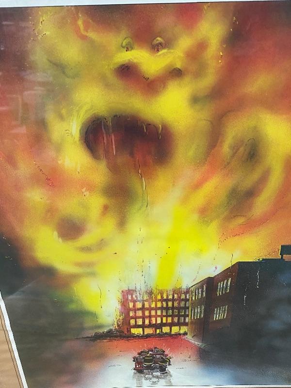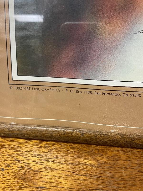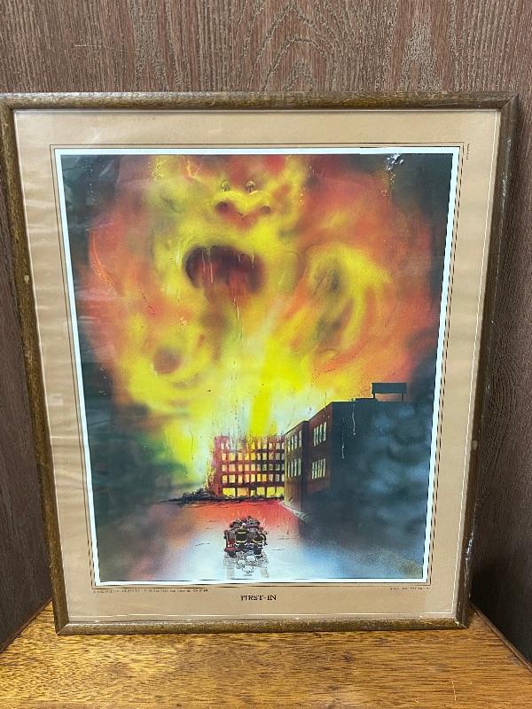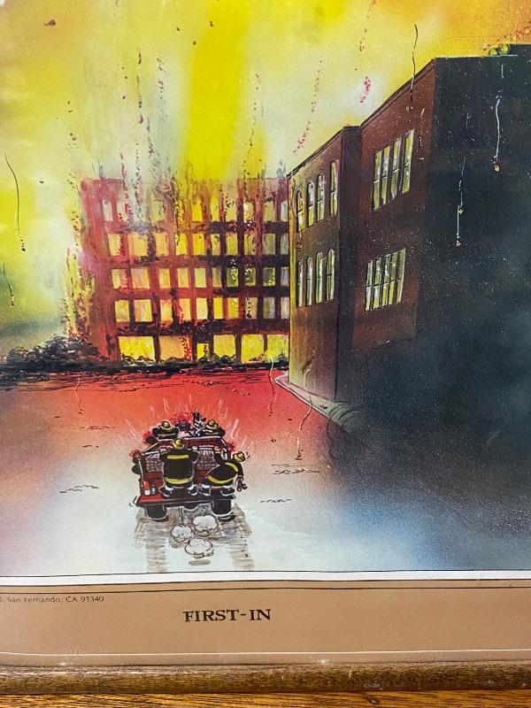 Firefighter inspired print titled "First In". Made in 1982 by Fire Line Graphics. Shows a firetruck headed towards a monster like fire. Framed roughly 16x20.