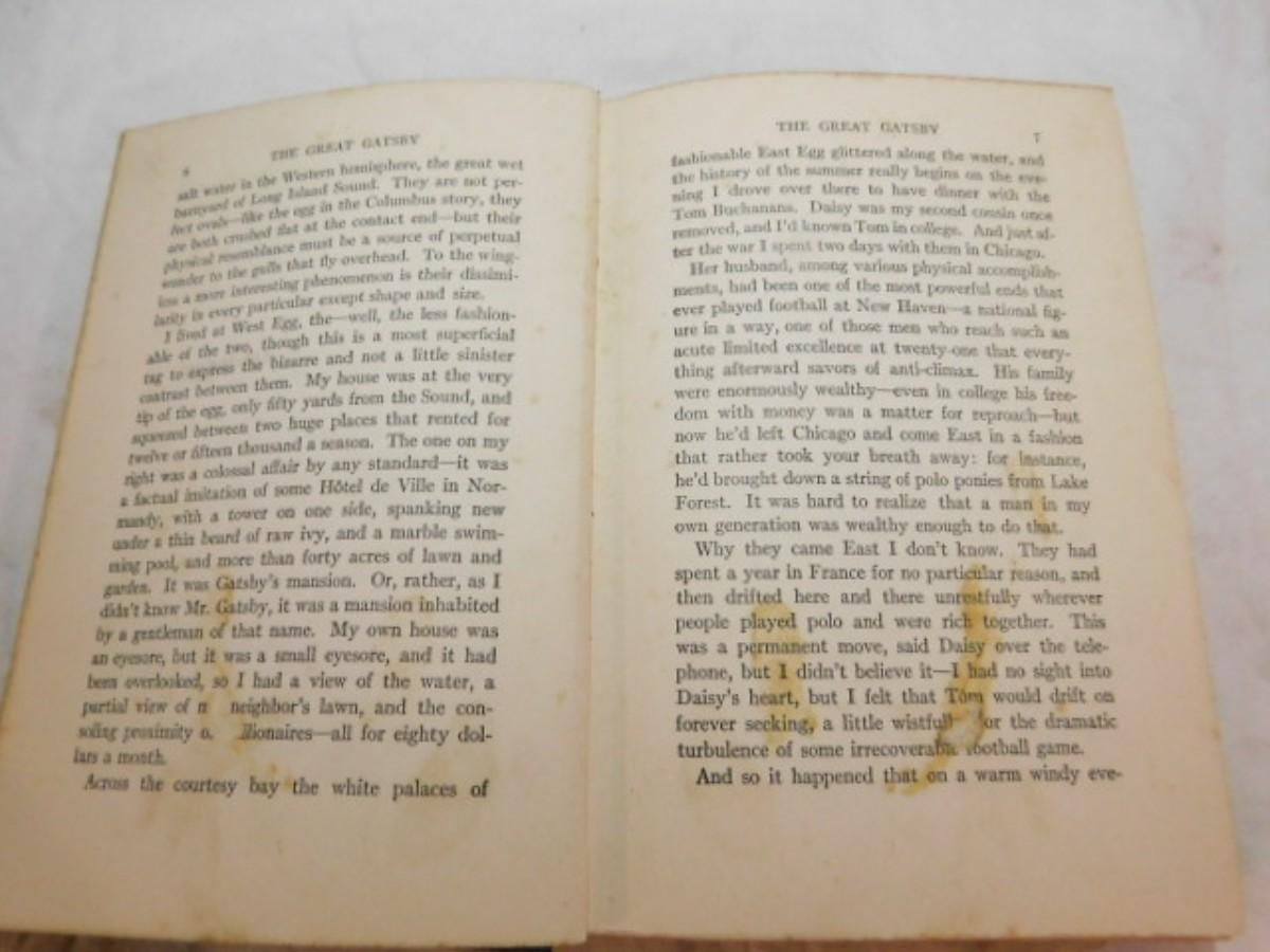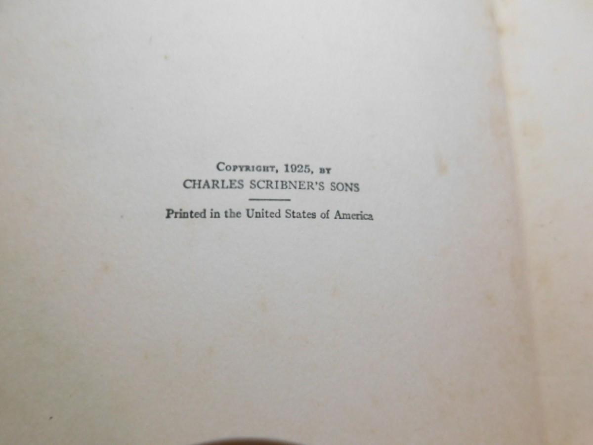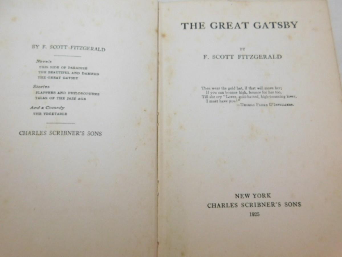 First Issue "The Great Gatsby" by F. Scot Fitzgerald Published 1925 Charles Schribner's Sons, NY has some staining on pages as shown. No dust cover.