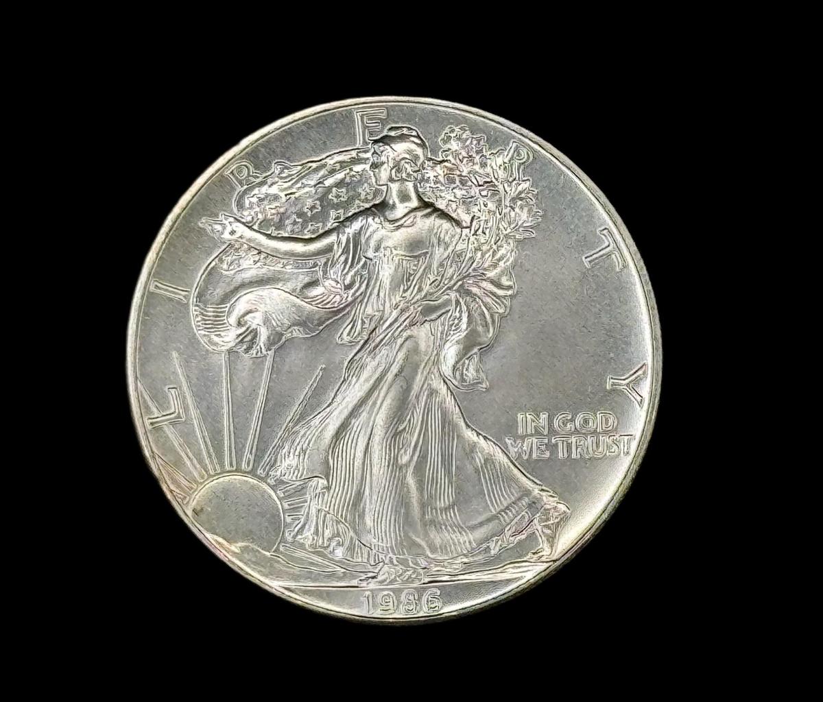 **WIRE TRANSFER IS REQUIRED IF SHIPPED.** 1986 was the first year the American Eagle was produced. This collectible example is believed to be uncirculated. Silver content is 90%. **ALL PRECIOUS METALS SALES ARE FINAL. NO REFUNDS WILL BE GIVEN FOR ANY REASON.** [AG]