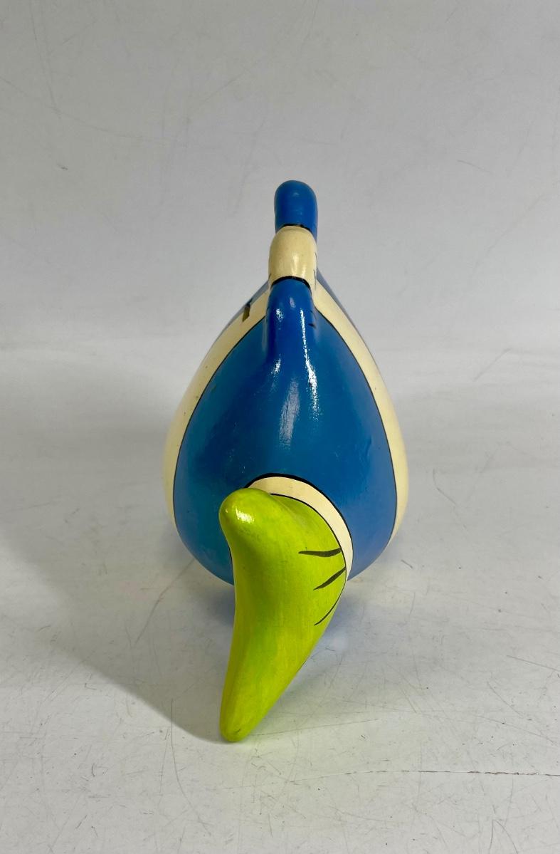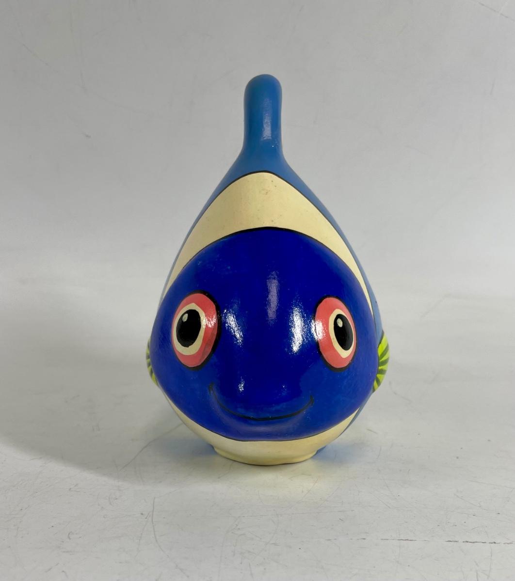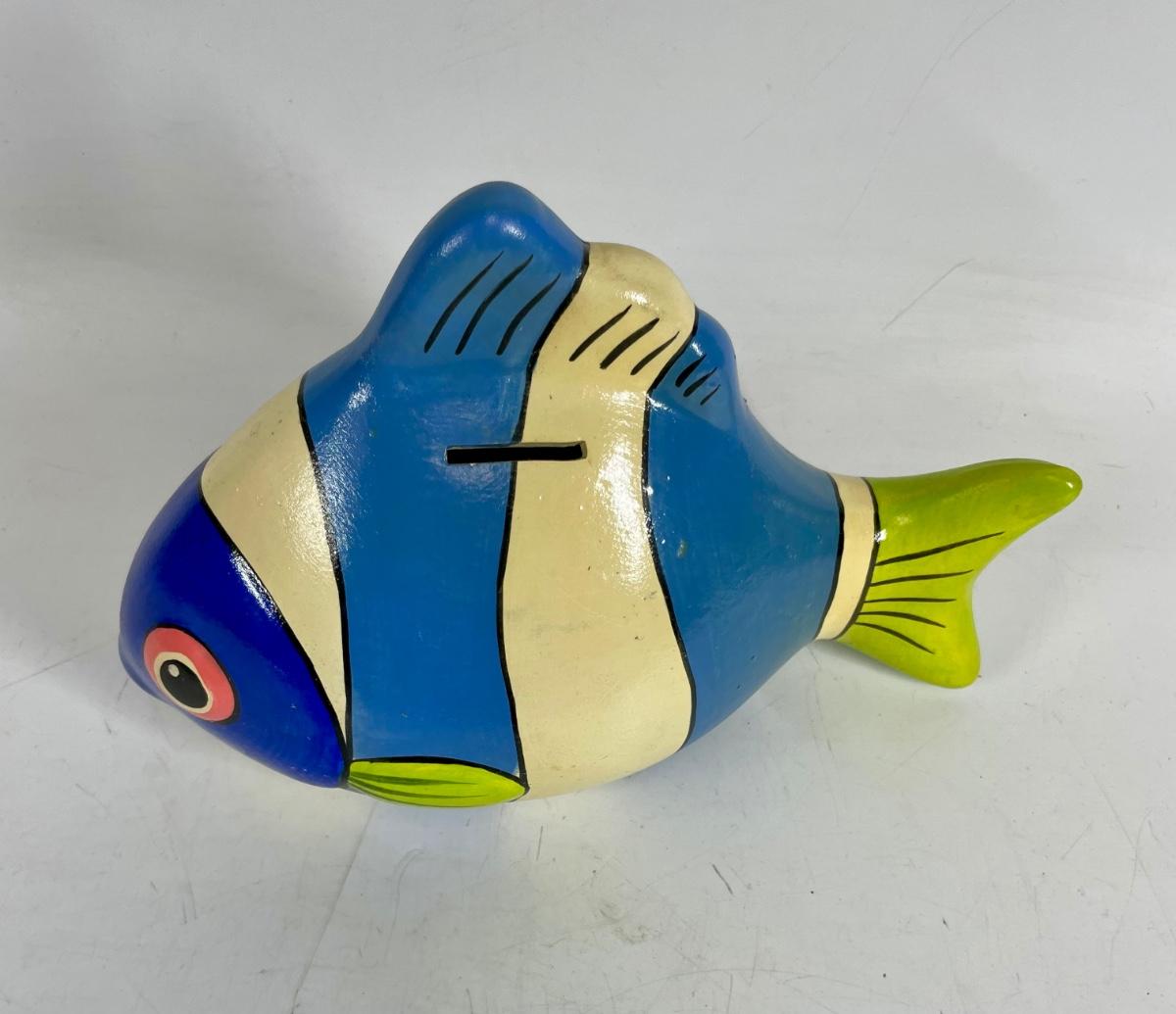 Painted, hard-plaster fish bank. Has plastic plug in bottom for coin removal. Approx 11” long.