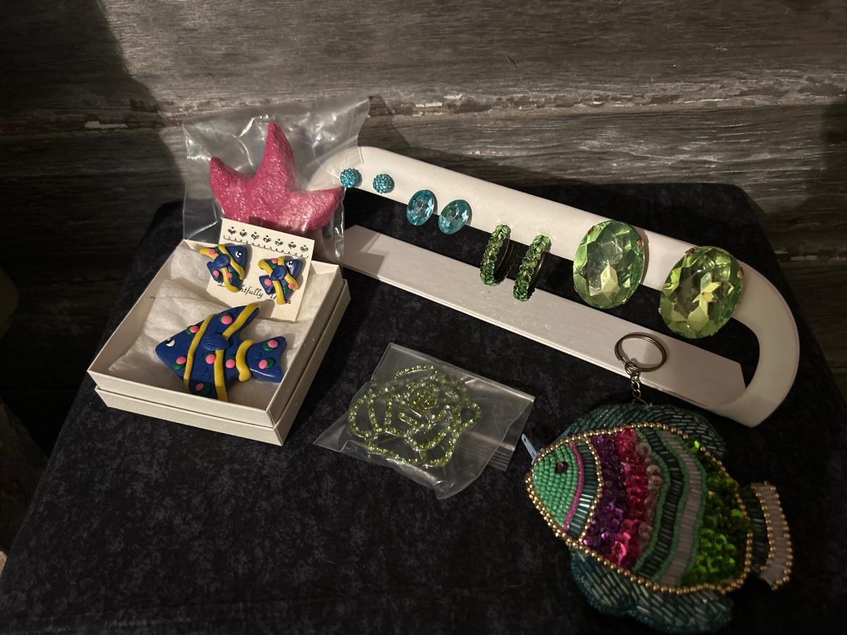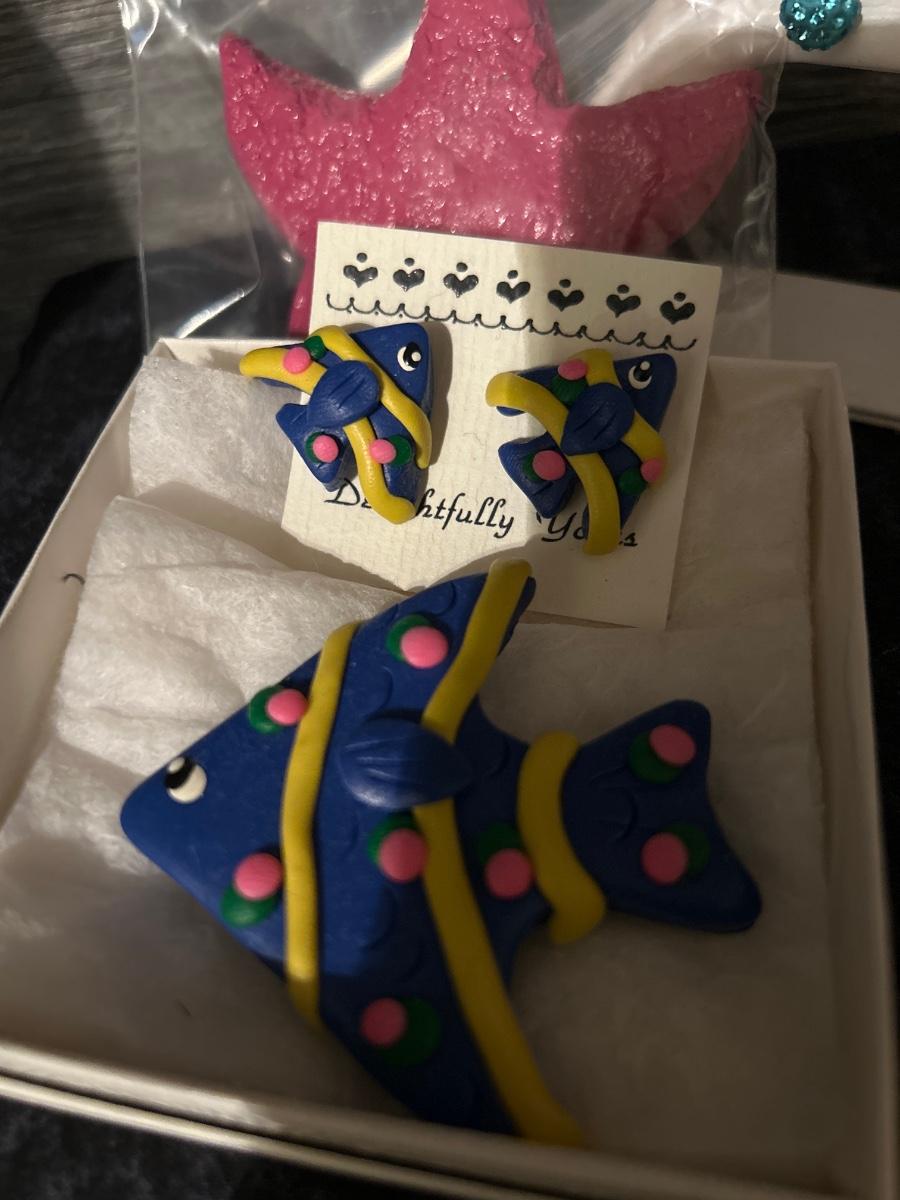 Fish coin purse, pin & earrings