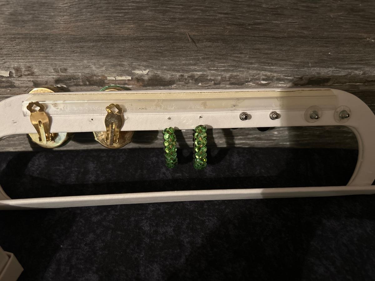 1 pair of clip ons & 3 pierced earrings, green hoops have no backs.