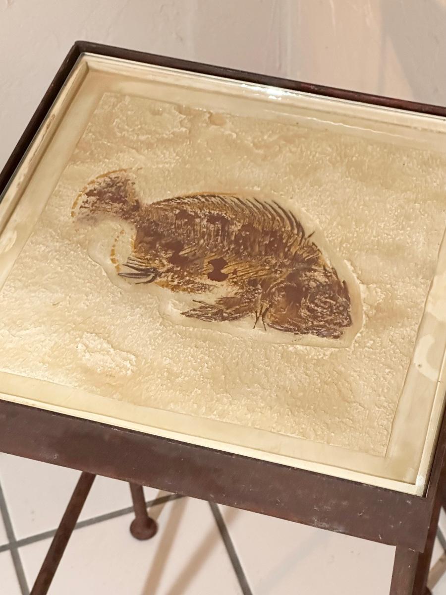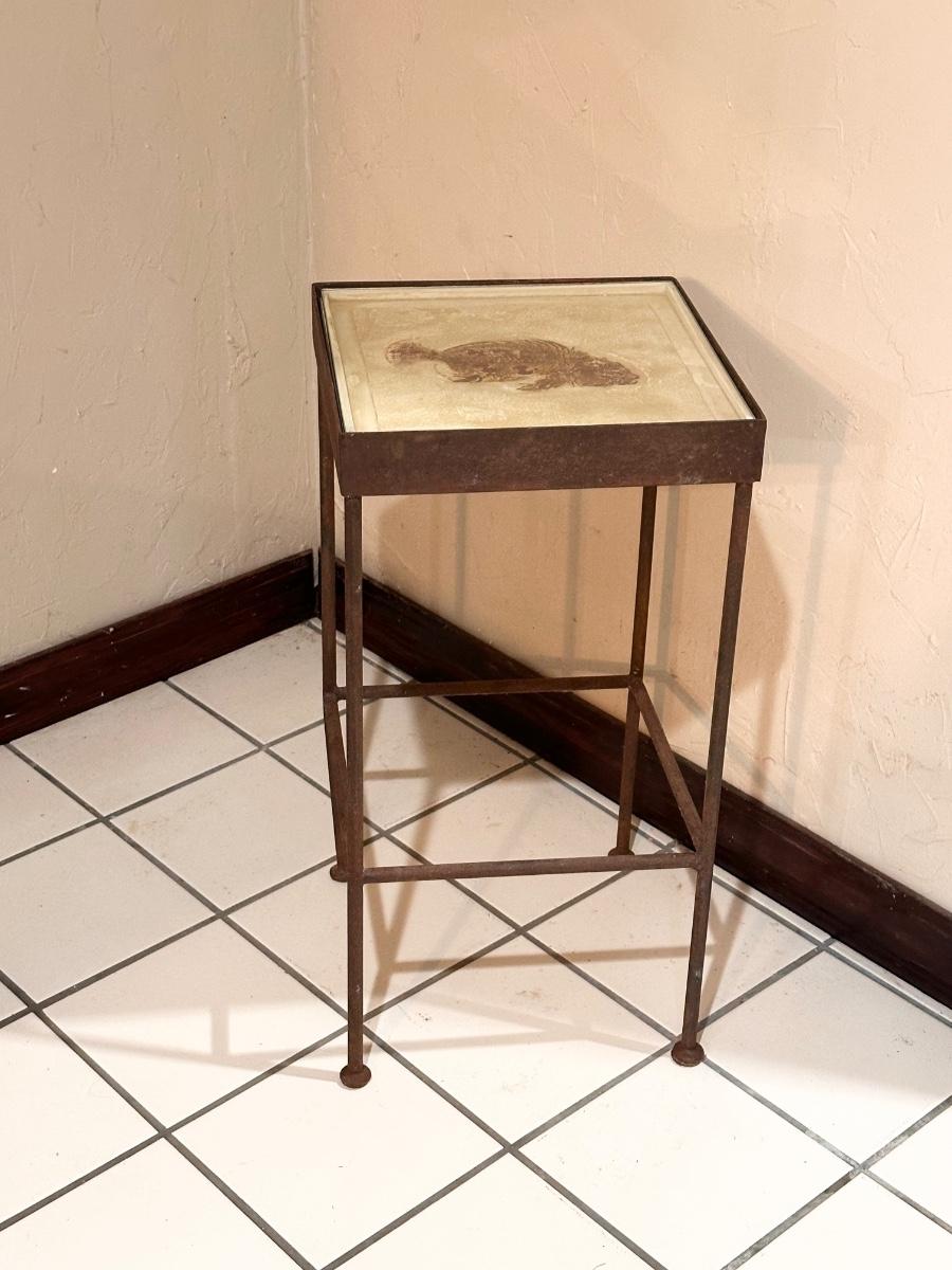 Heavy Iron ~ Made to have a rusty look ~ Glass top with Stone type material with fish fossil ~ 24.5” H x 12,5” Square