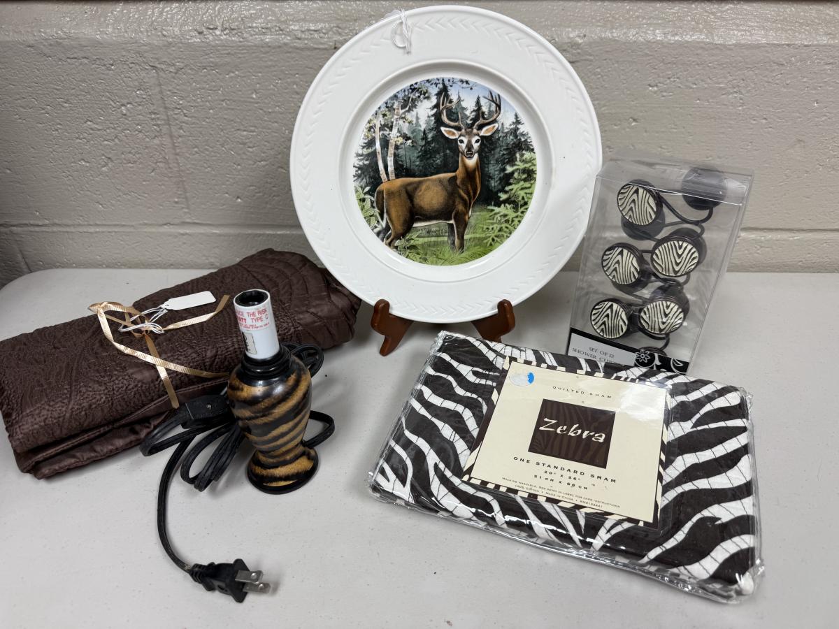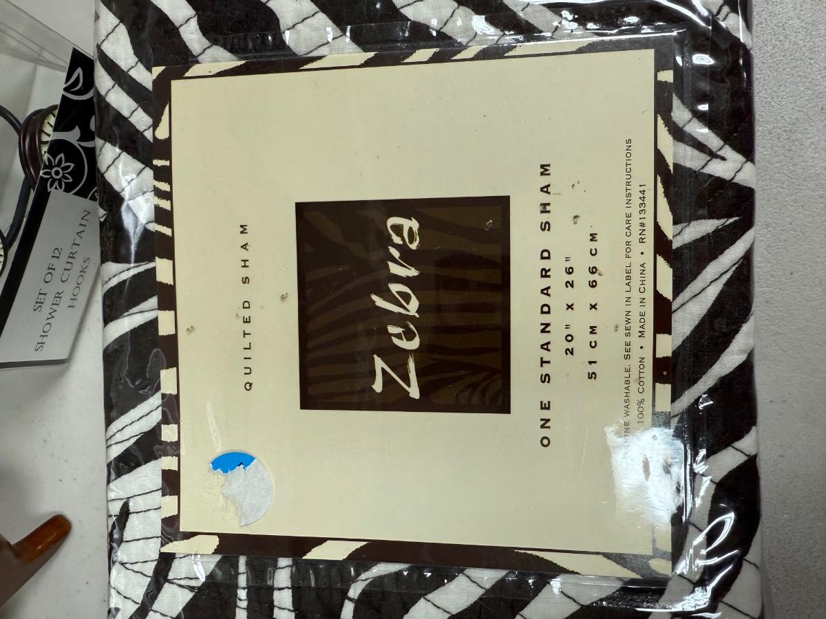 Zebra sham, mini light, collectible plate “White Tail Deer”, zebra shower curtain hooks, , brown satin sham
