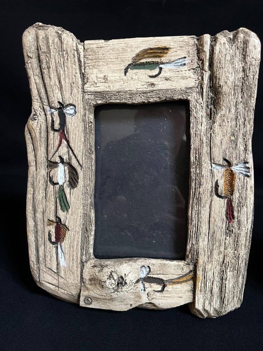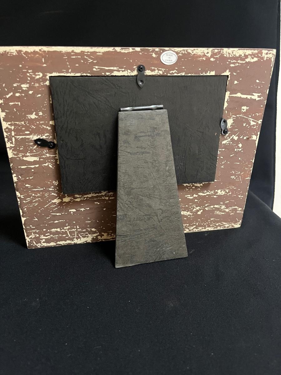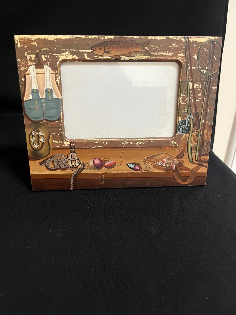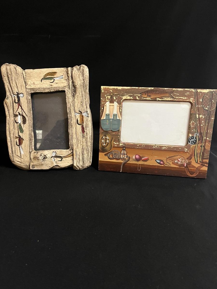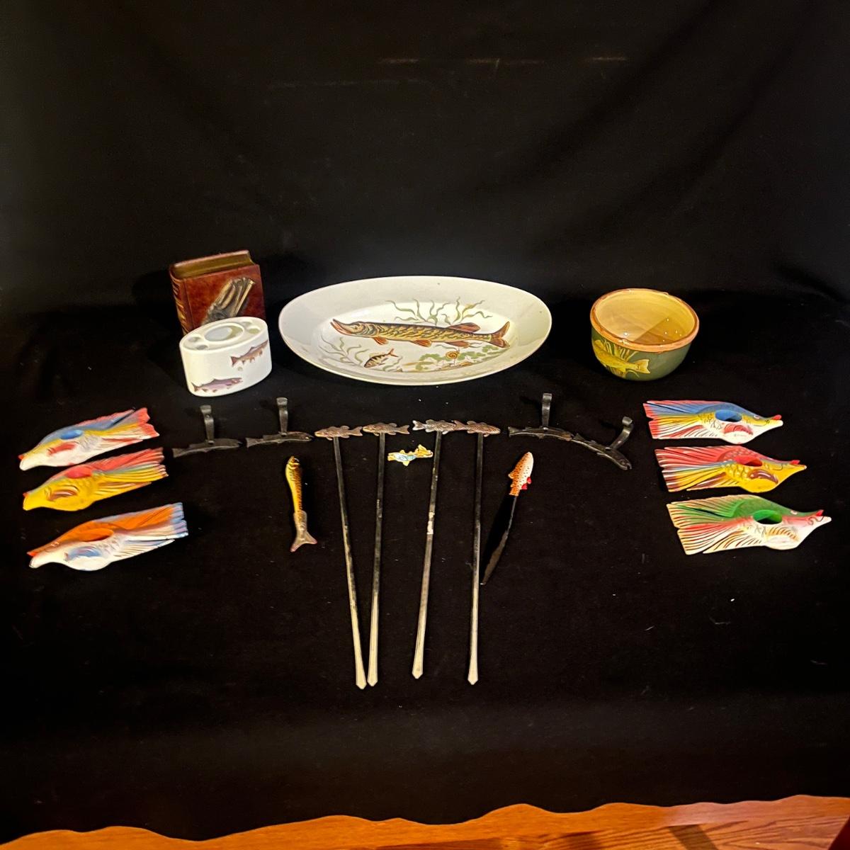 Lot includes platter, ceramic toothbrush holder, six napkin rings, four skewers, four wall mounted hooks, bowl, book shaped box and more. Platter measures 10” x 14” x 2.25”H. Also includes a resin and wood picture frames with the largest measuring 7.5” x 9.5”.