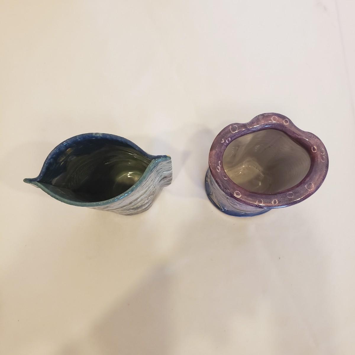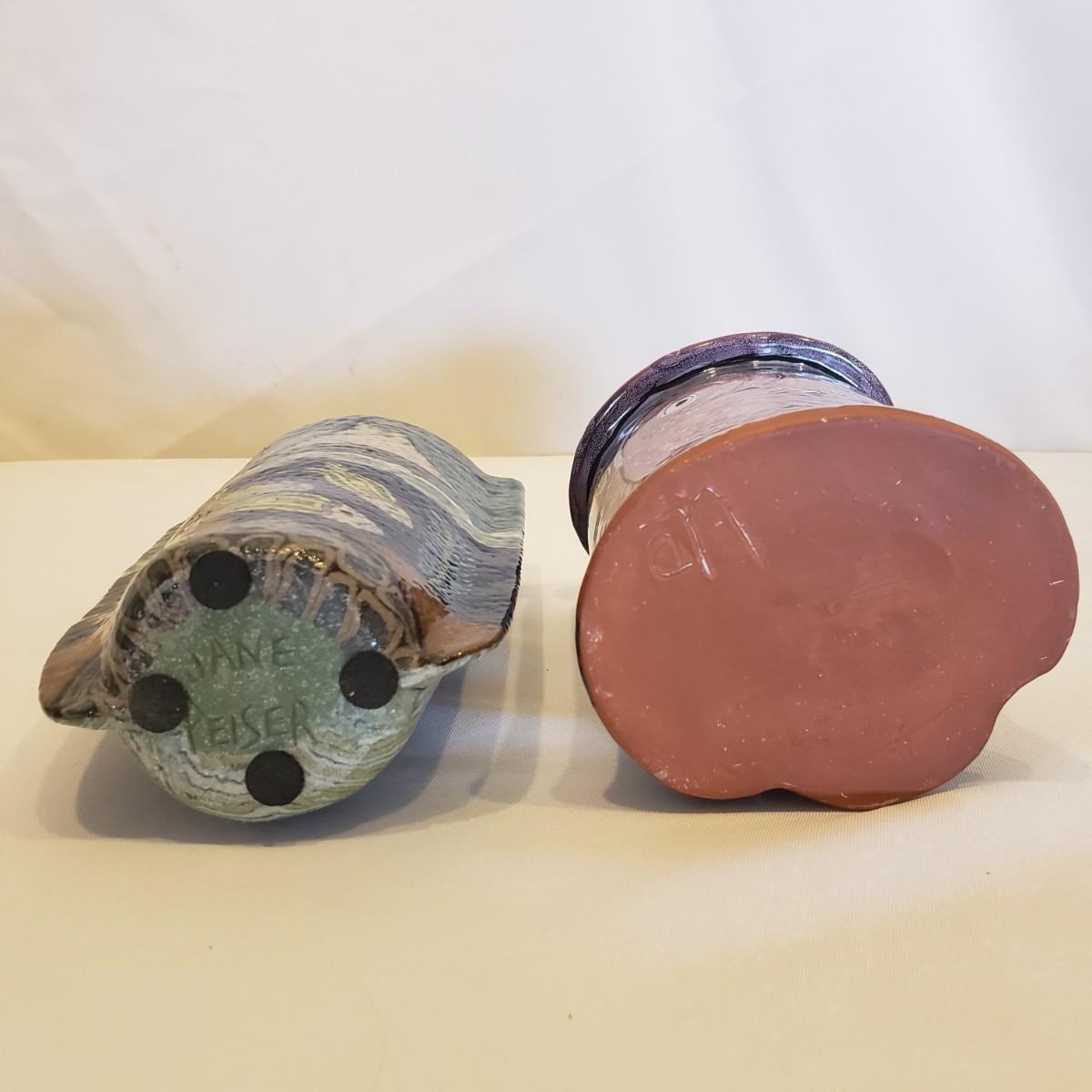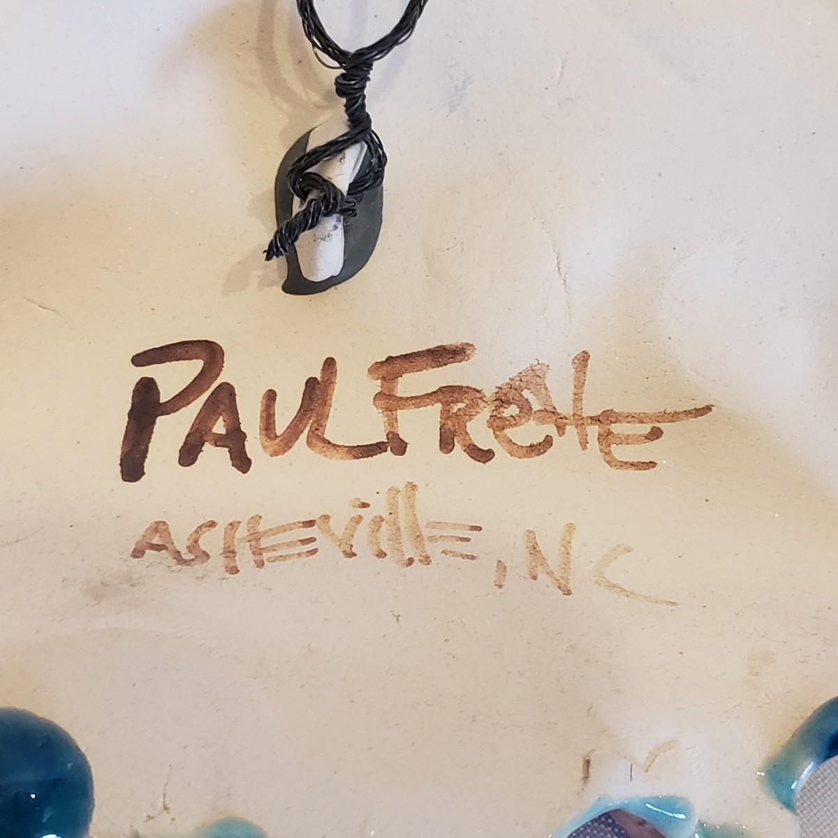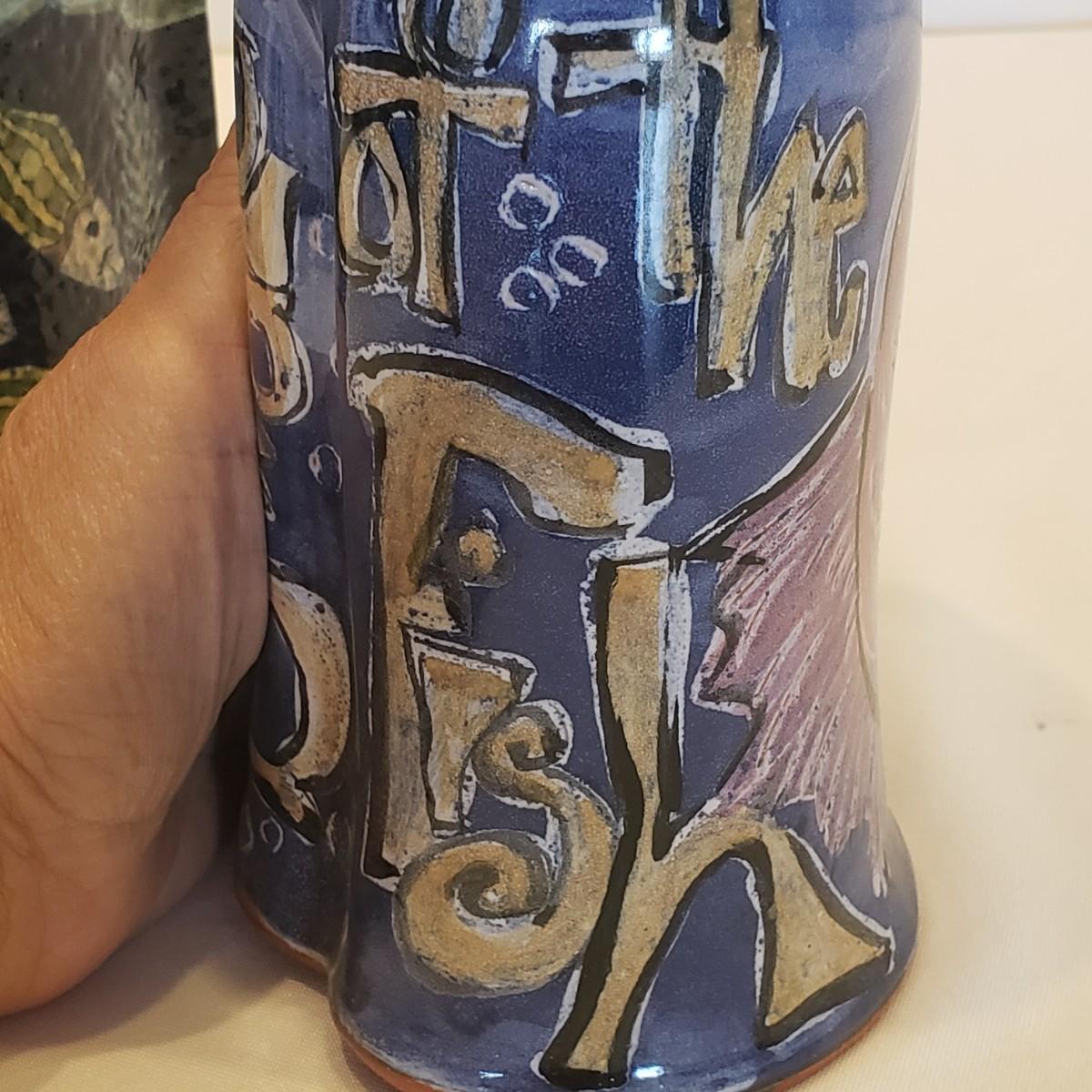 This fish themed lot contains two pottery vases, two wooden fish and a wall hanging pottery fish. The tallest vase by Jane Peiser measures 5" x 2.5" x 8"H. There are four rubber pads on the bottom. The art extends inside the vase all the way to the bottom. This was hard to capture in photos. The other vase says "Beware of the Fish". Shipping available. The two wooden fish with metal tails are signed Paul Sumner and included is the receipt from Blue Spiral Gallery. They each have a drilled hole for mounting on a wall. The smaller colorful fish signed by Paul Frete, Asheville, NC. There is a wire for hanging.