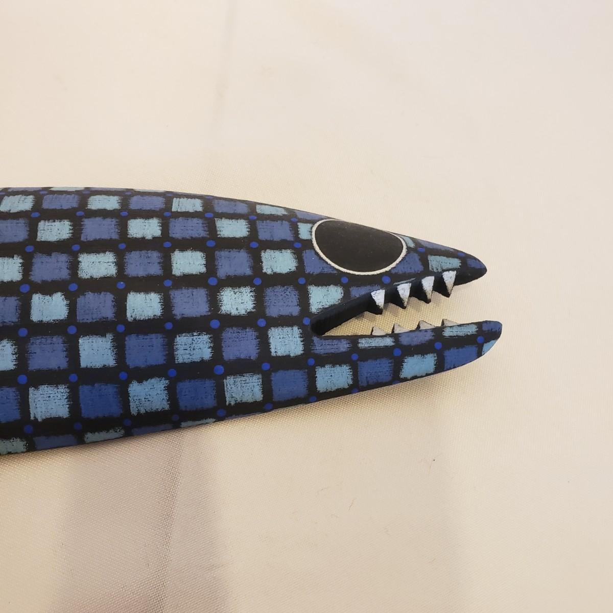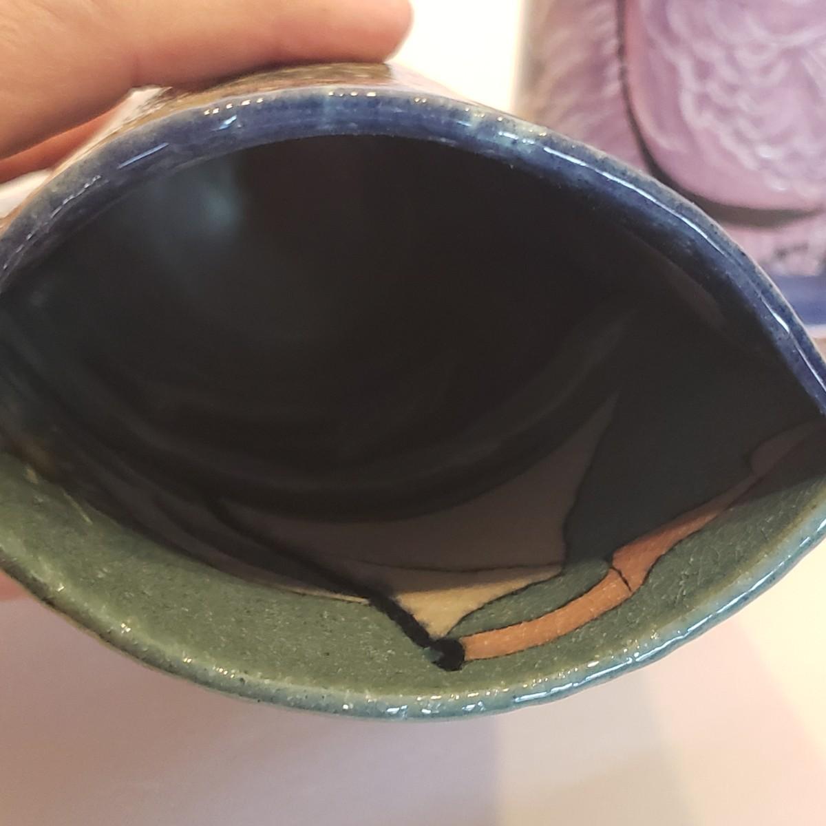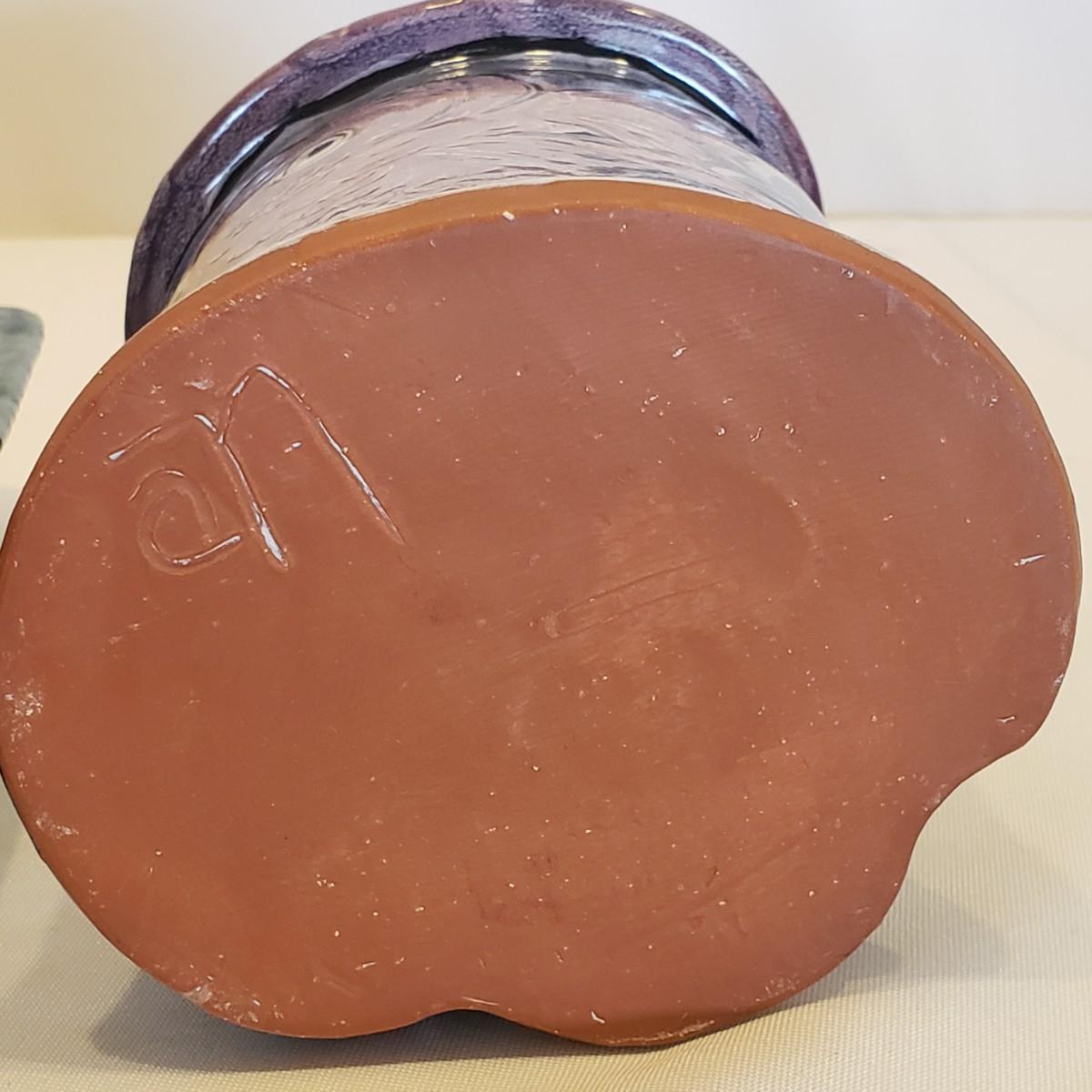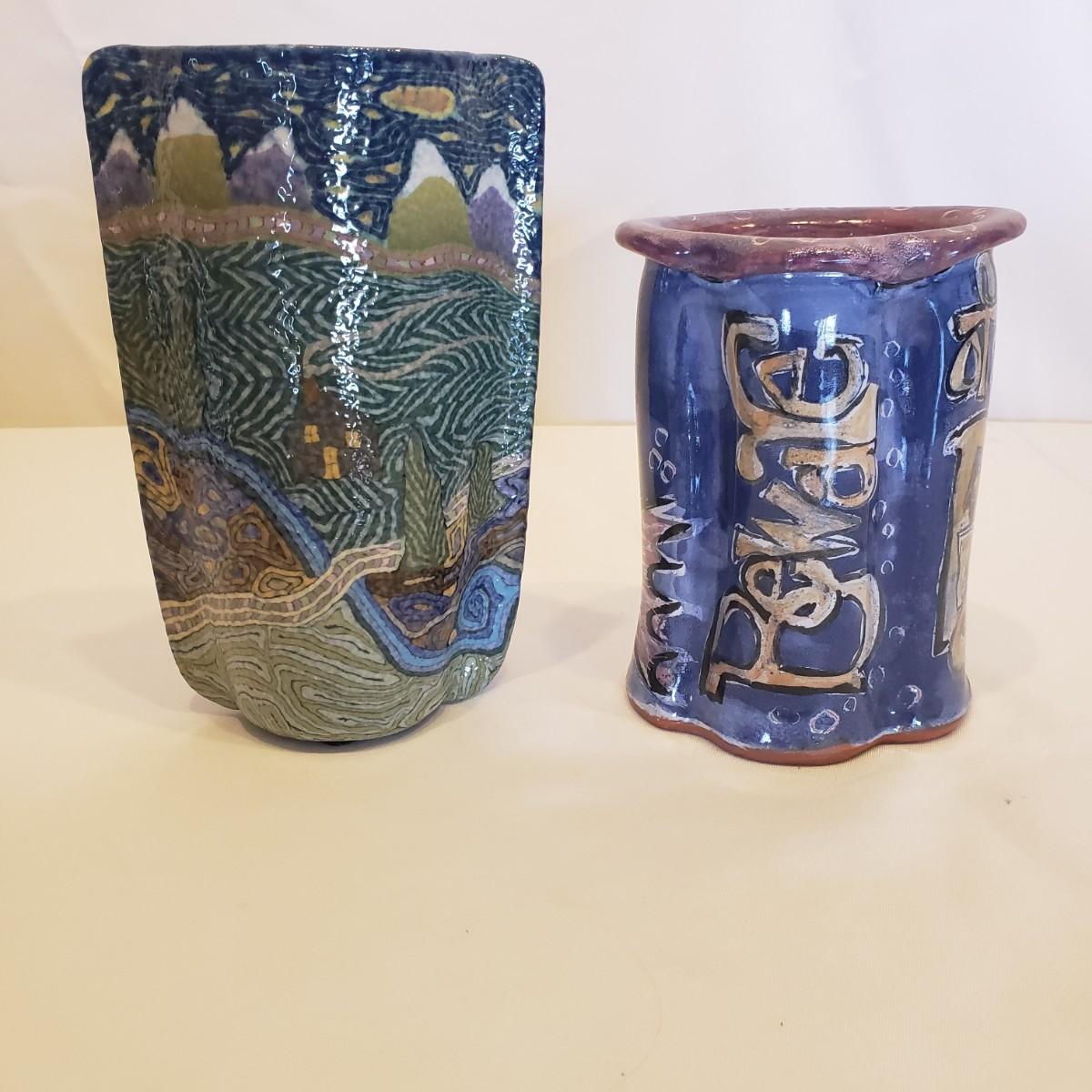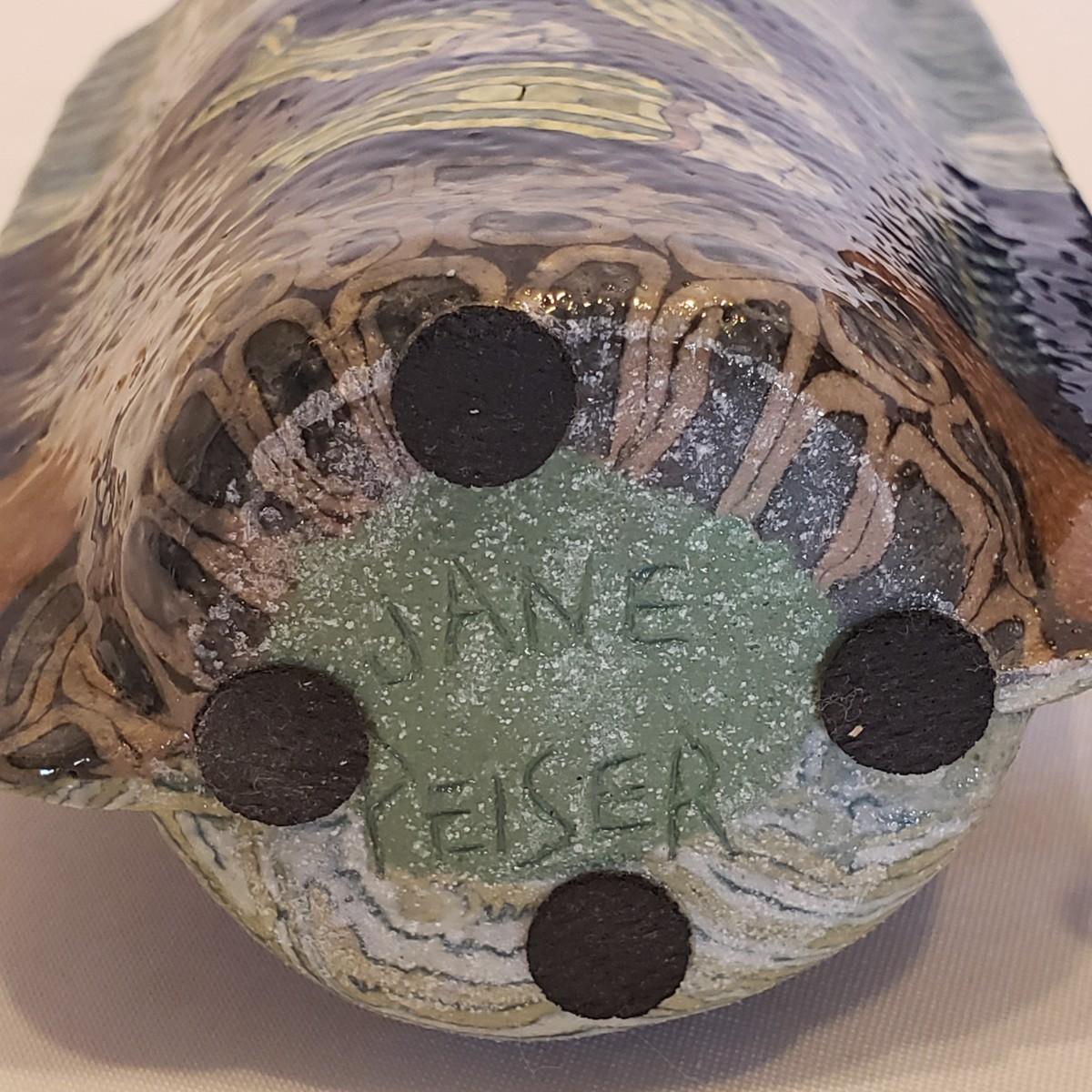 This fish themed lot contains two pottery vases, two wooden fish and a wall hanging pottery fish. The tallest vase by Jane Peiser measures 5" x 2.5" x 8"H. There are four rubber pads on the bottom. The art extends inside the vase all the way to the bottom. This was hard to capture in photos. The other vase says "Beware of the Fish". Shipping available. The two wooden fish with metal tails are signed Paul Sumner and included is the receipt from Blue Spiral Gallery. They each have a drilled hole for mounting on a wall. The smaller colorful fish signed by Paul Frete, Asheville, NC. There is a wire for hanging.