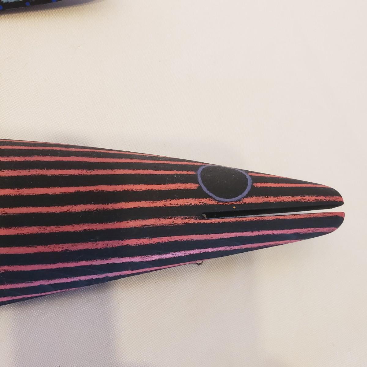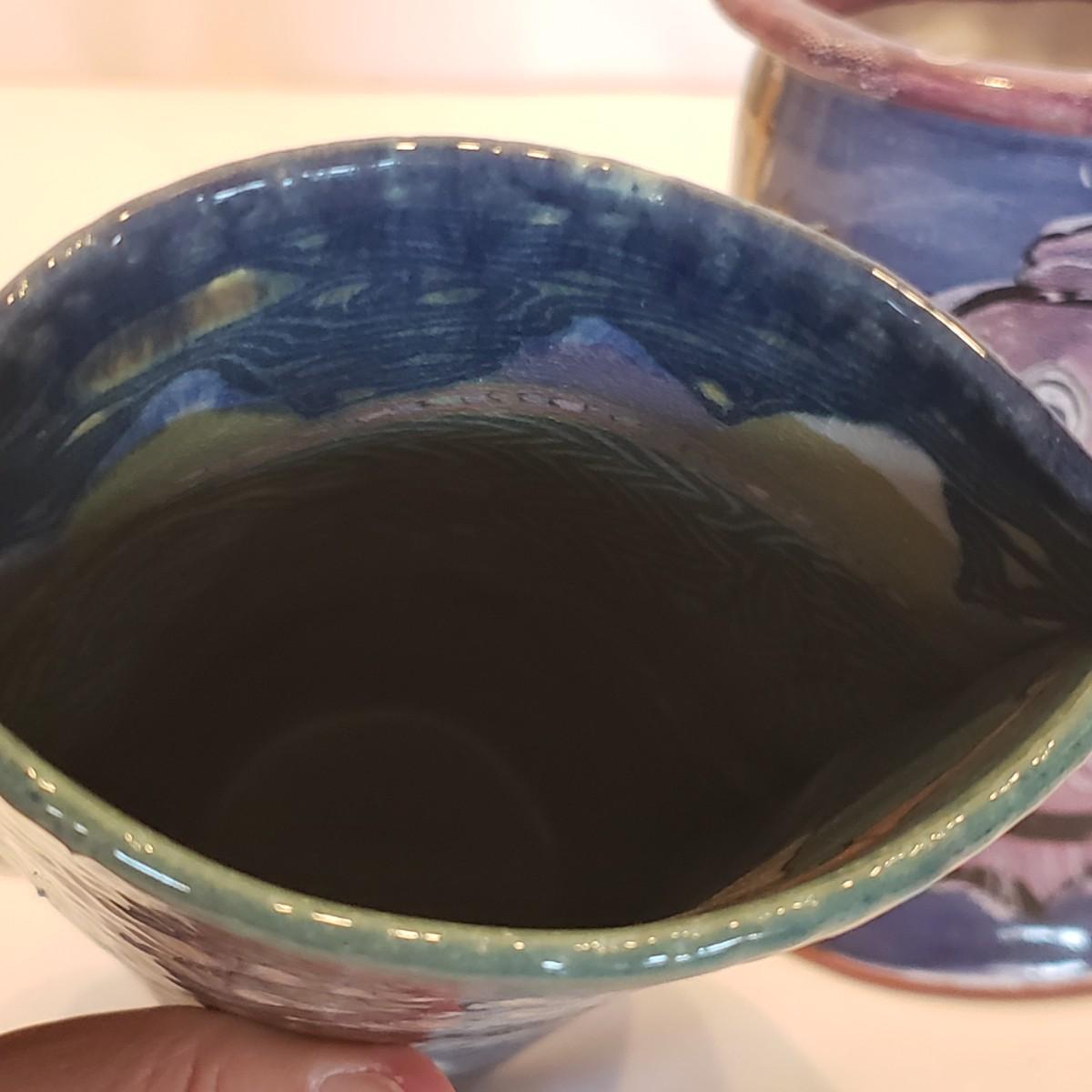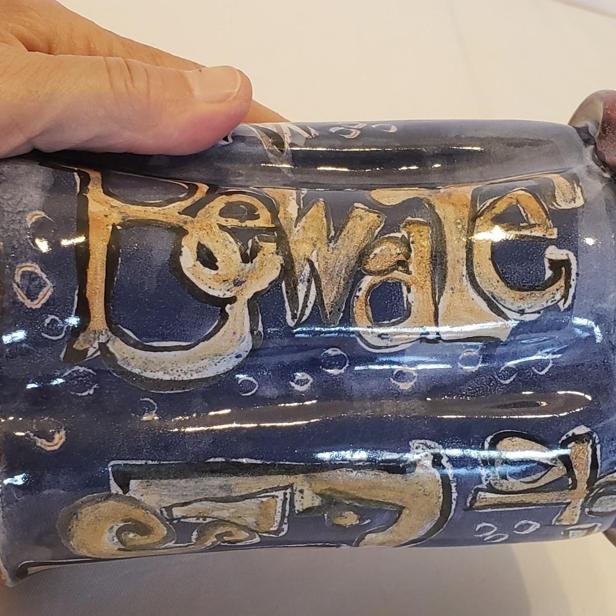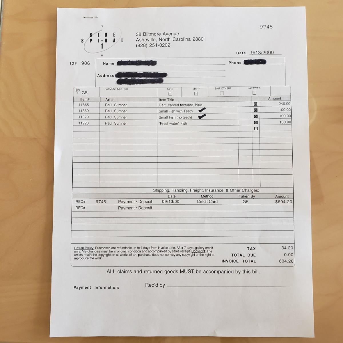 This fish themed lot contains two pottery vases, two wooden fish and a wall hanging pottery fish. The tallest vase by Jane Peiser measures 5" x 2.5" x 8"H. There are four rubber pads on the bottom. The art extends inside the vase all the way to the bottom. This was hard to capture in photos. The other vase says "Beware of the Fish". Shipping available. The two wooden fish with metal tails are signed Paul Sumner and included is the receipt from Blue Spiral Gallery. They each have a drilled hole for mounting on a wall. The smaller colorful fish signed by Paul Frete, Asheville, NC. There is a wire for hanging.