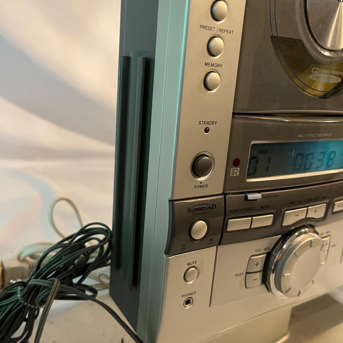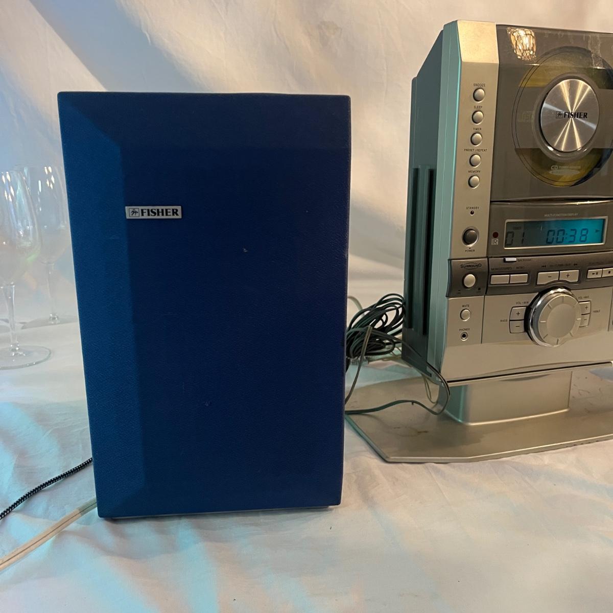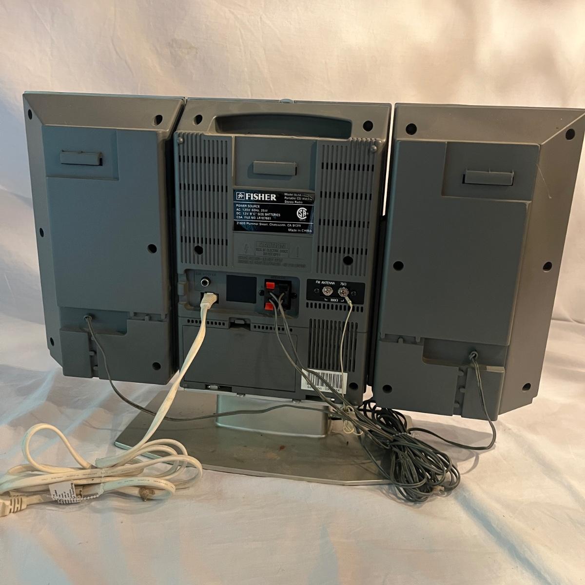 This Fisher AM/FM CD player has detachable speakers and powered on when plugged in, battery power was not tested as it has no batteries. Stereo measures 22” x 7” x 14”H.