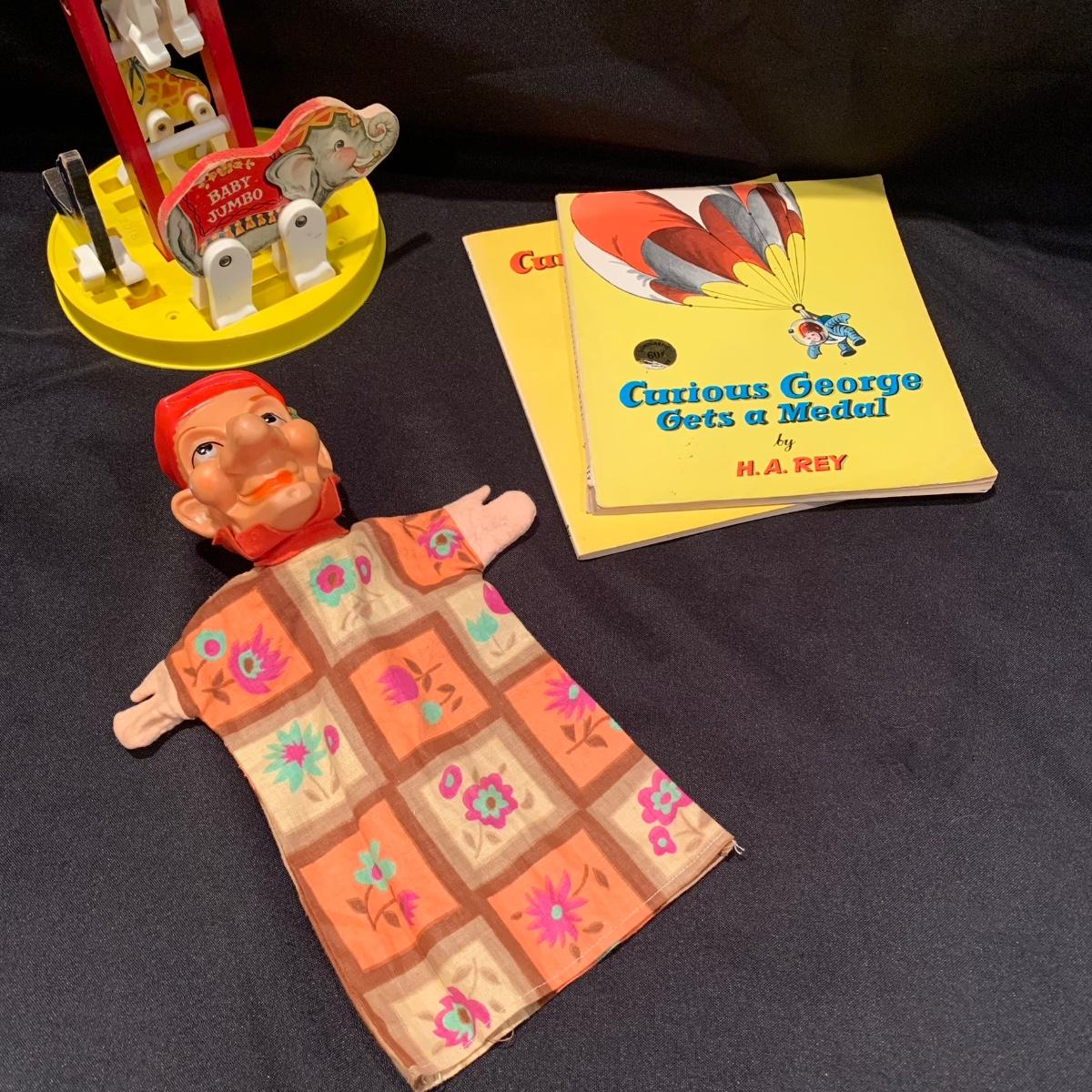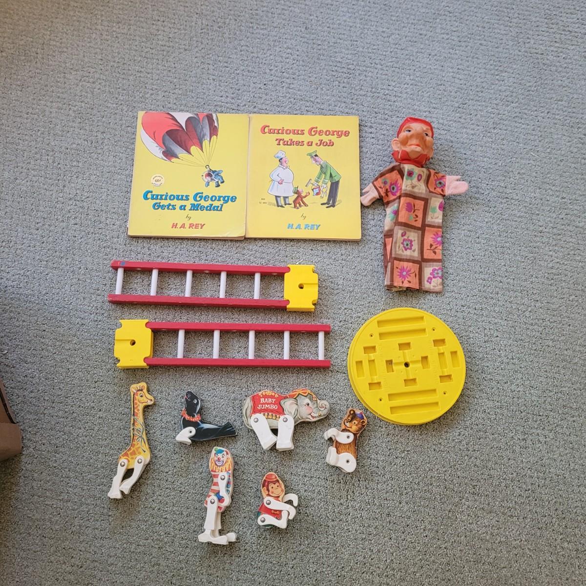Vintage Fisher Price circus ring with clown, seal, monkey, giraffe, elephant, and bear. Lot also includes two Curious George books, and Jester hand puppet. Circus ring measures, 7”D x 25”H. Please see photos for more details. Shipping available. Shipping can be costly. We suggest contacting our preferred local shipping provider, Postage Express, with dimensions and getting an estimate before bidding: (828) 670-5501 or postageexpress@yahoo.com.