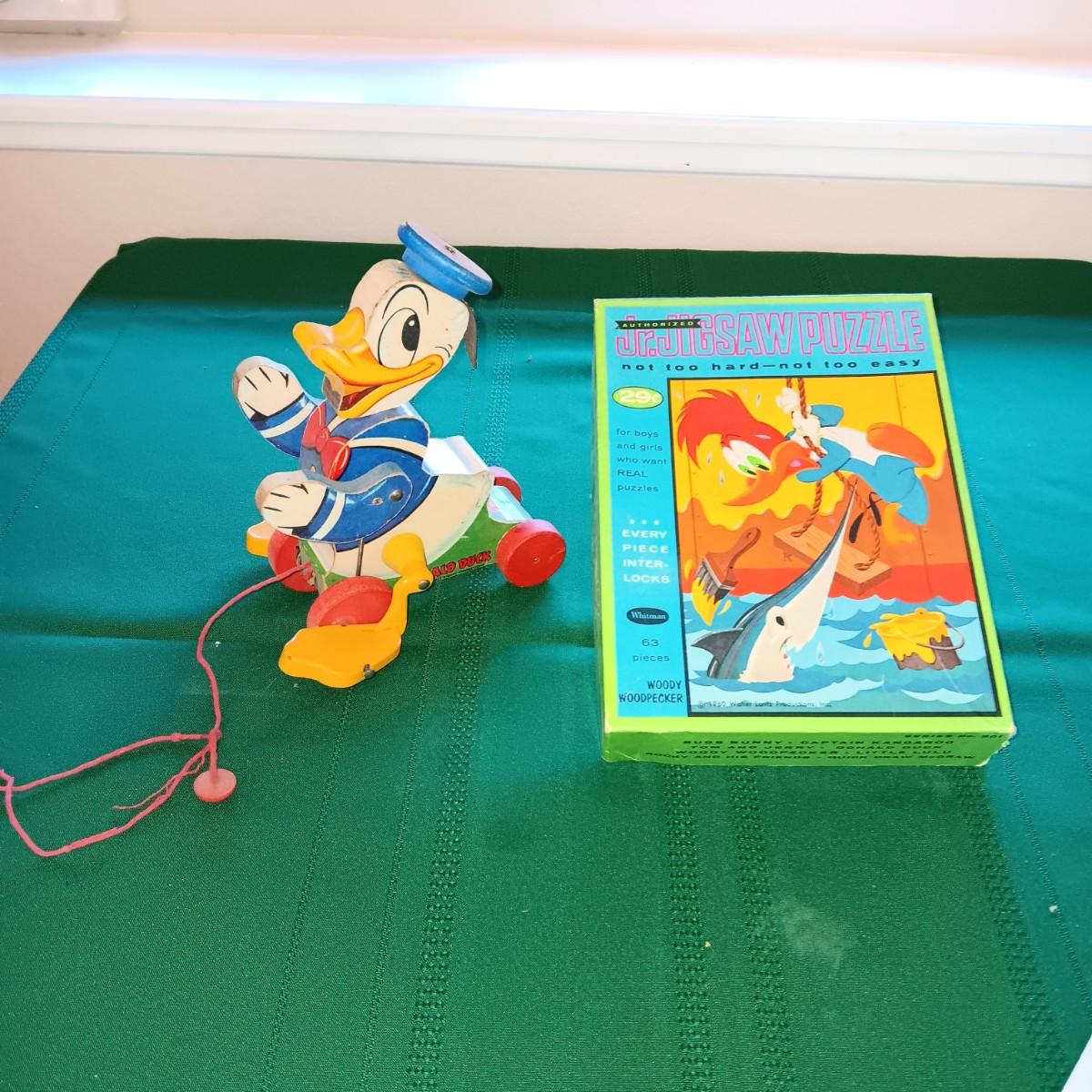 FISHER PRICE DONALD DUCK PULL TOY AND A JR JIGSAW PUZZLE