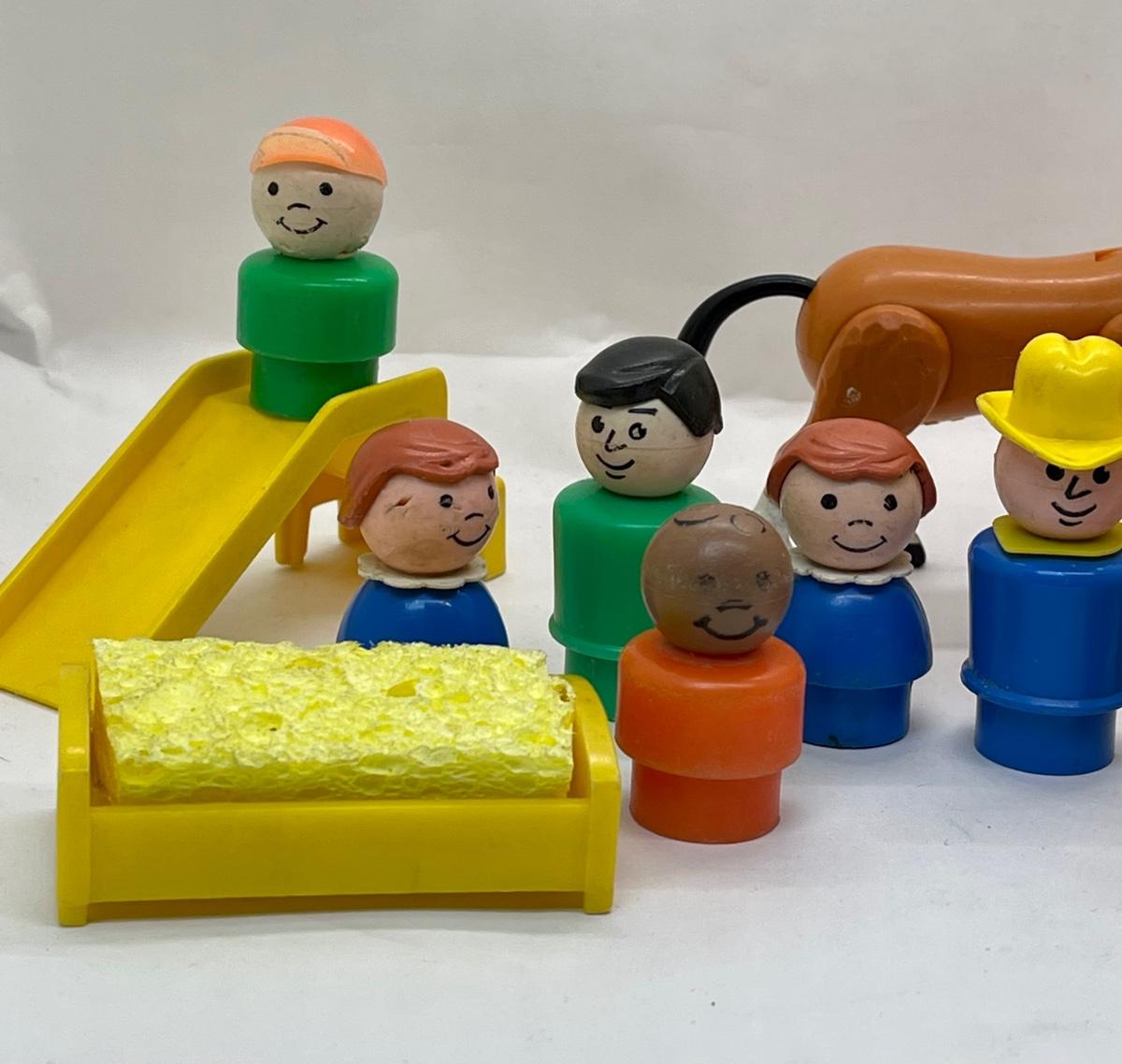 Fisher Price Lot Little People Play Accessories - LOT 18 - People, Farm Animals, Slide, Lifeguard Chair, Bed, Beach Chair