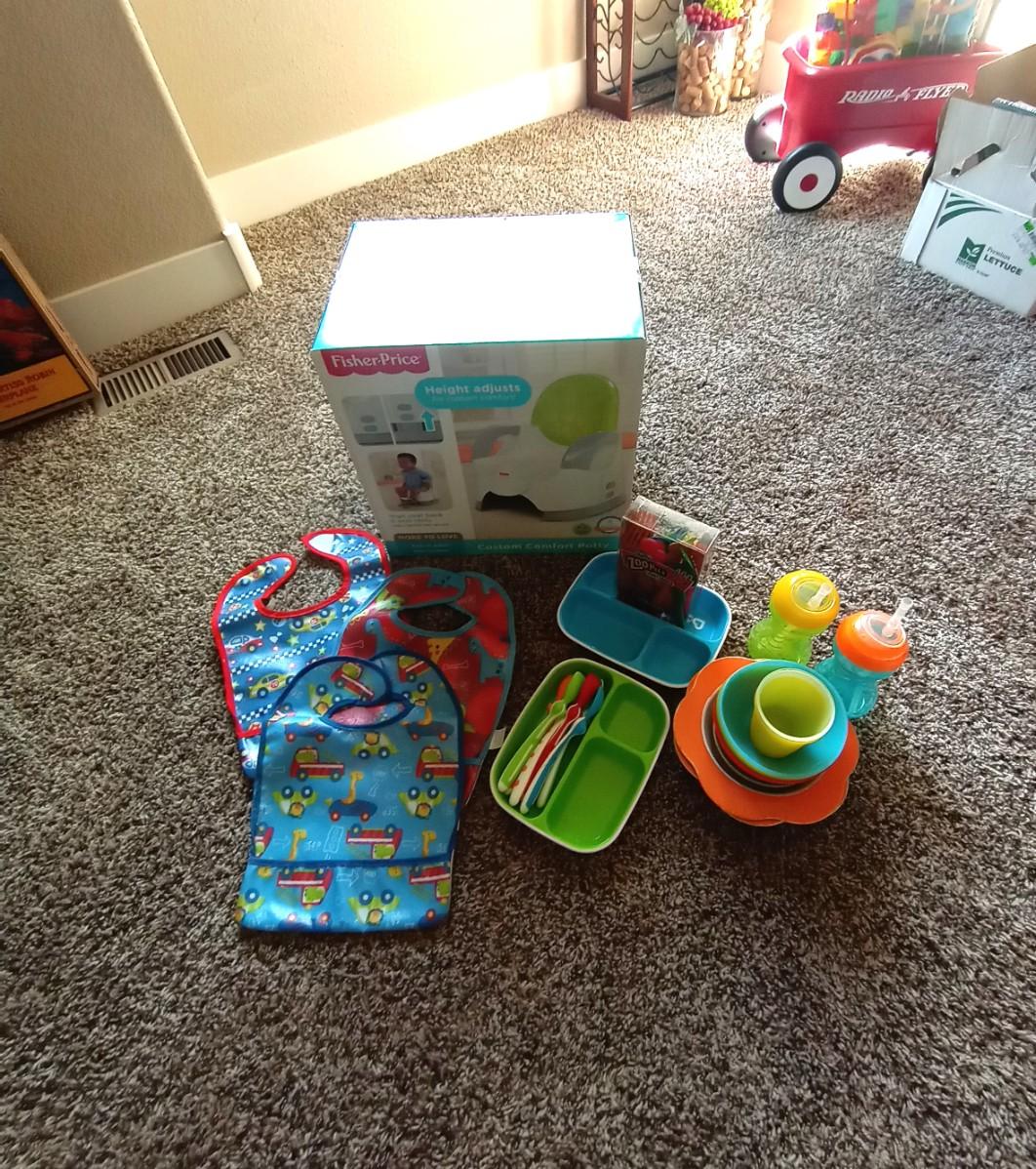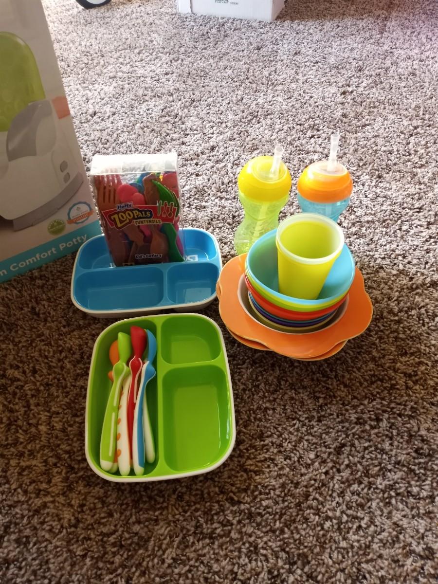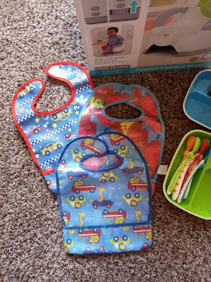 FISHER PRICE POTTY TRAINER-BIBS AND KIDS PLASTIC DISHWARE