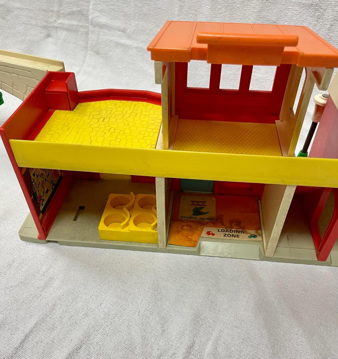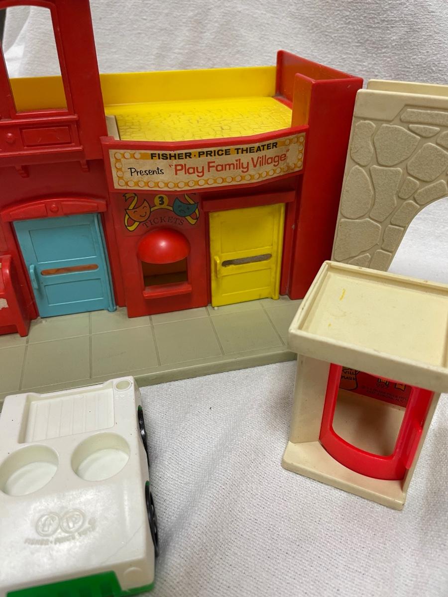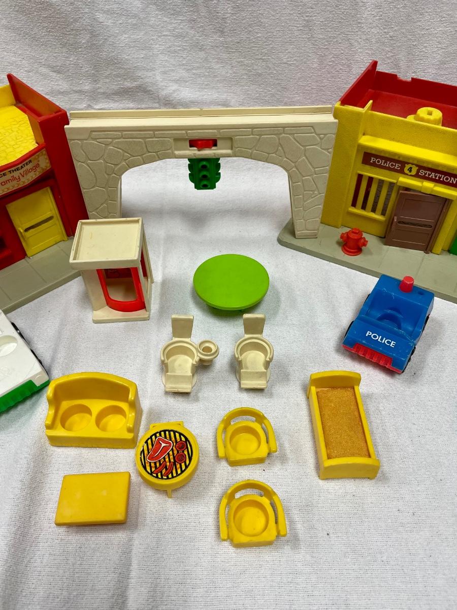 Set #997 Family Village. Incomplete, but includes some extra items. Some scuffs, scratches, and a few areas with minor damage like cracks, but overall in good, played-with condition.