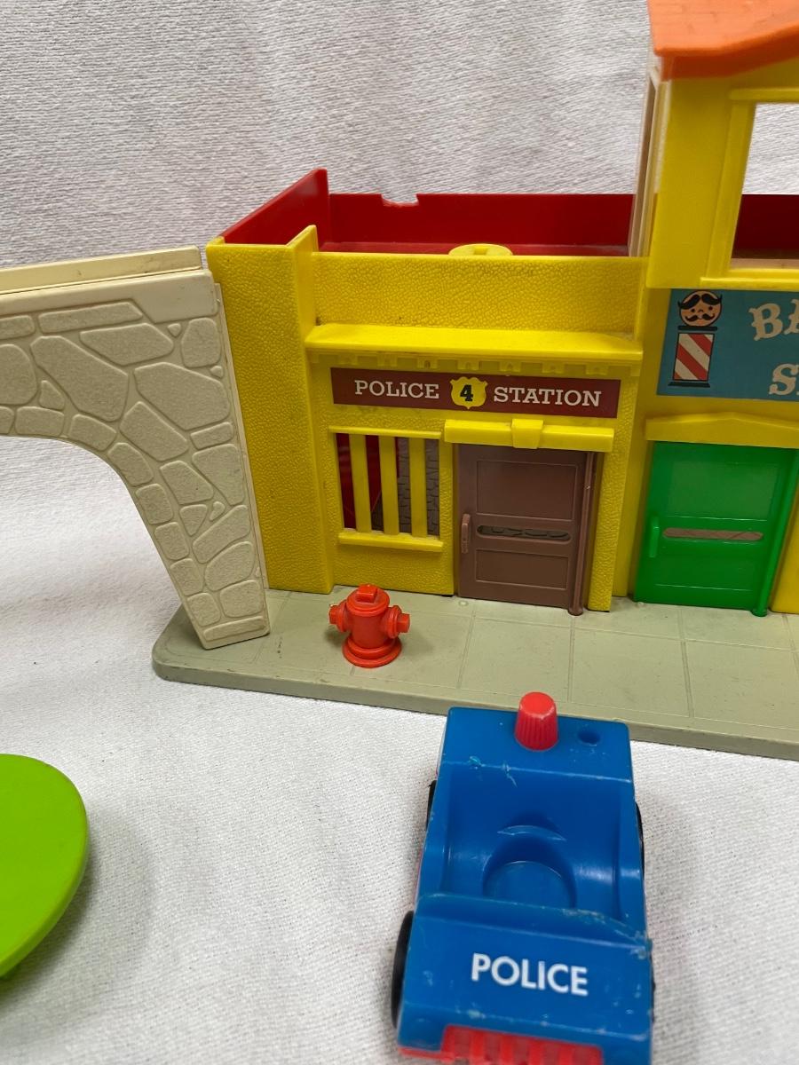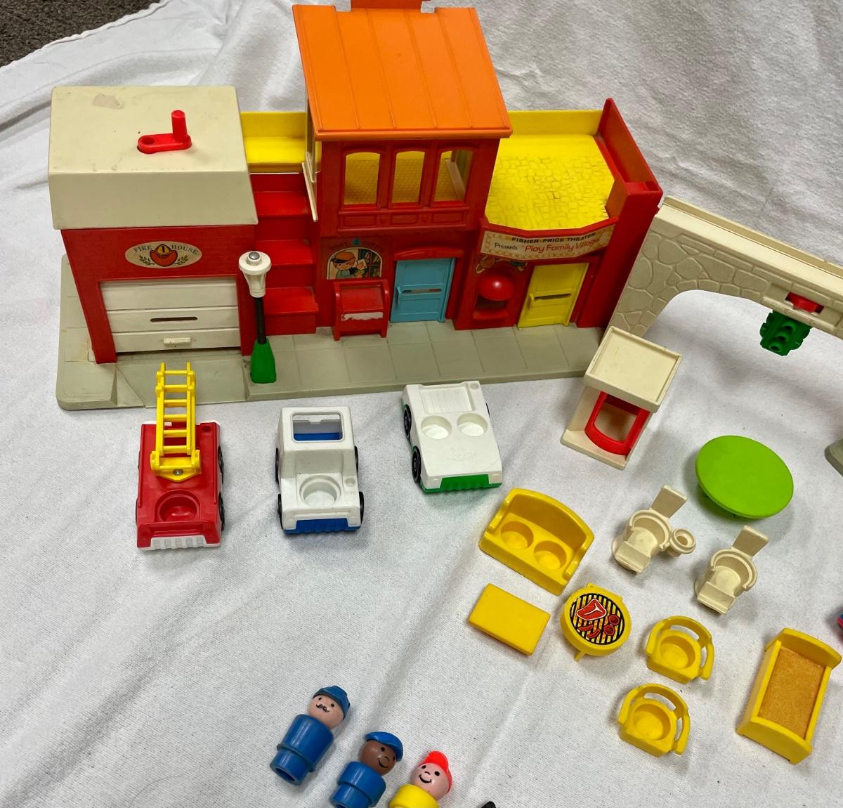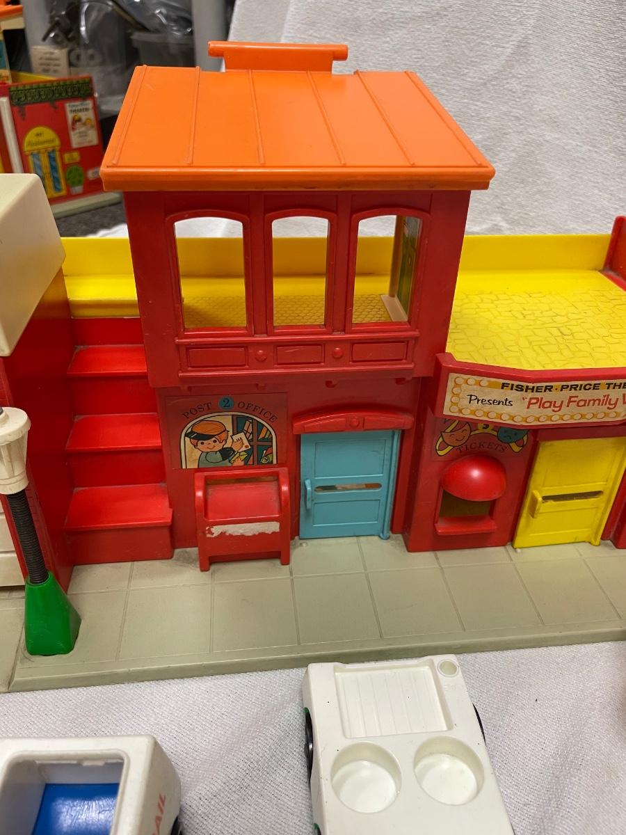 Set #997 Family Village. Incomplete, but includes some extra items. Some scuffs, scratches, and a few areas with minor damage like cracks, but overall in good, played-with condition.
