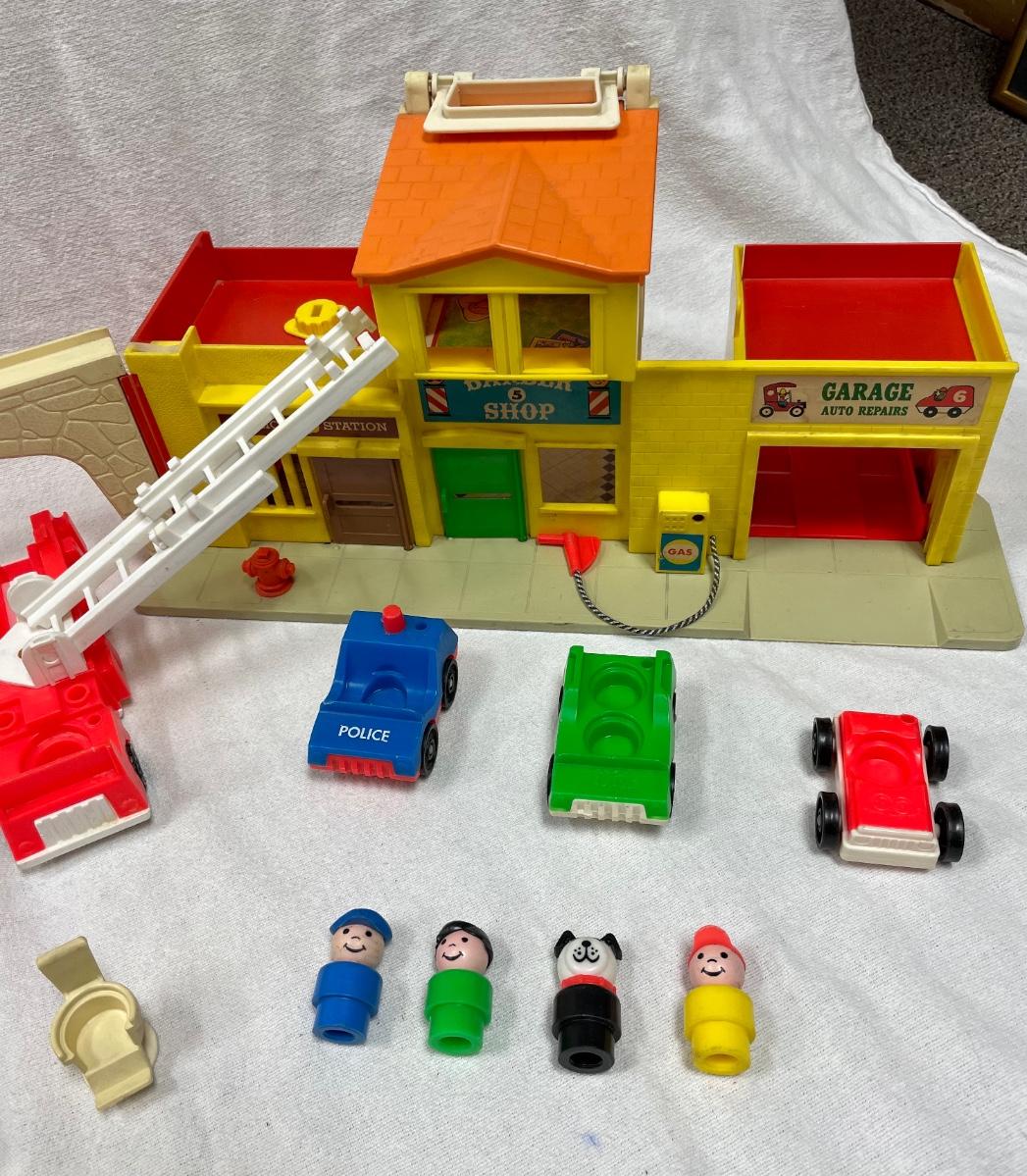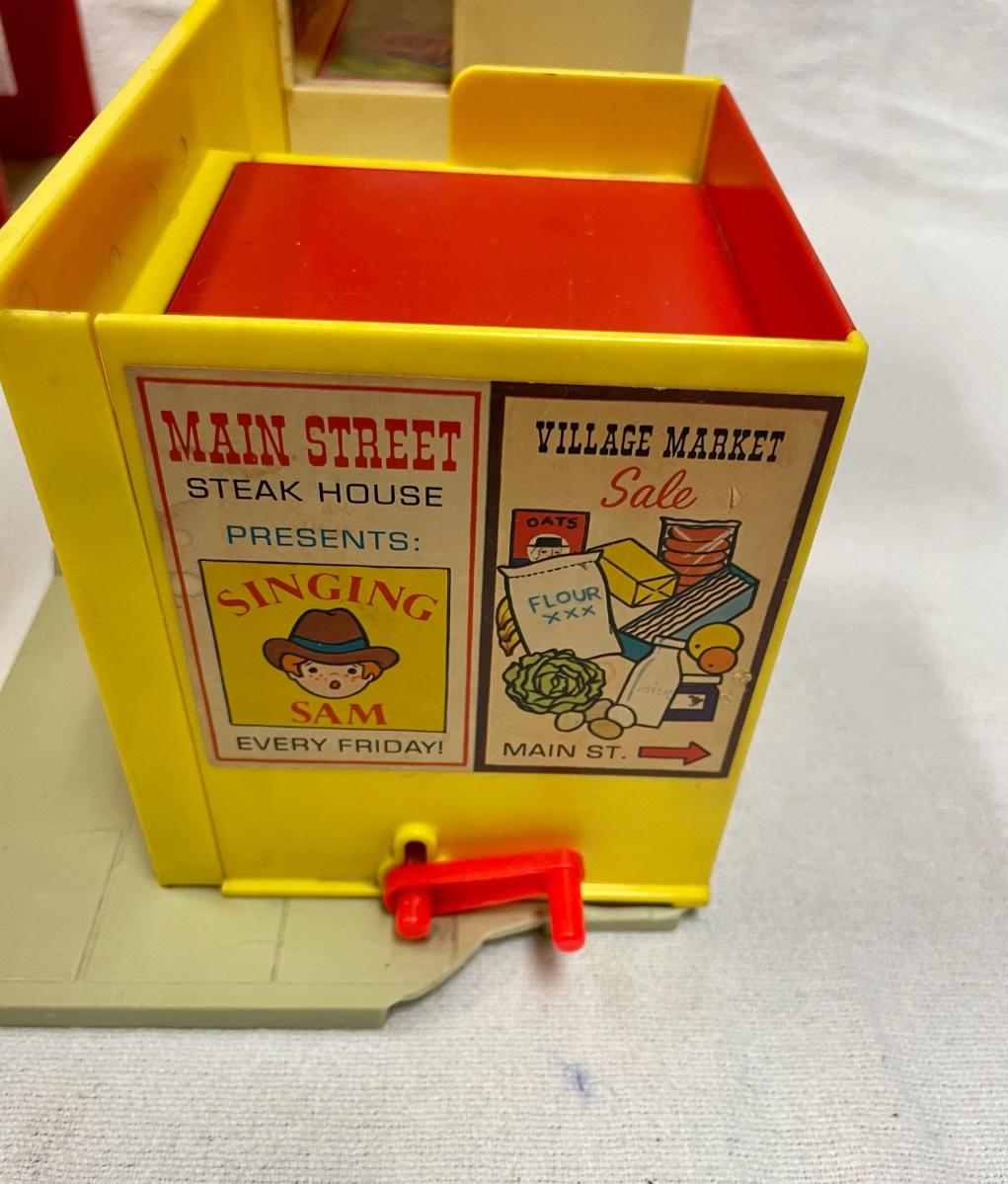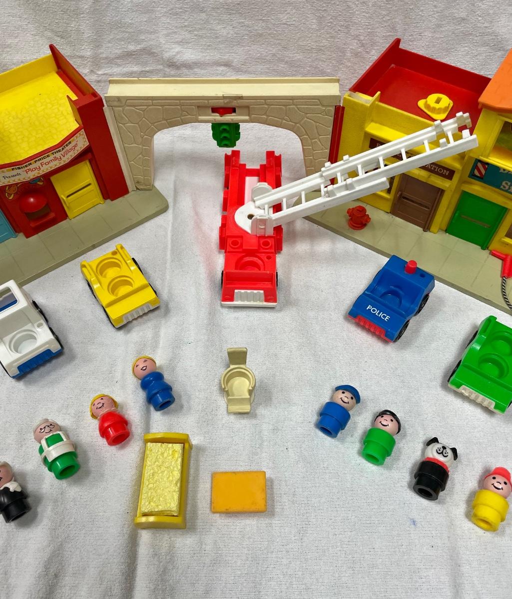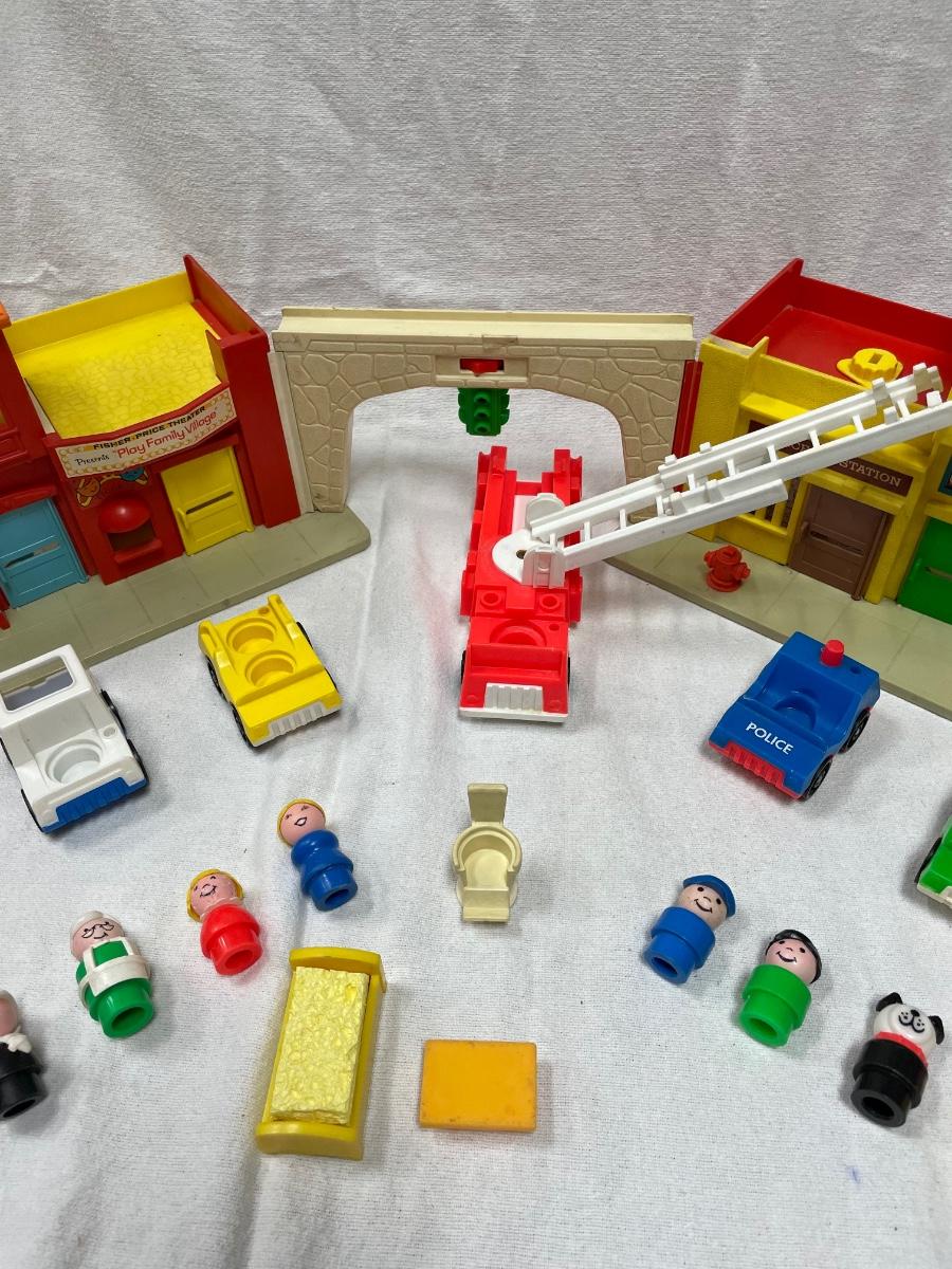 Set #997 Family Village. Incomplete, but includes some extra items. Some scuffs, scratches, and a few areas with minor damage like cracks, but overall in good, played-with condition. One small portion of base is broken off, see photos.