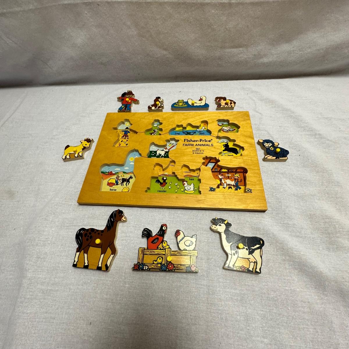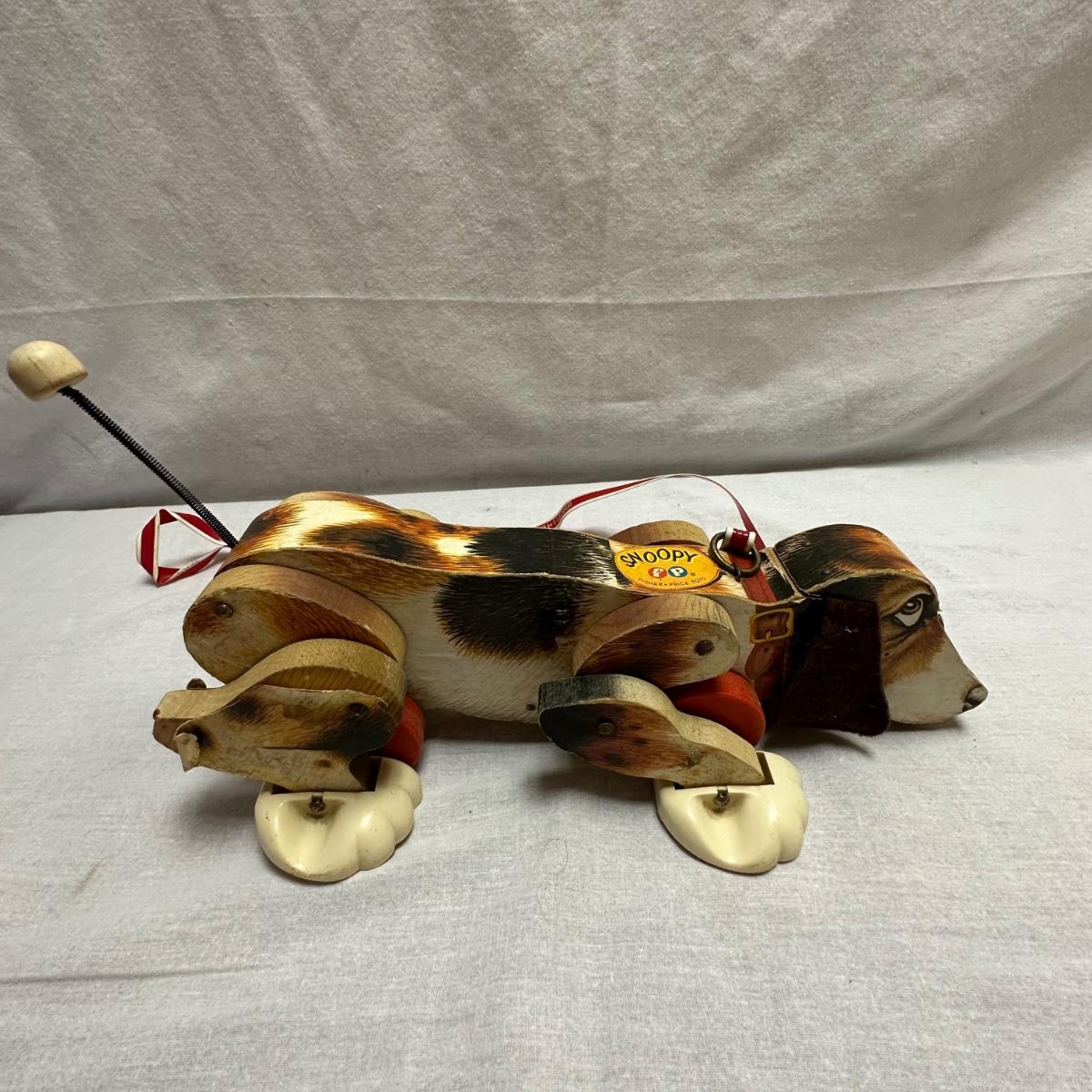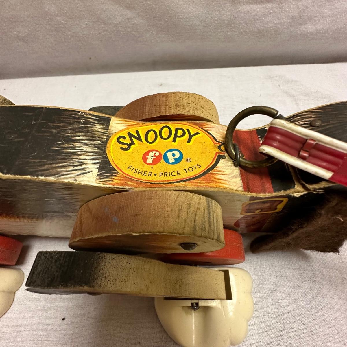 Fisher Price wooden "Snoopy" puppy on wheels with rubber leash. The feet and legs move and tail wags when pulled. Measures 16” from nose to tail. Four themed wooden puzzles. Measures 11.75” x 8”. Shipping available.