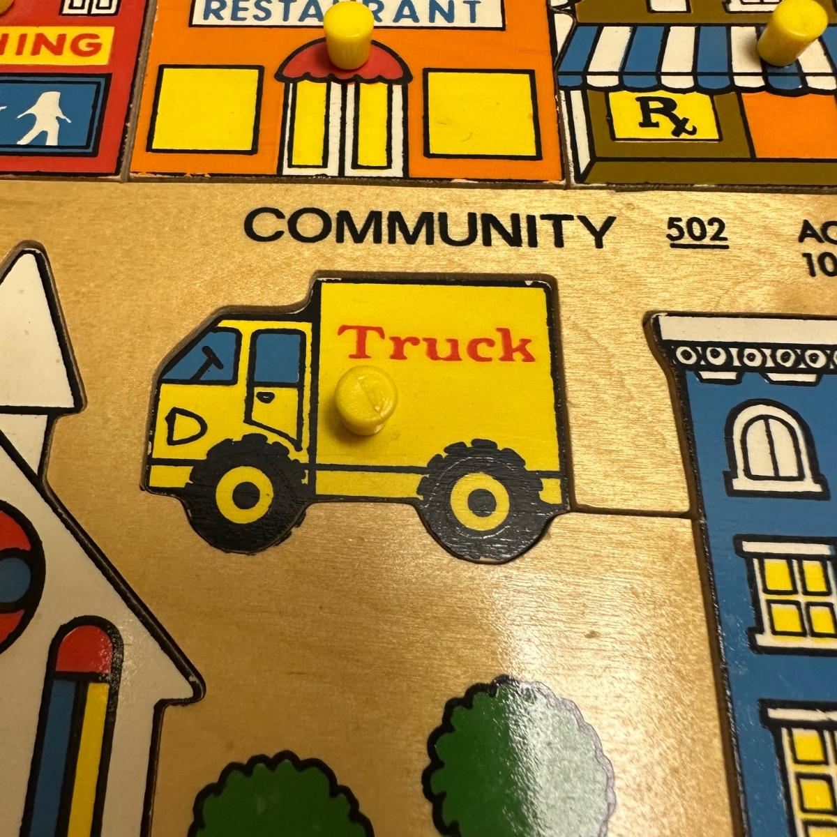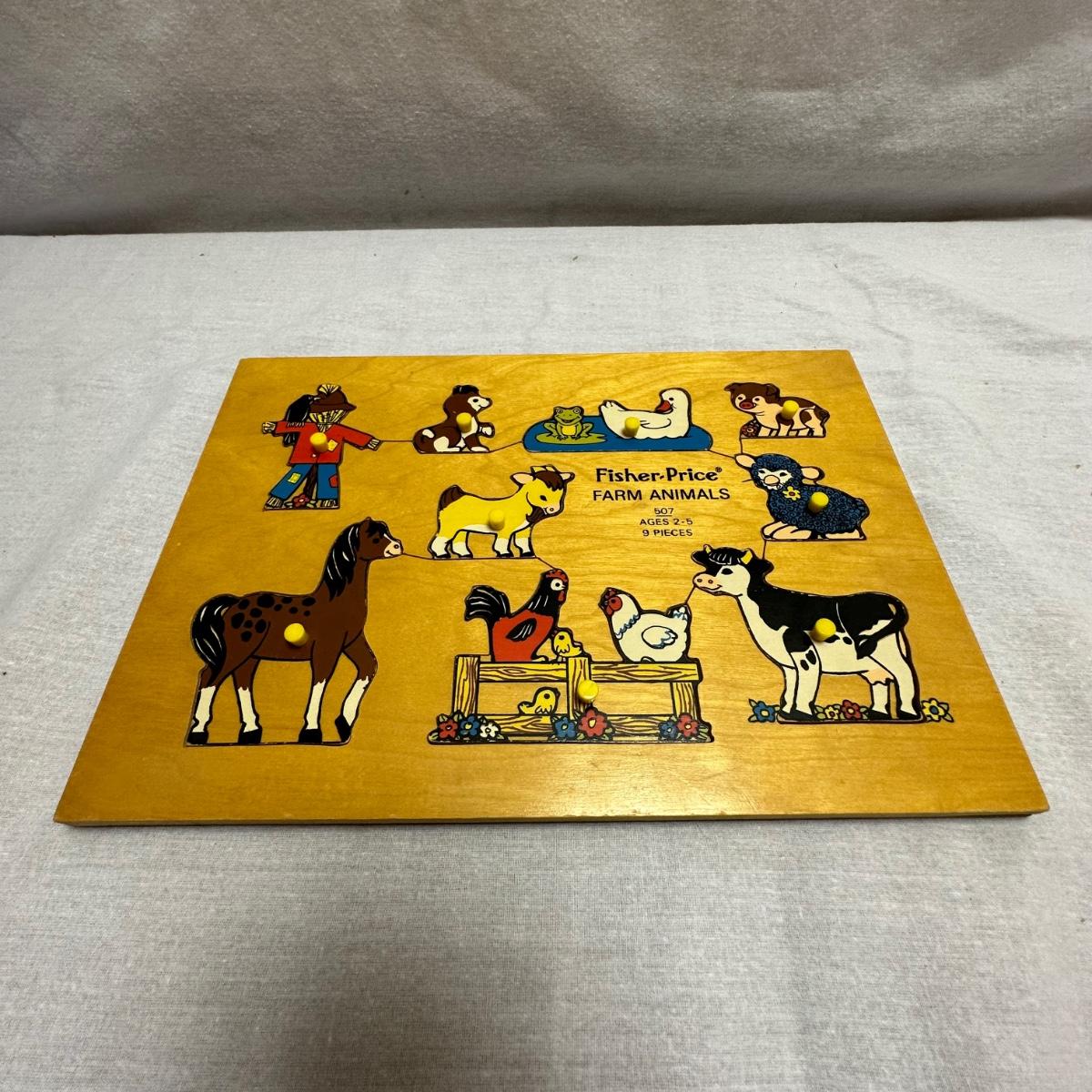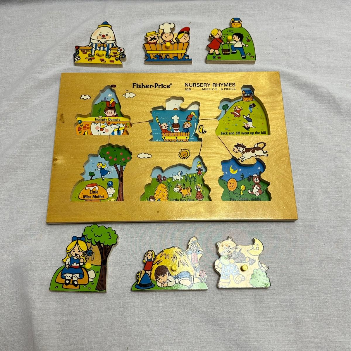 Fisher Price wooden "Snoopy" puppy on wheels with rubber leash. The feet and legs move and tail wags when pulled. Measures 16” from nose to tail. Four themed wooden puzzles. Measures 11.75” x 8”. Shipping available.