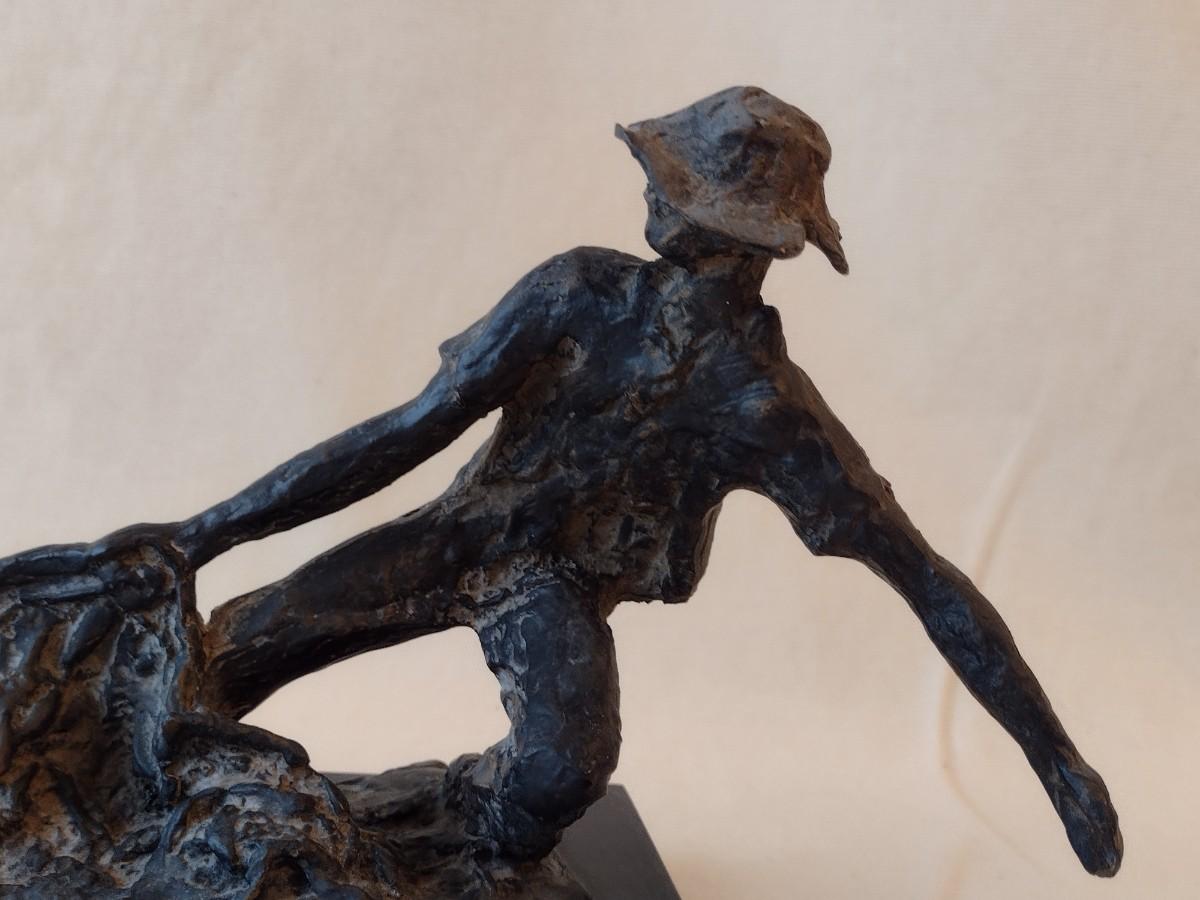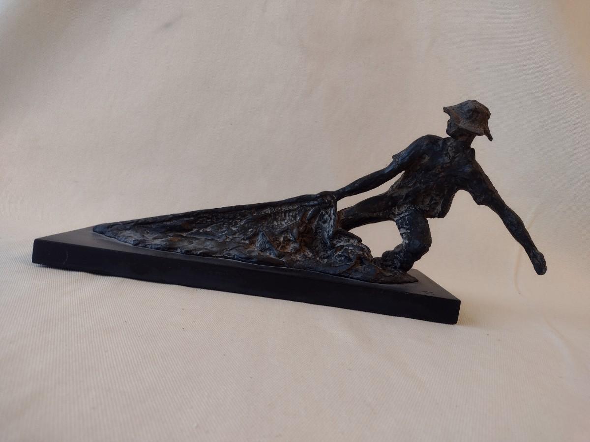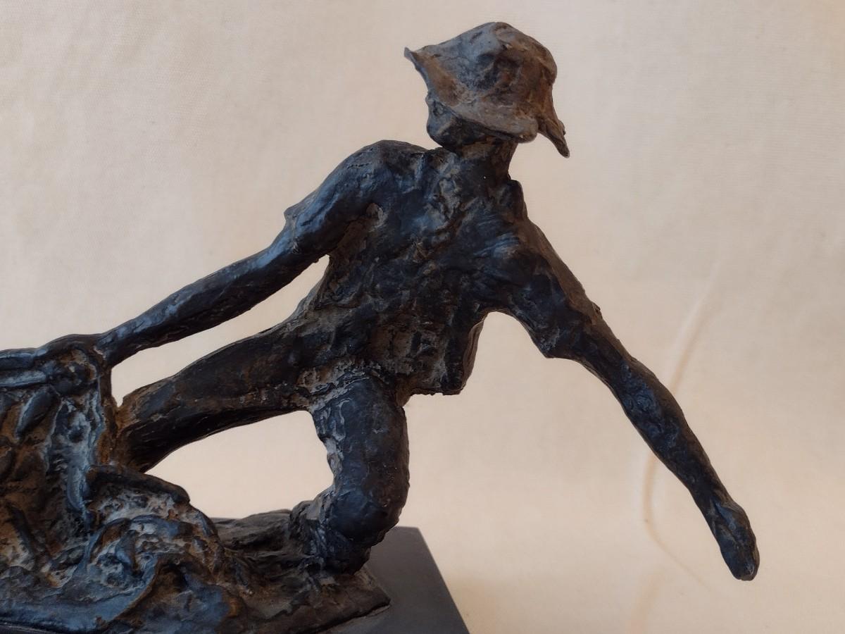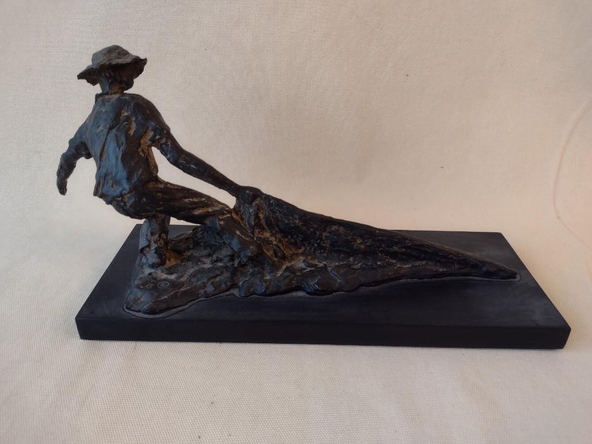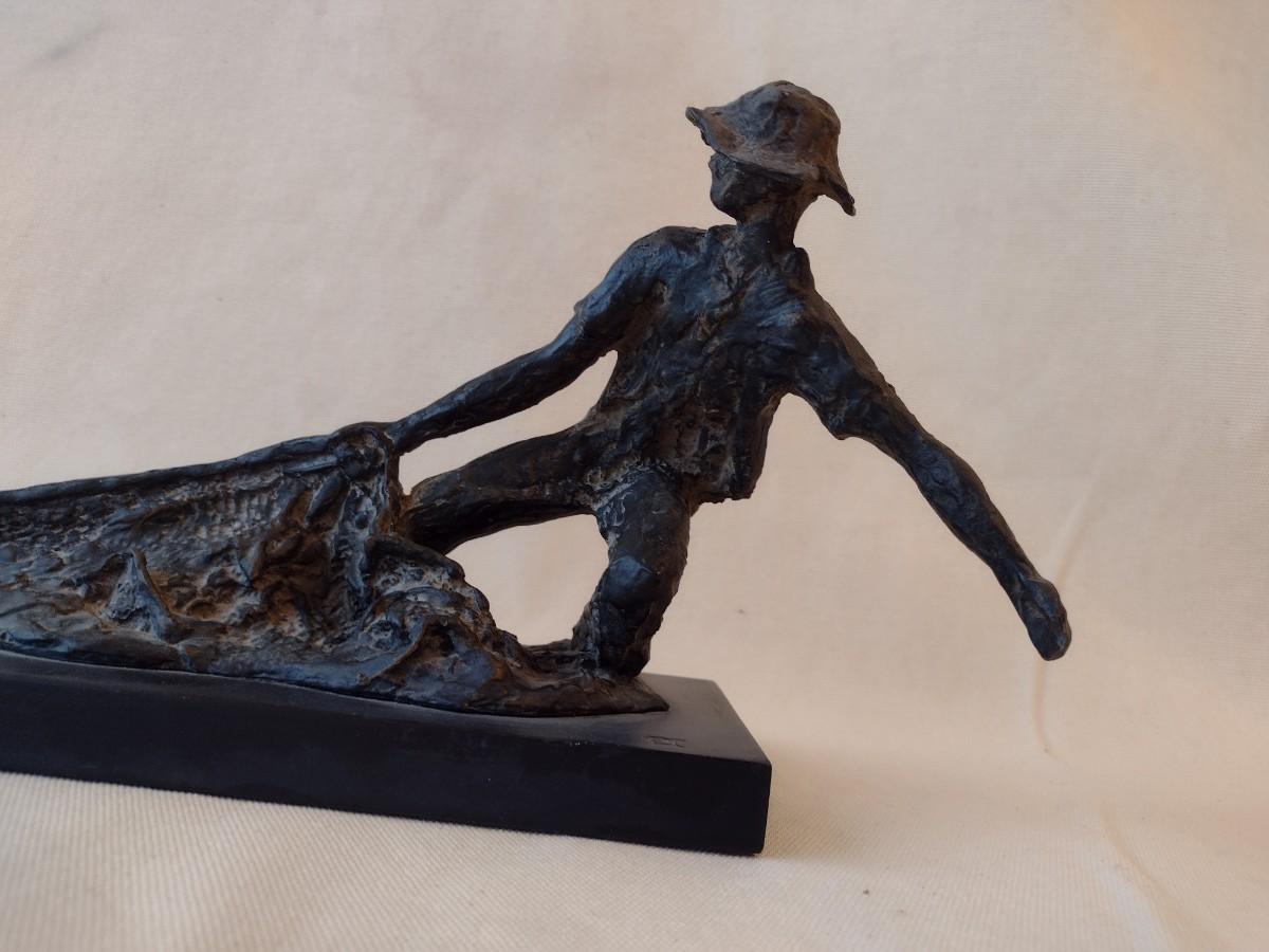 Wood Carved Fisherman with Cast Net Statuette on Base