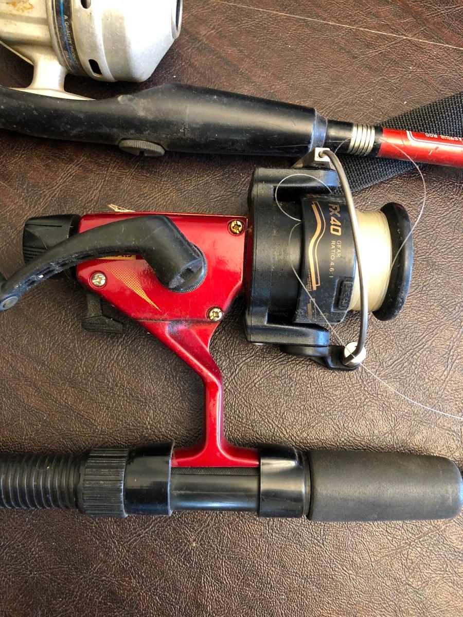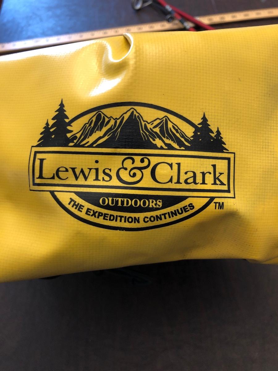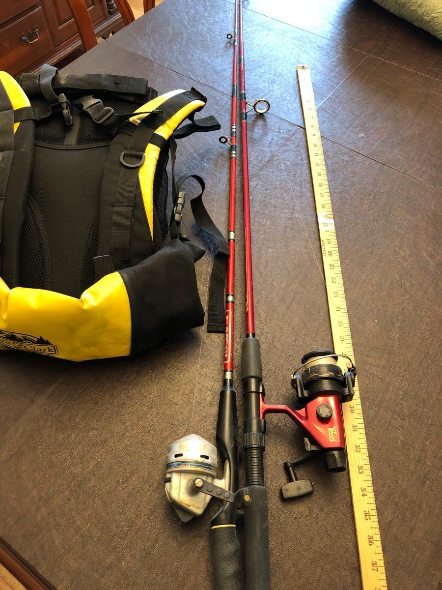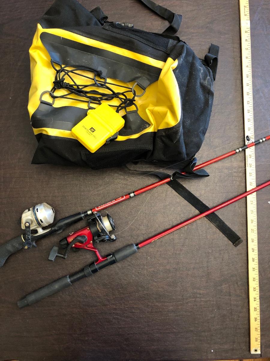 Louis & Clark Outdoors waterproof backpack and two rods and reels.
