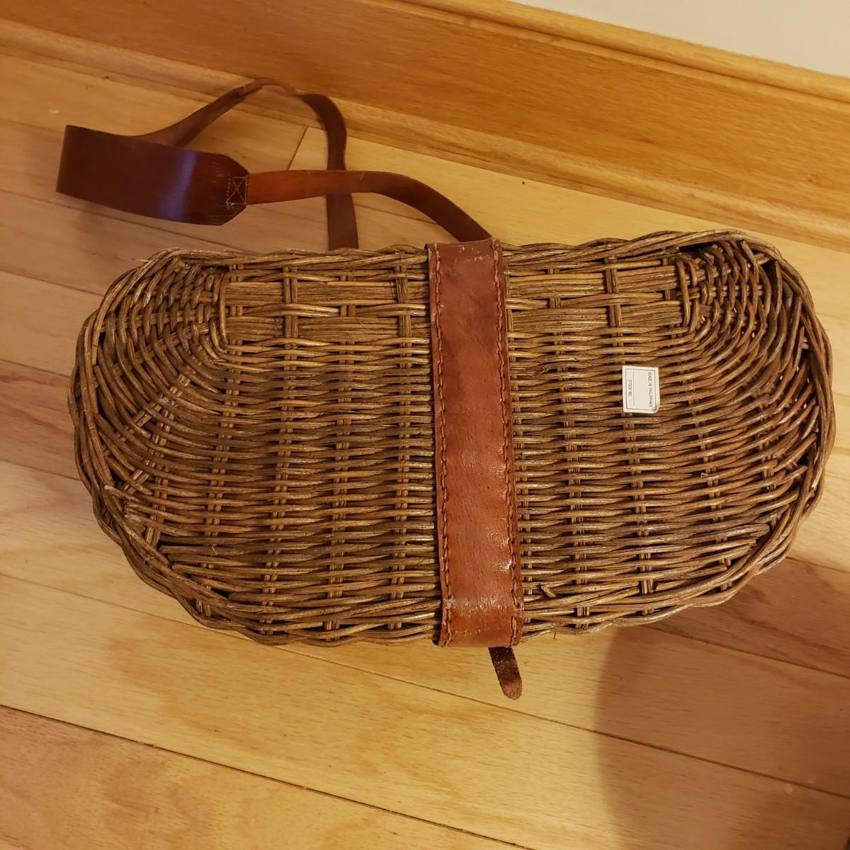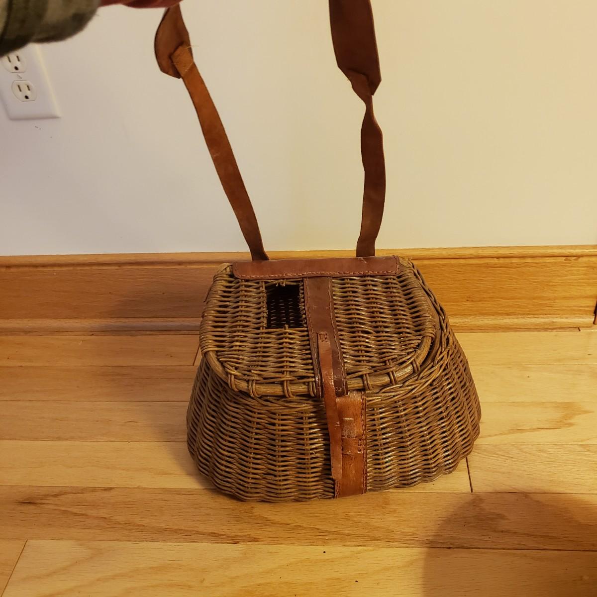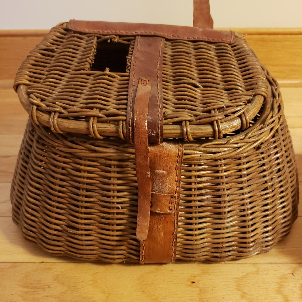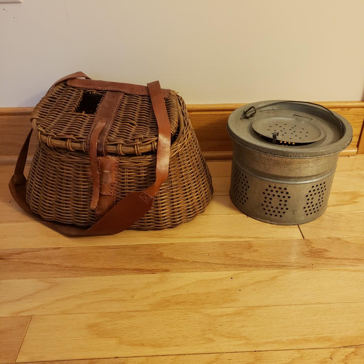This lot has a wicker fishing creel basket measuring 15" x 9" x 10" H. The strap measures 18"H. The basket trim, strap and latch are all made of leather. The galvanized minnow bait pail measures 10"x 7"H. The door opens at the top and the inside rim is lined with Styrofoam.