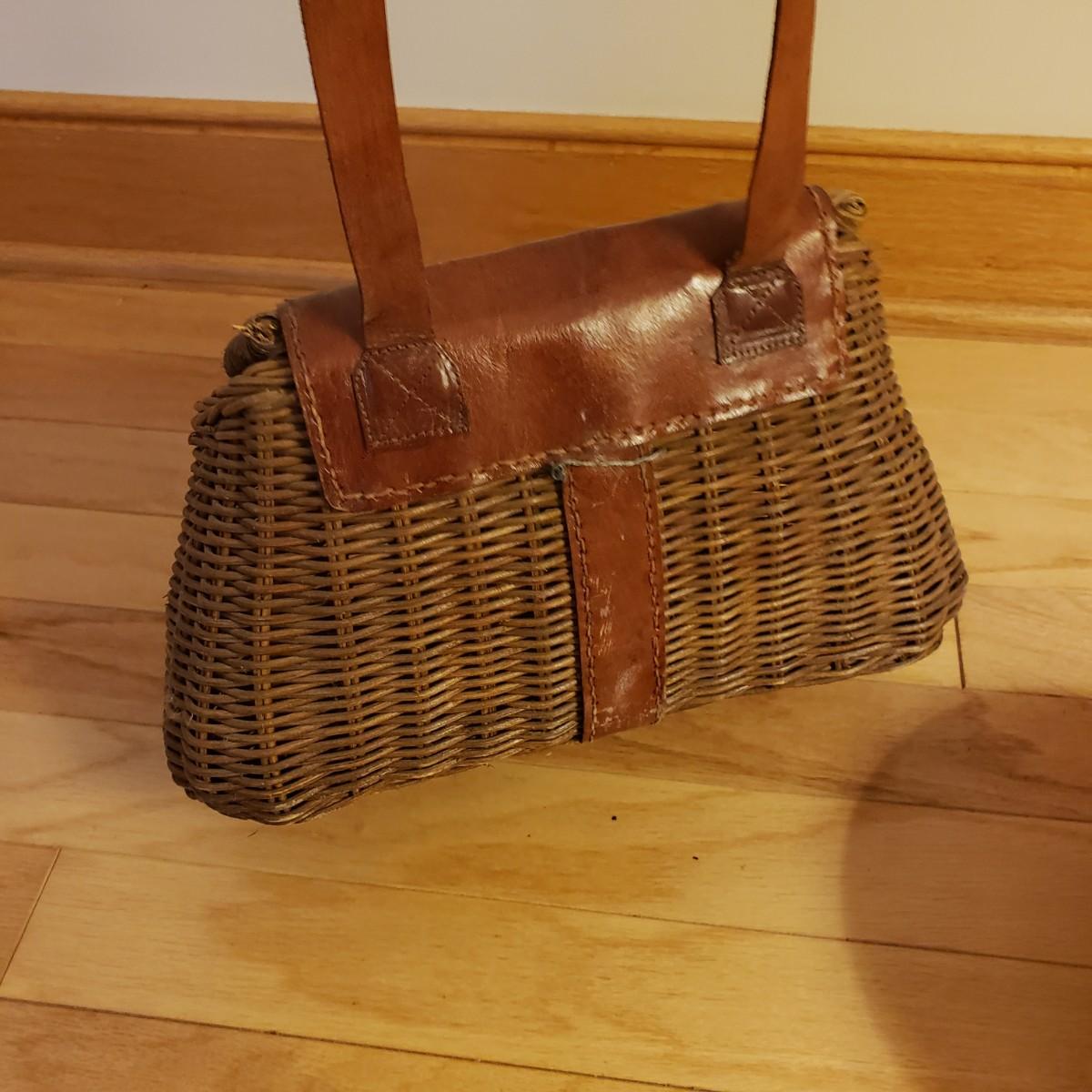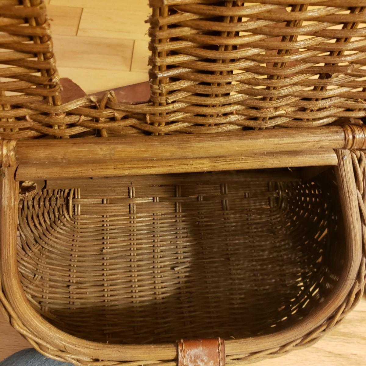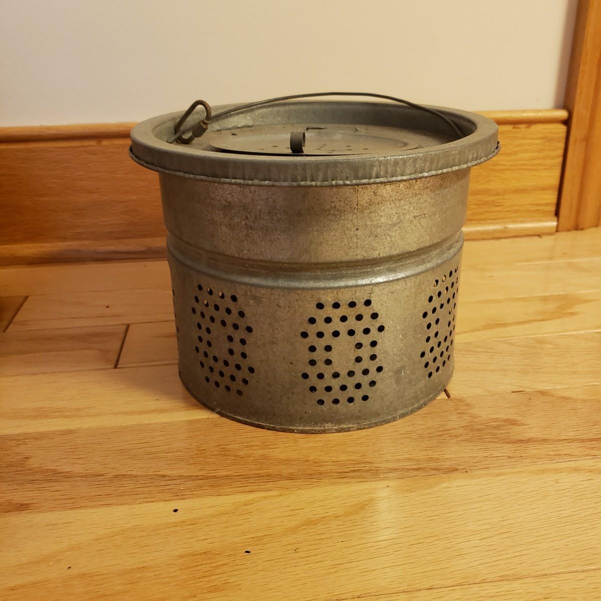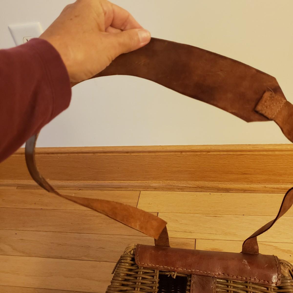 This lot has a wicker fishing creel basket measuring 15" x 9" x 10" H. The strap measures 18"H. The basket trim, strap and latch are all made of leather. The galvanized minnow bait pail measures 10"x 7"H. The door opens at the top and the inside rim is lined with Styrofoam.