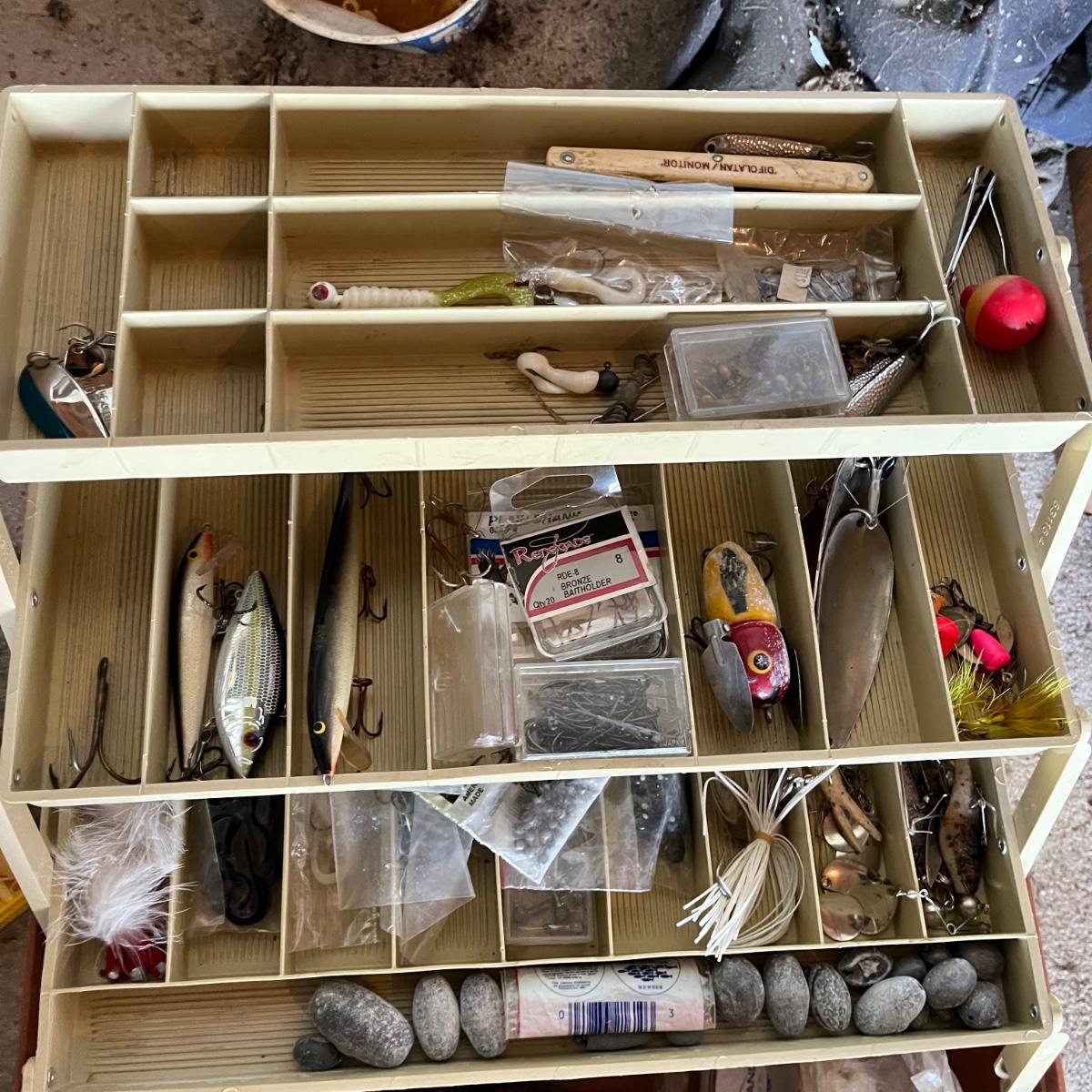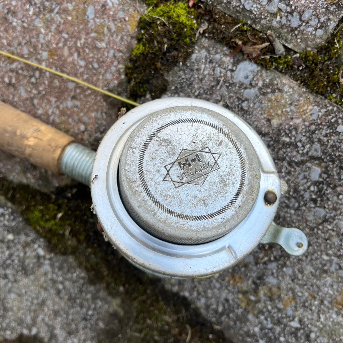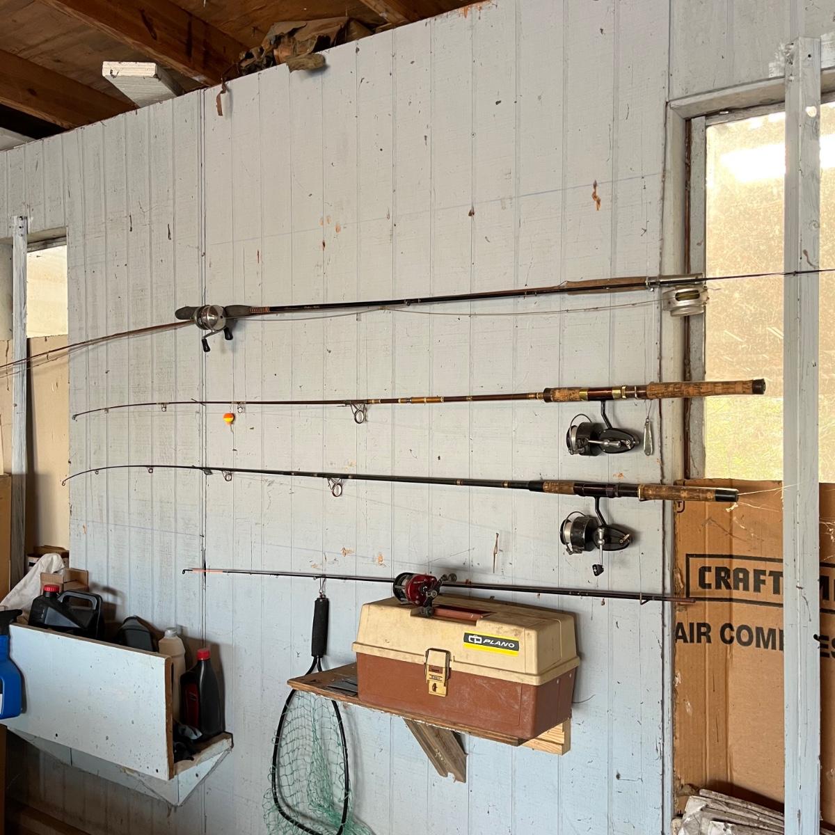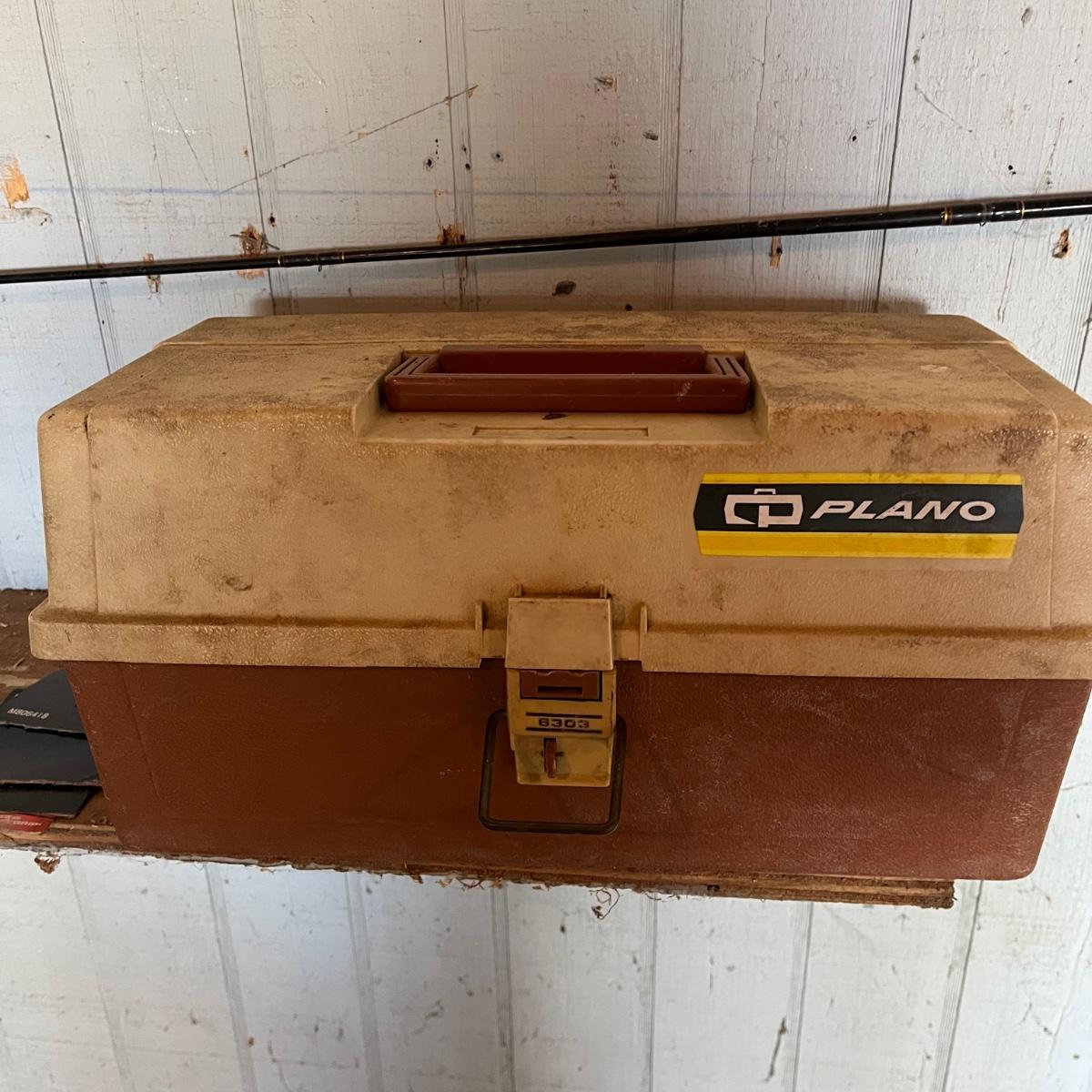 Lot includes Plano tackle box with contents, two fishing poles with Mitchell reels, a fly rod with H-1 Utica NY reel, Ambassador reel, net and more.