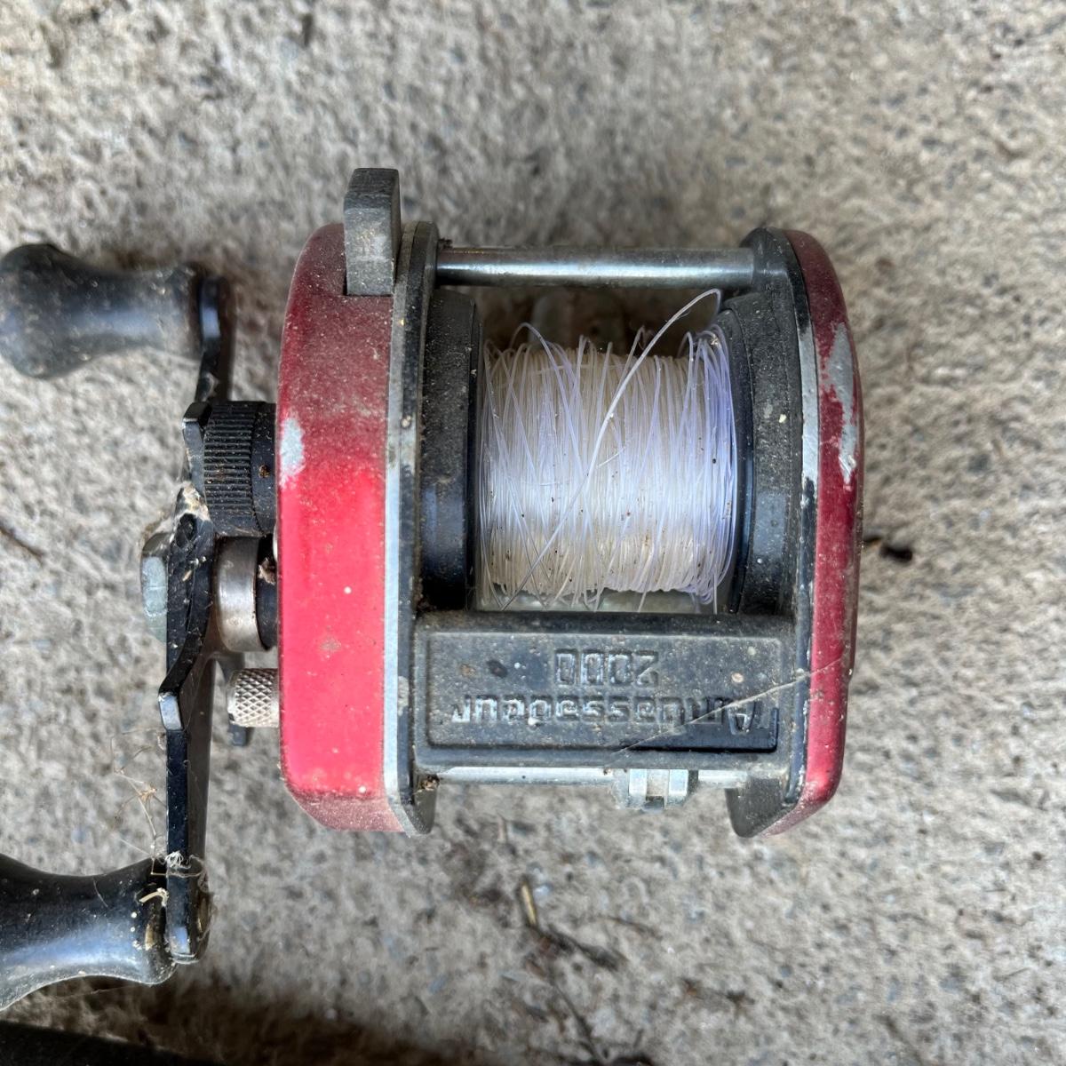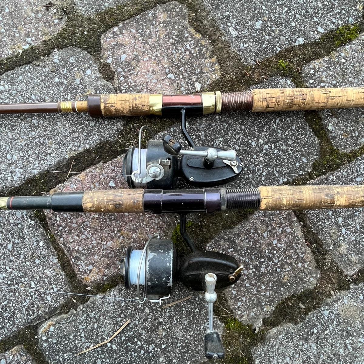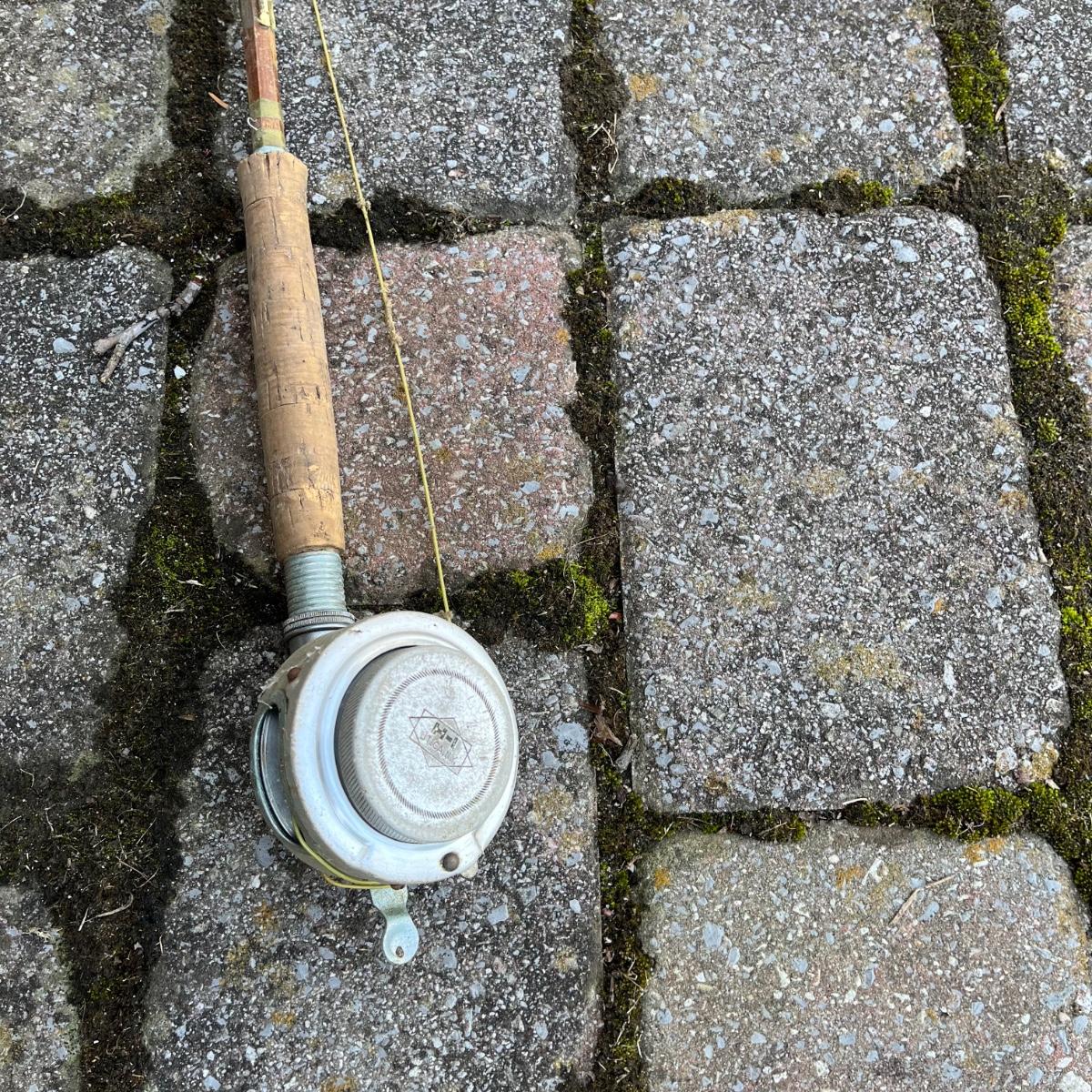 Lot includes Plano tackle box with contents, two fishing poles with Mitchell reels, a fly rod with H-1 Utica NY reel, Ambassador reel, net and more.