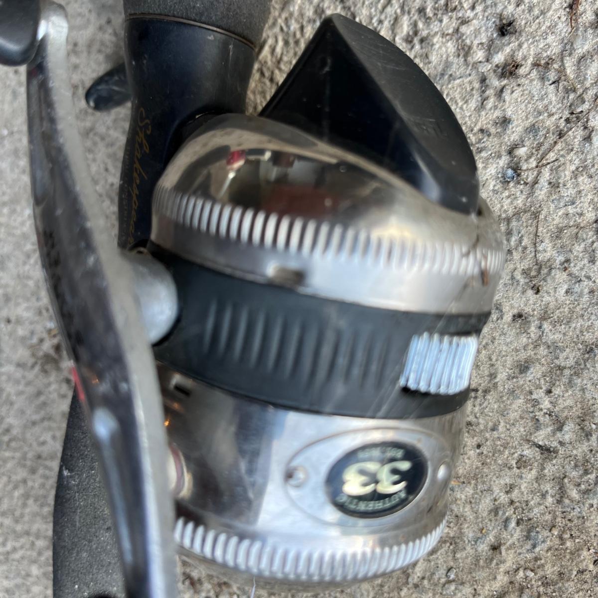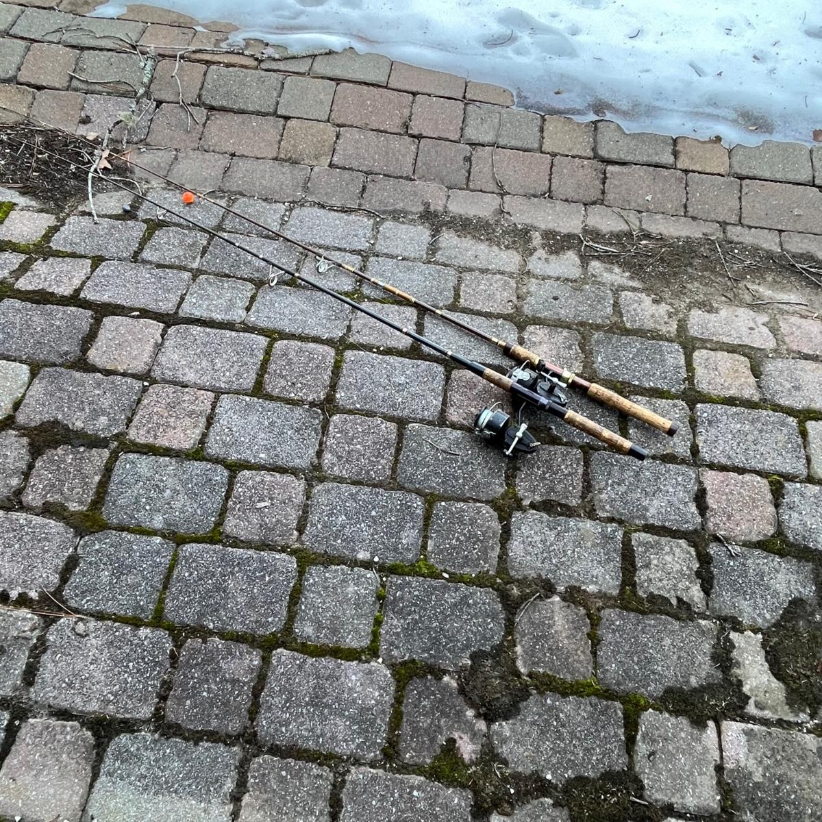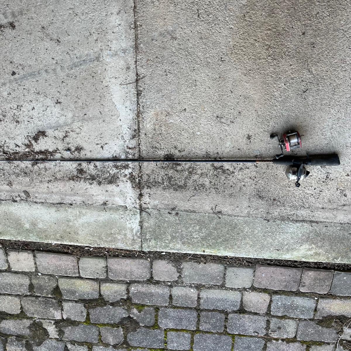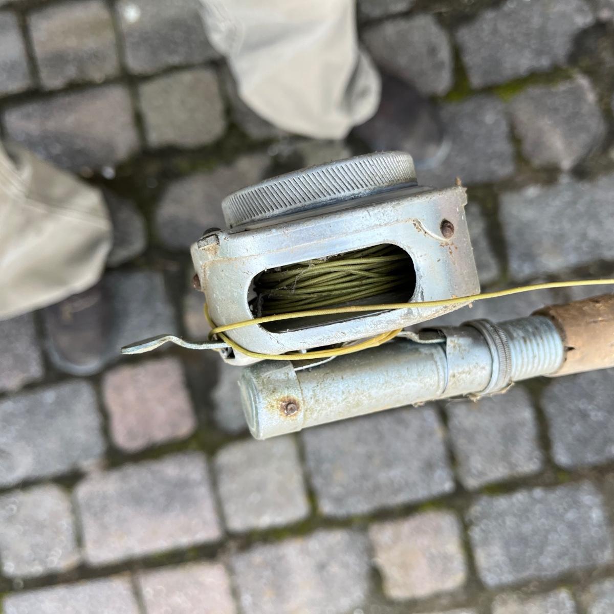 Lot includes Plano tackle box with contents, two fishing poles with Mitchell reels, a fly rod with H-1 Utica NY reel, Ambassador reel, net and more.