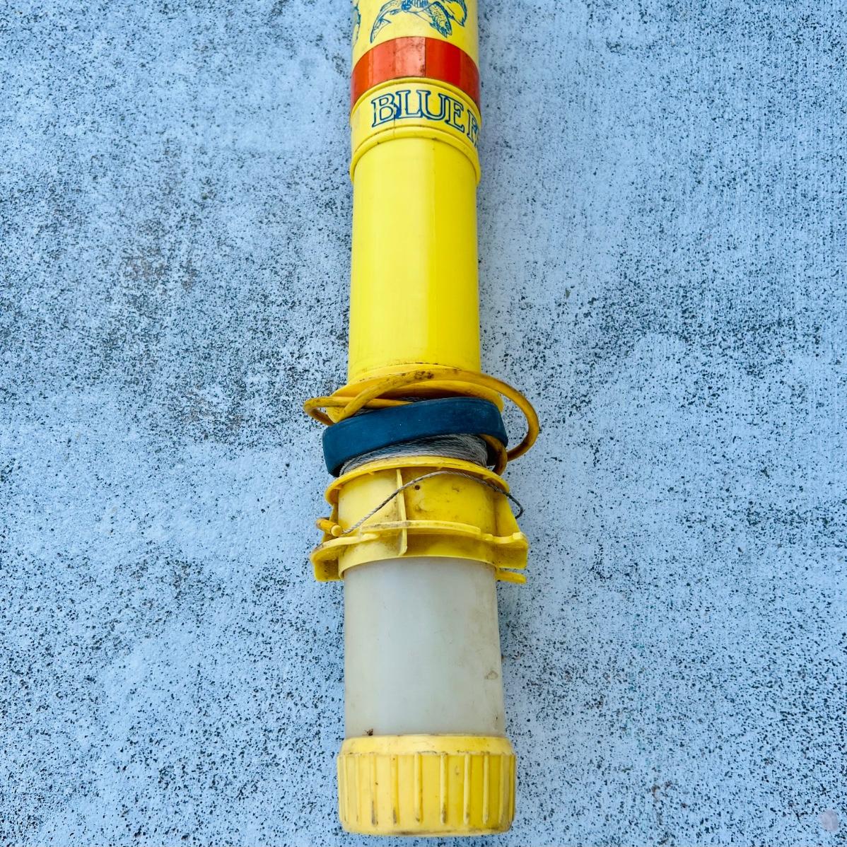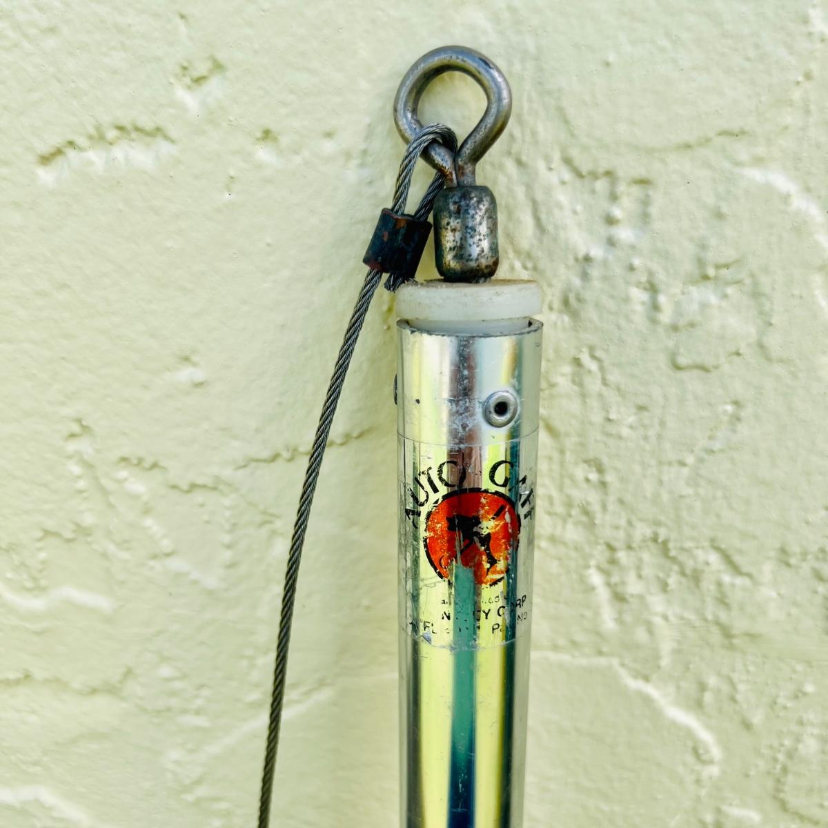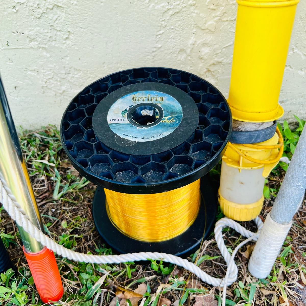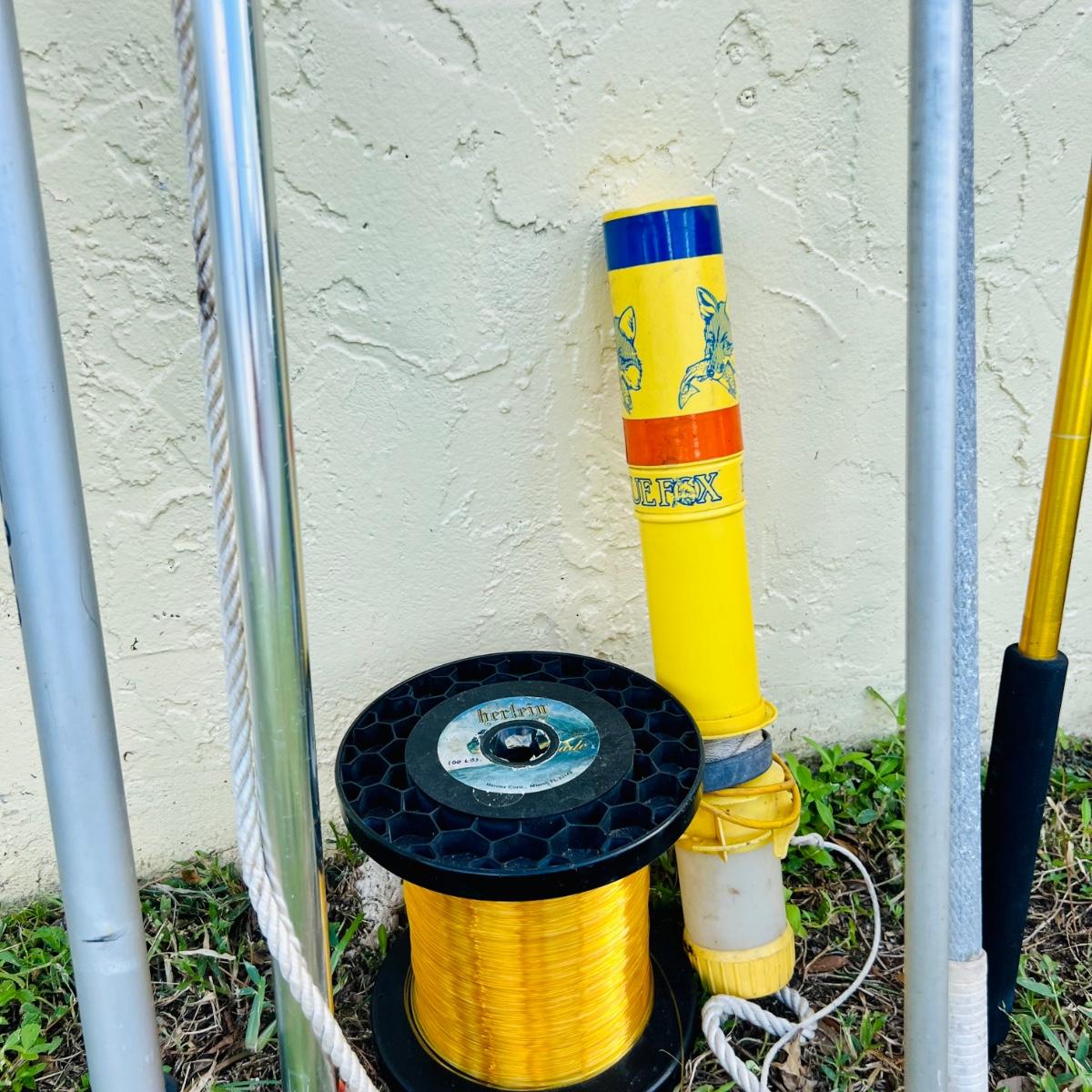 Lot includes two gaffs, gaff poles, fishing line and a Blue Fox . Tallest gaff meas. 61” and is in good condition.