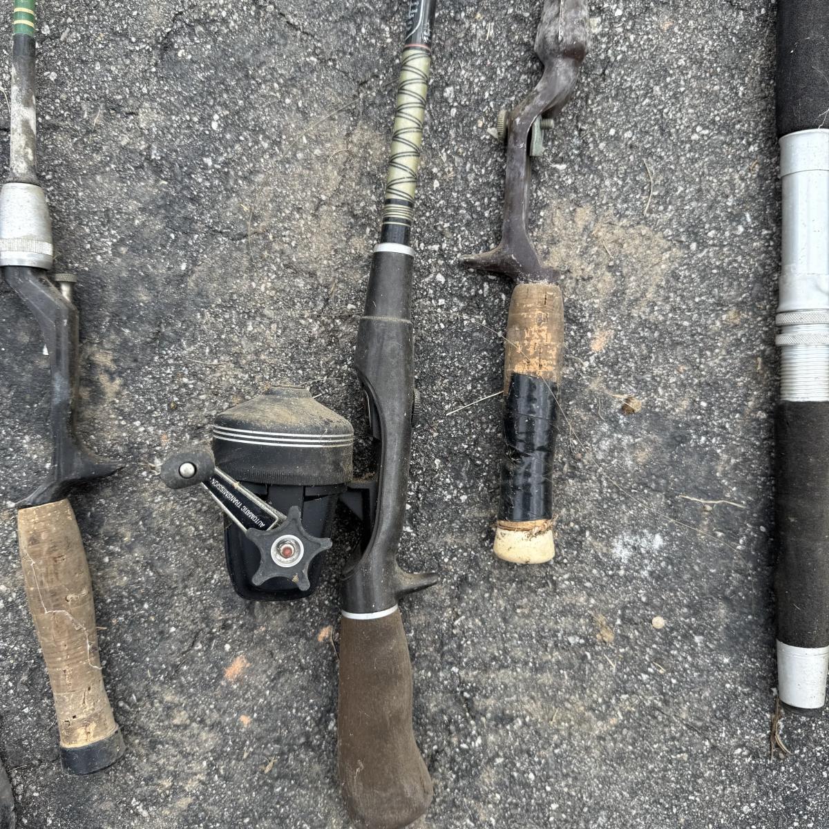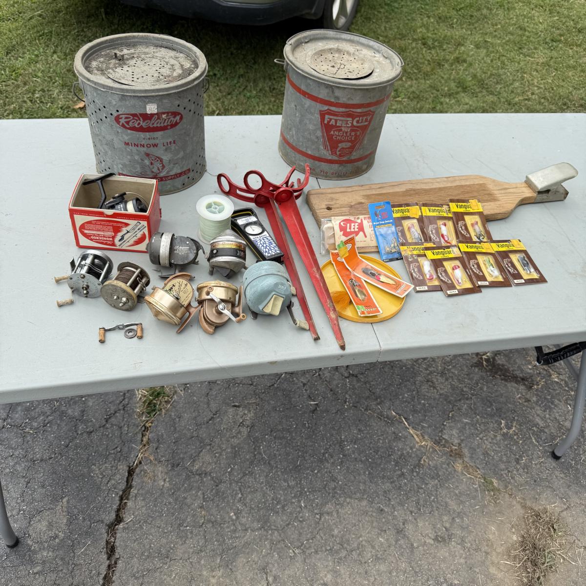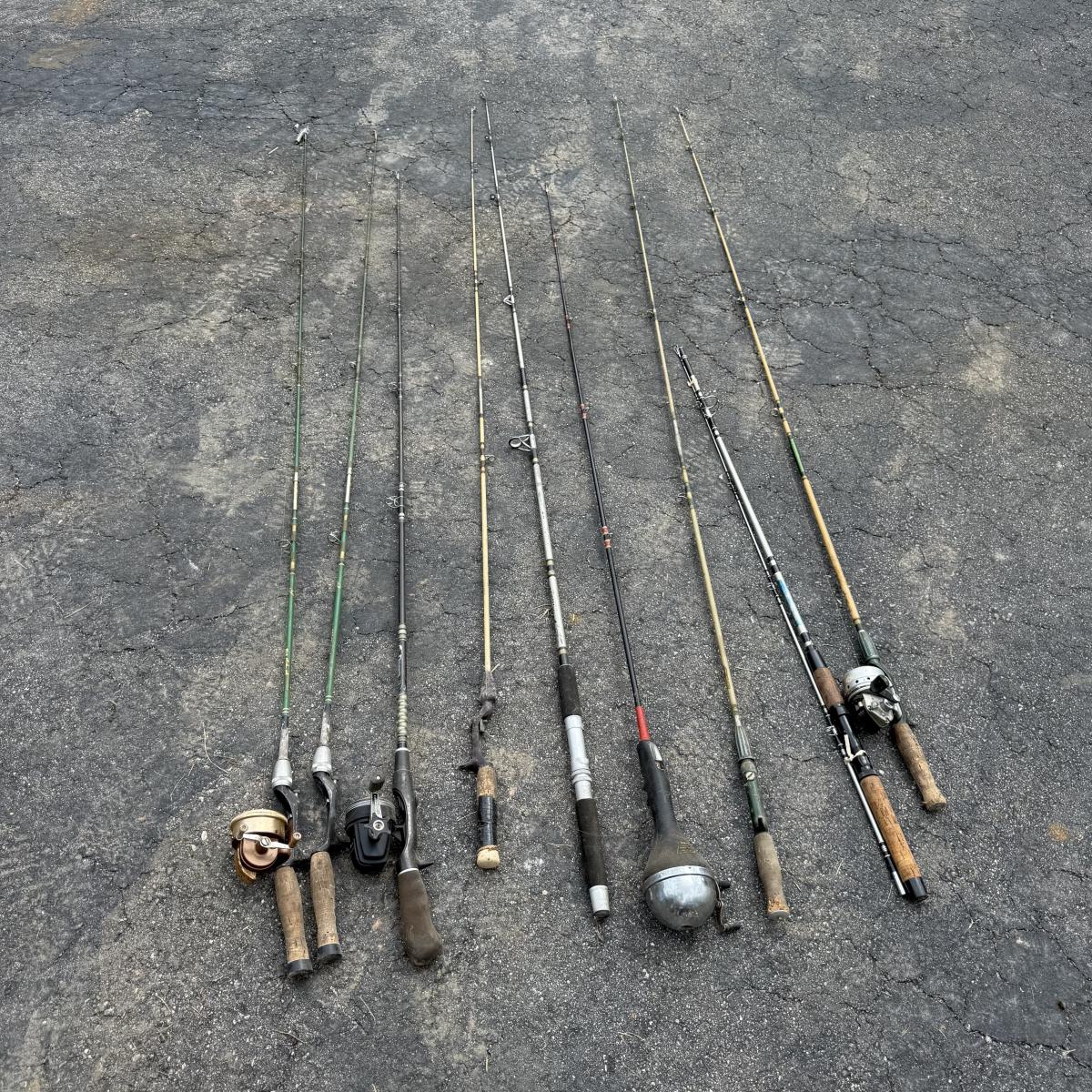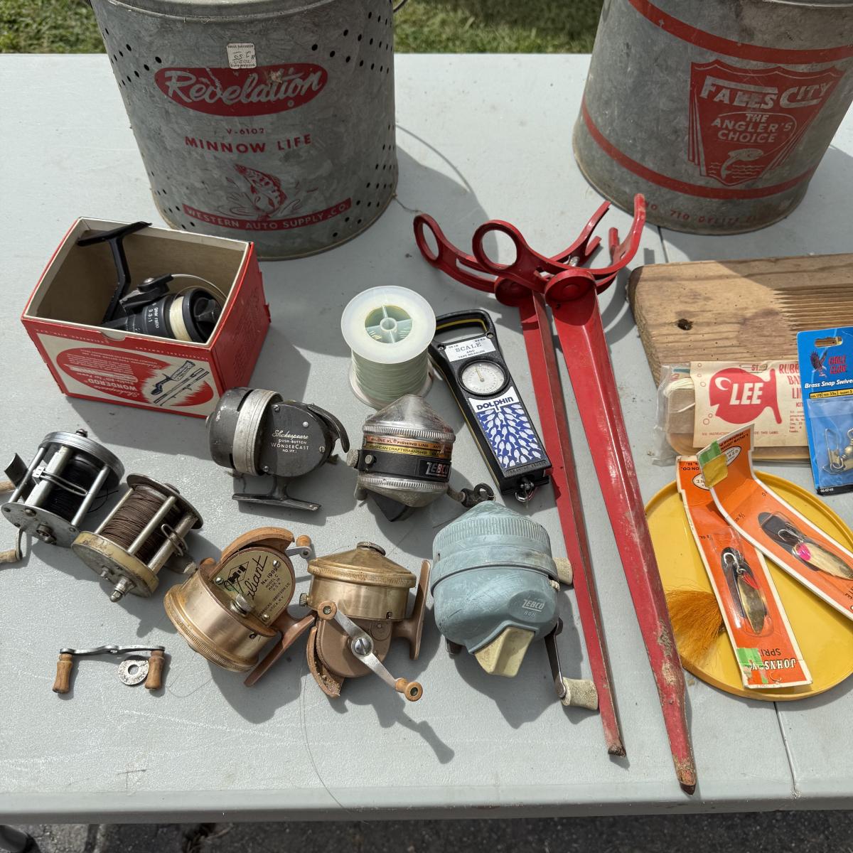 This lot contains all sort of fishing gear!! Included are two minnow buckets, seven vanguard lures as well as a few more, two metal rod holders, a fish scale, seven reels and nine fishing rods. See pictures for full inventory and details on rods and reels. Local pick up only.