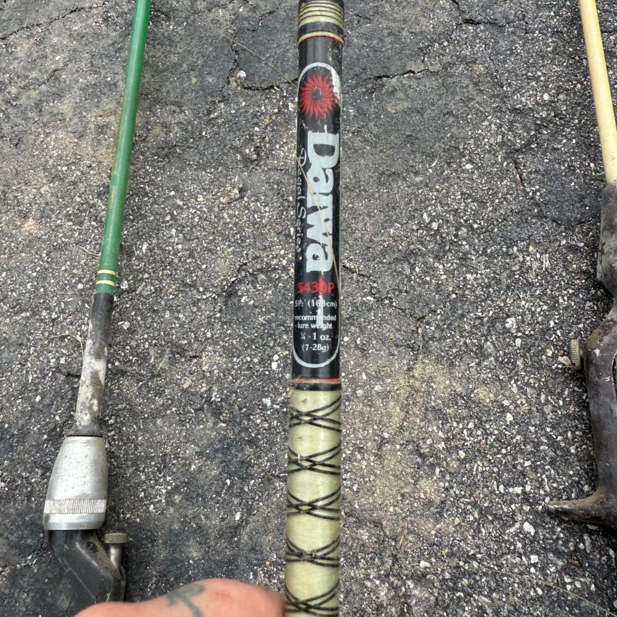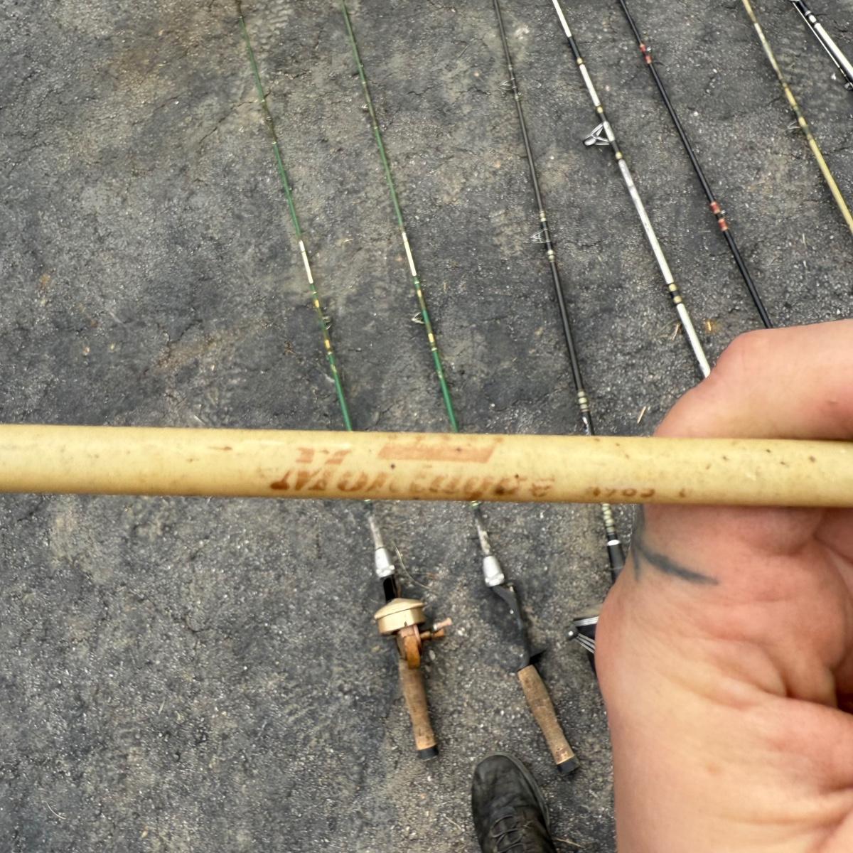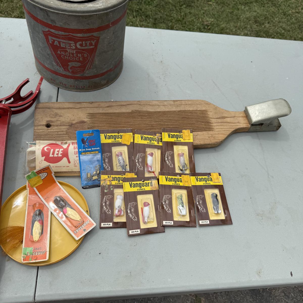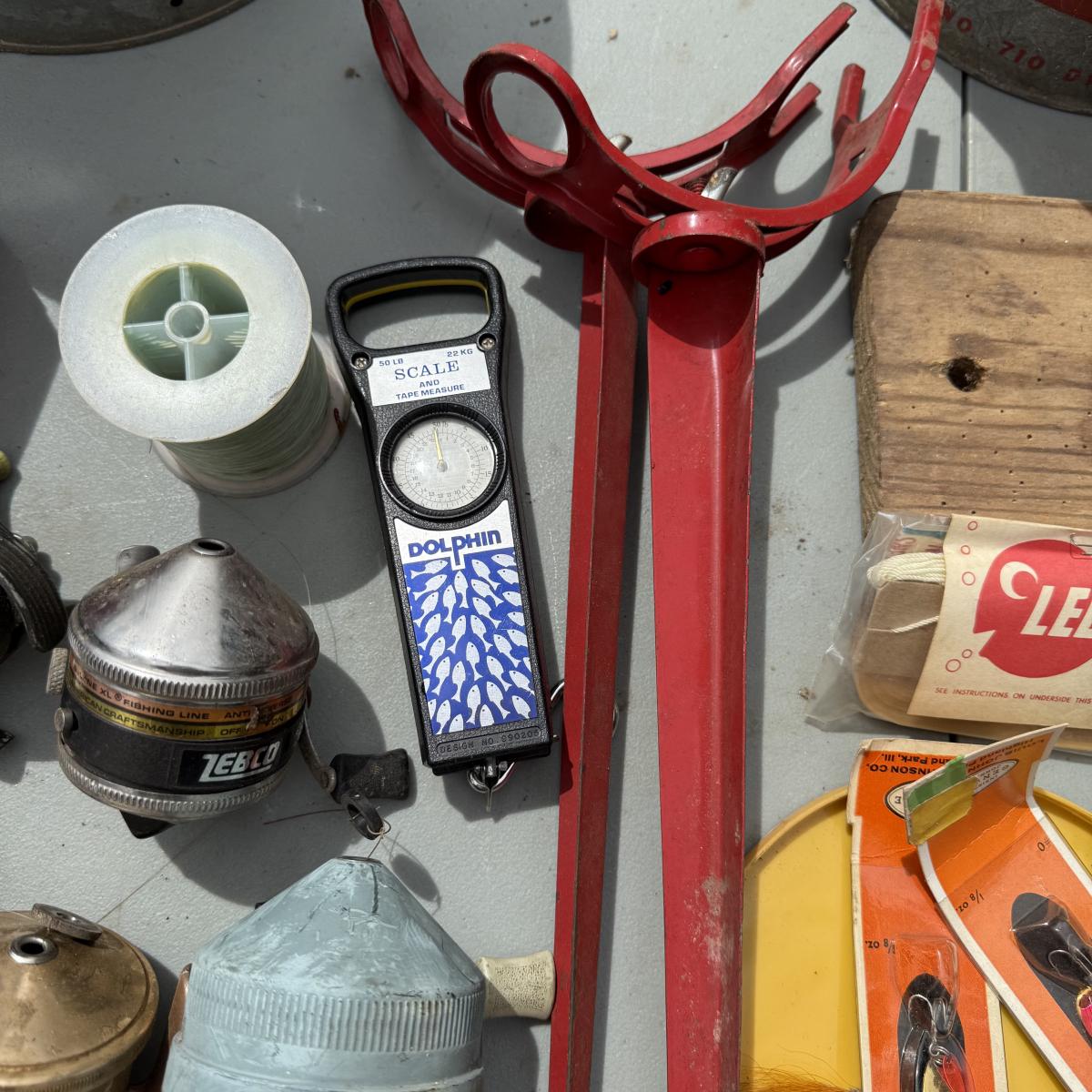This lot contains all sort of fishing gear!! Included are two minnow buckets, seven vanguard lures as well as a few more, two metal rod holders, a fish scale, seven reels and nine fishing rods. See pictures for full inventory and details on rods and reels. Local pick up only.
