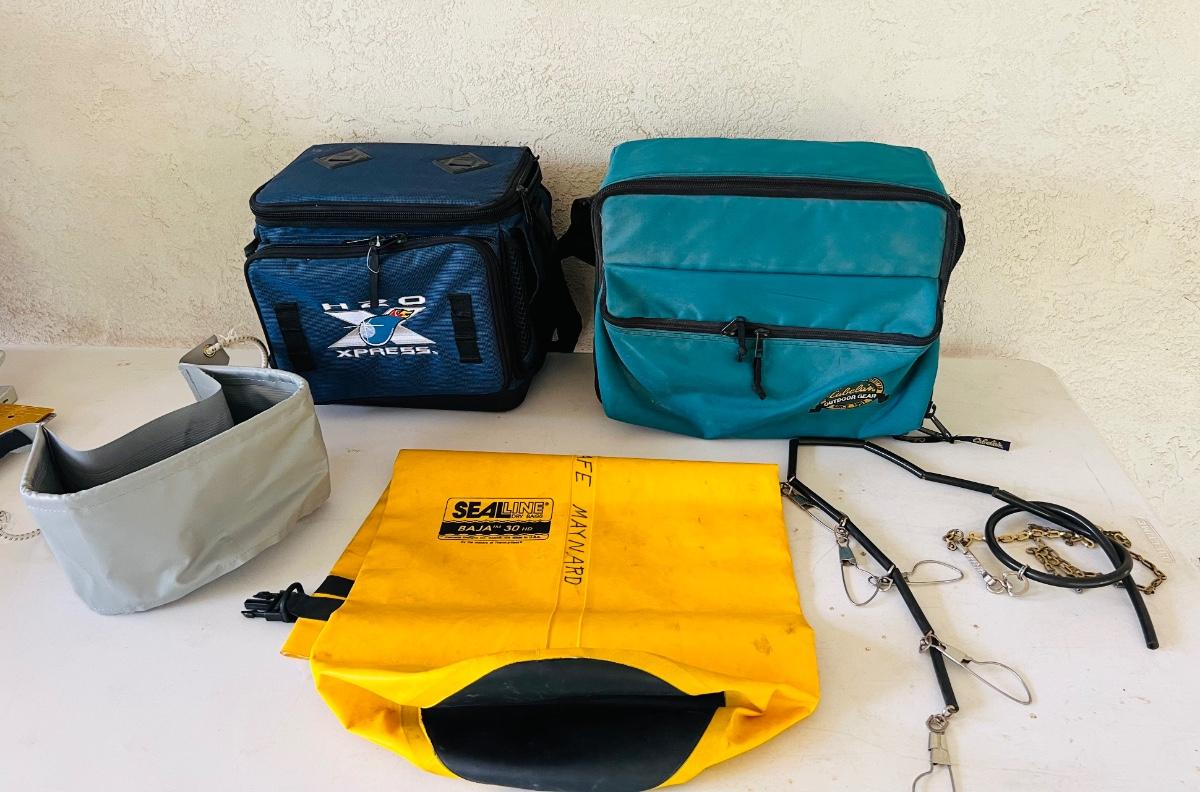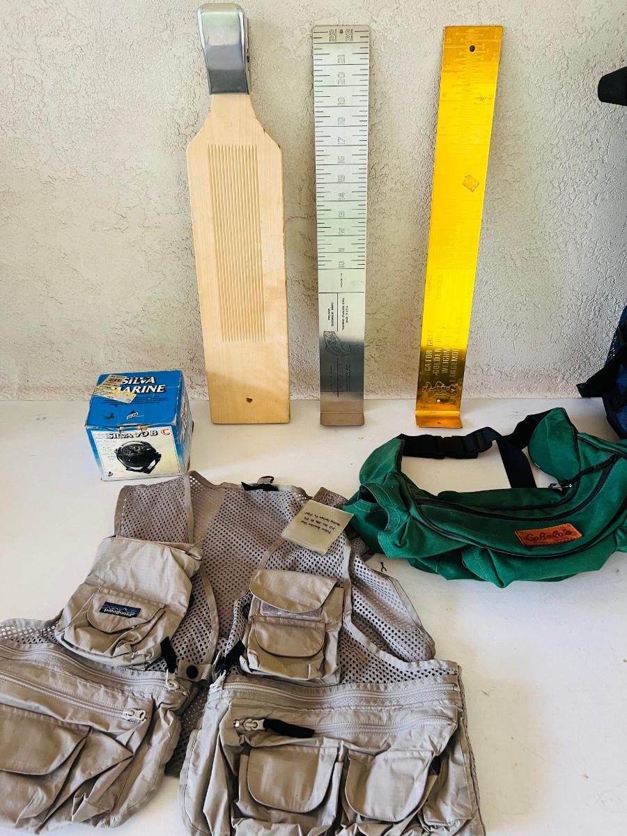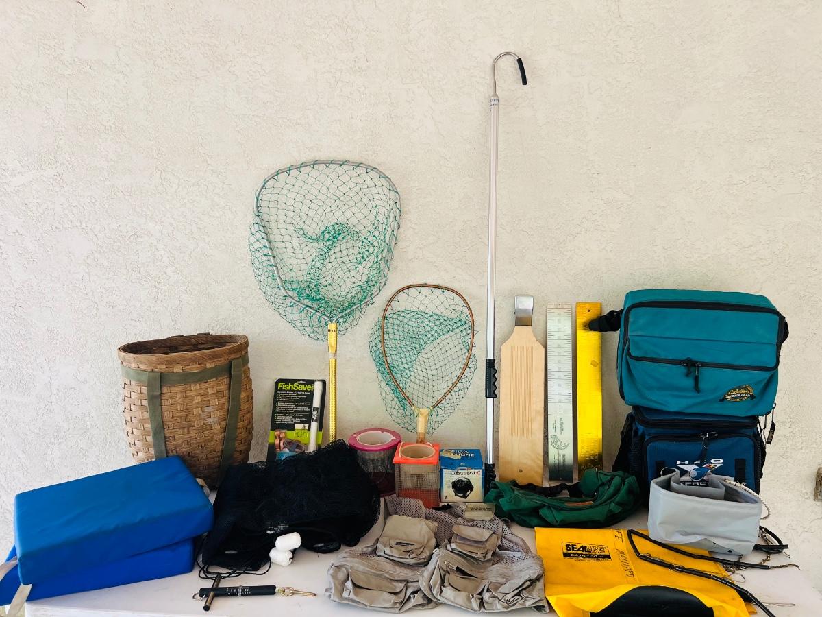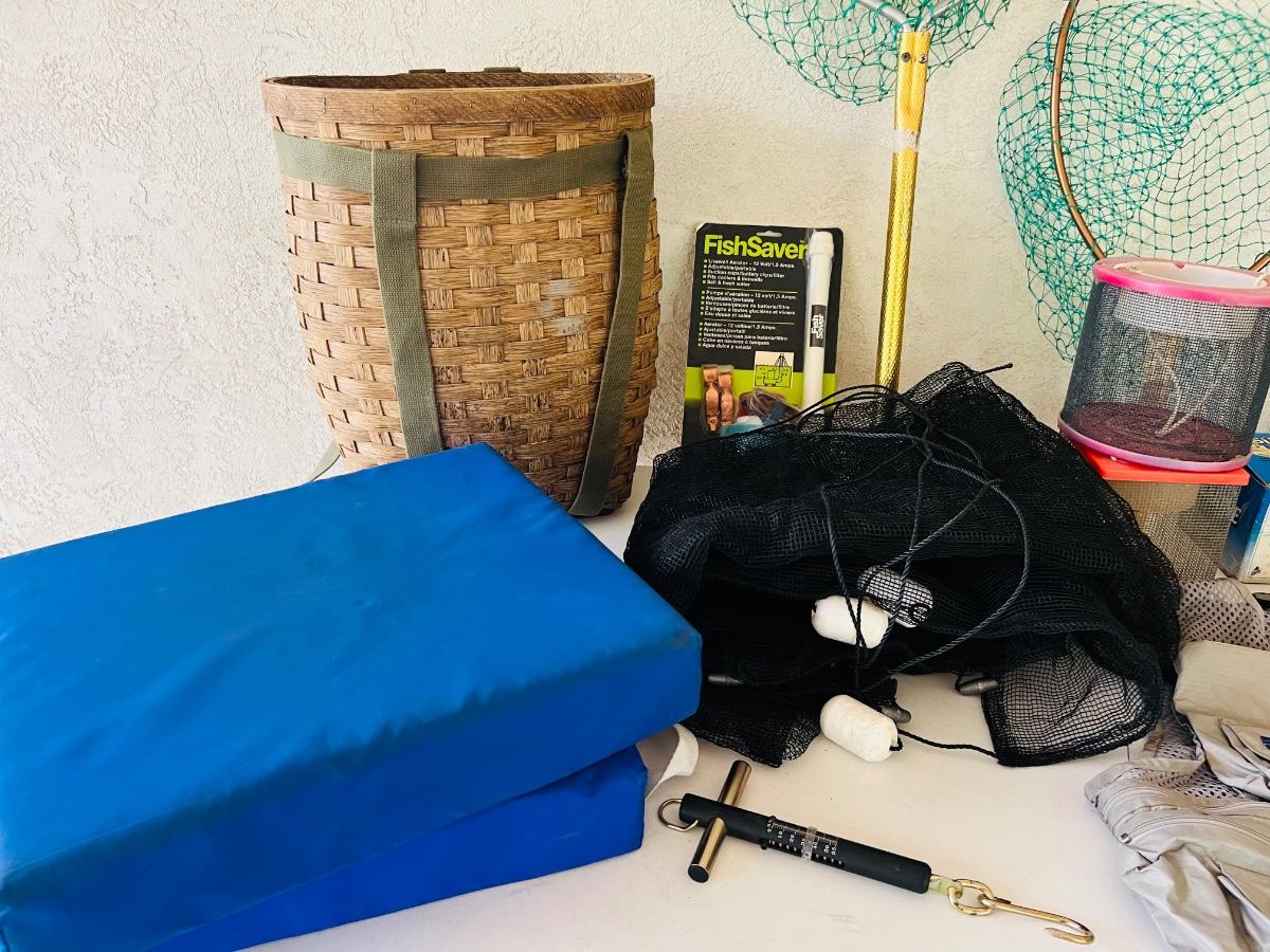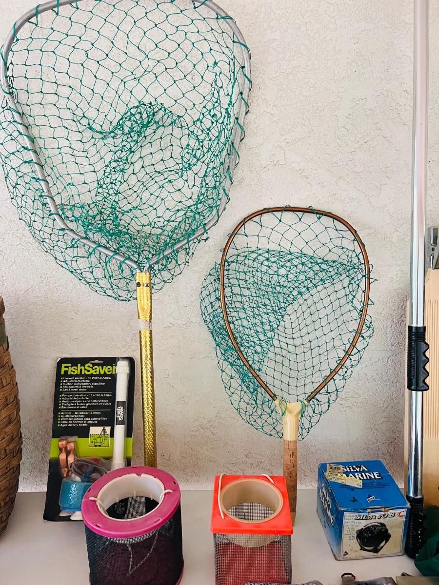 Assortment of fishing gear and items such as nets, tackle boxes, and so much more. Everything pictured on the table is included. (Table not included)