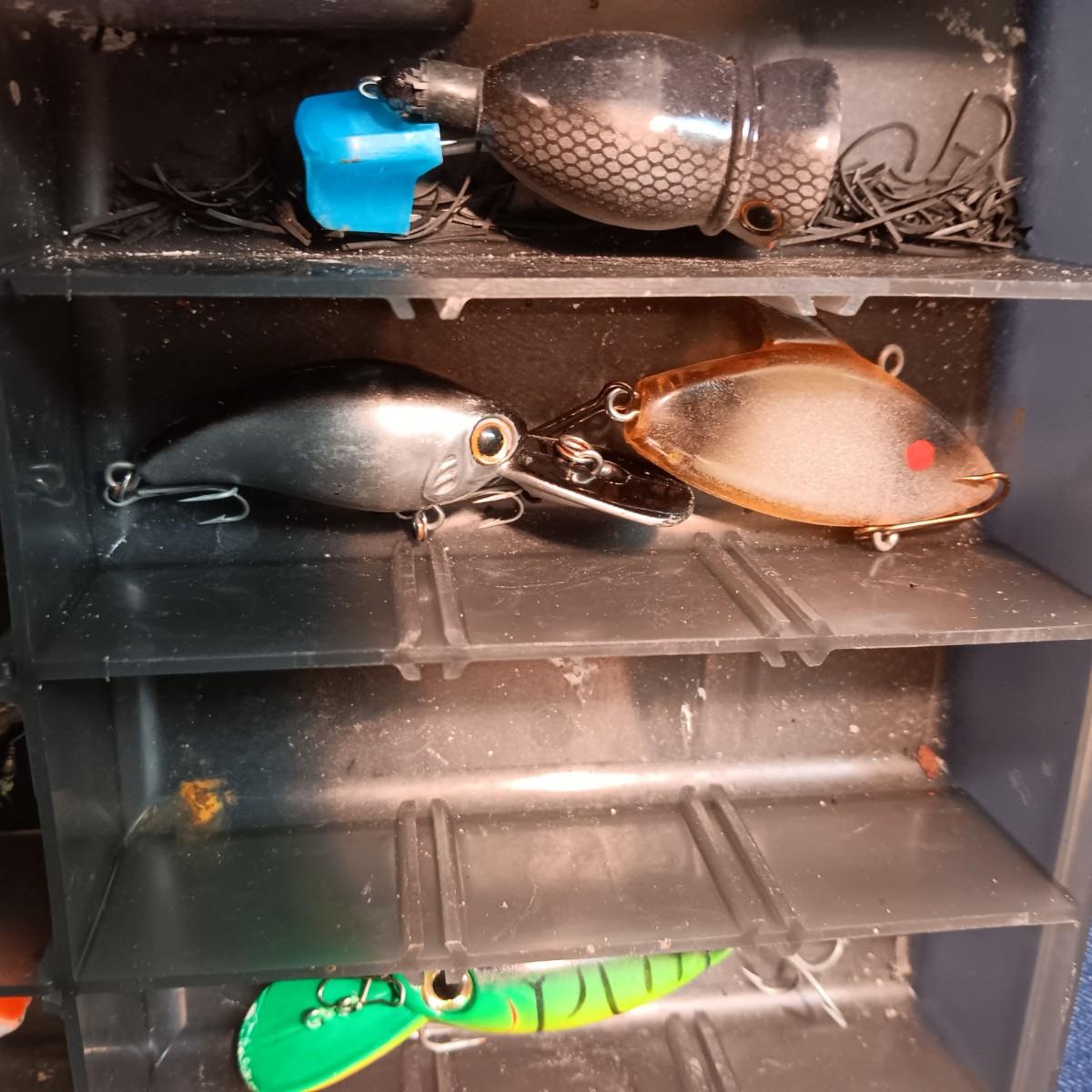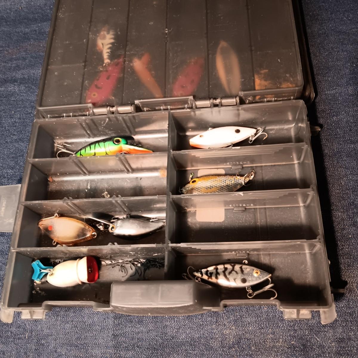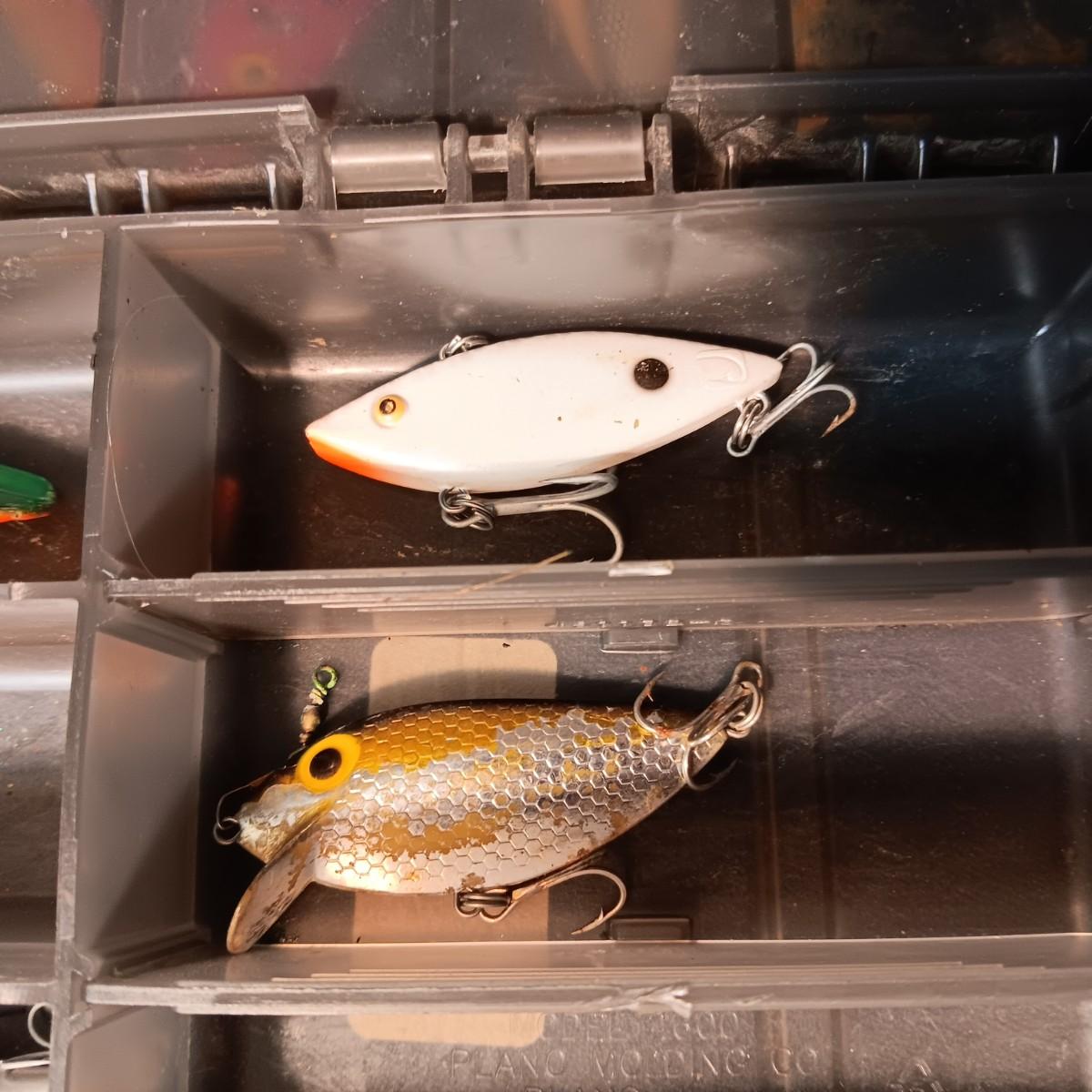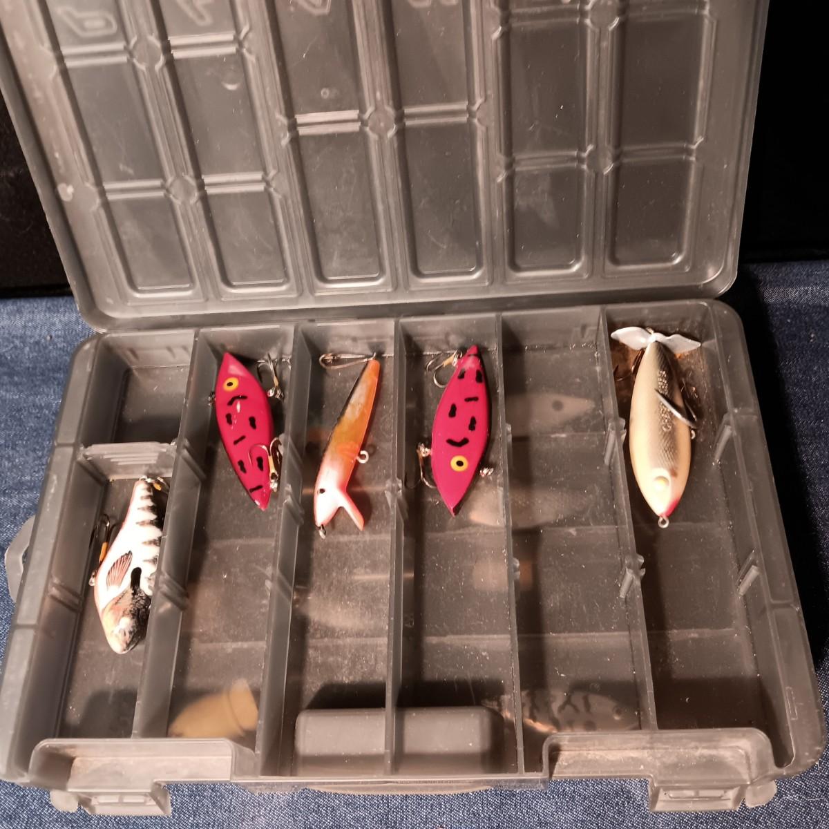 FISHING LURES AND A DOUBLE COMPARTMENT PLANO ORGANIZER