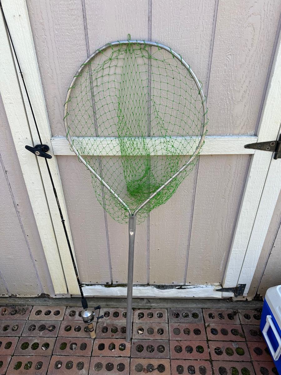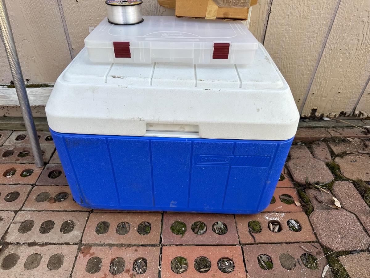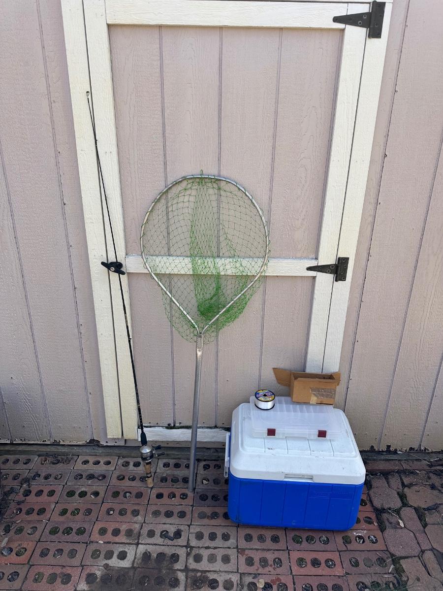 FISHING NET AND WEIGHTED HOOKS, COOLER & ROD/REEL